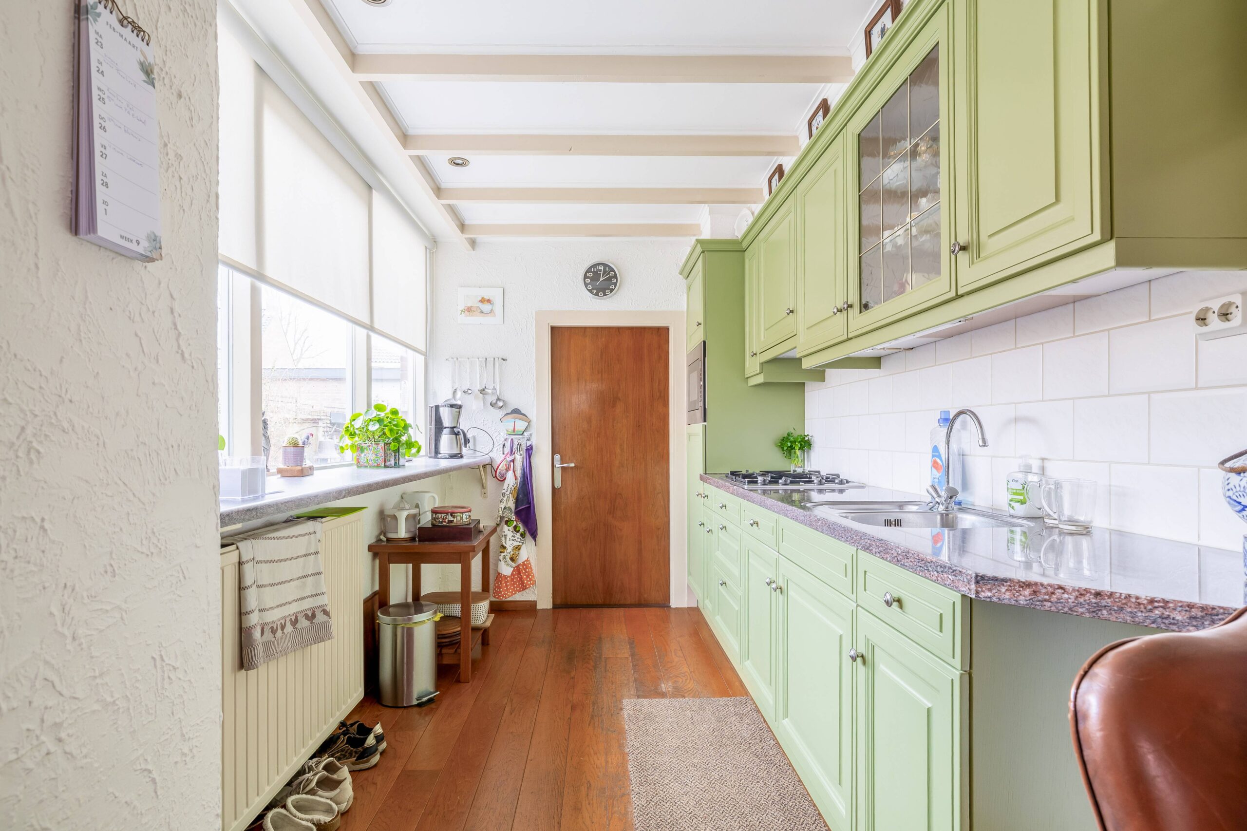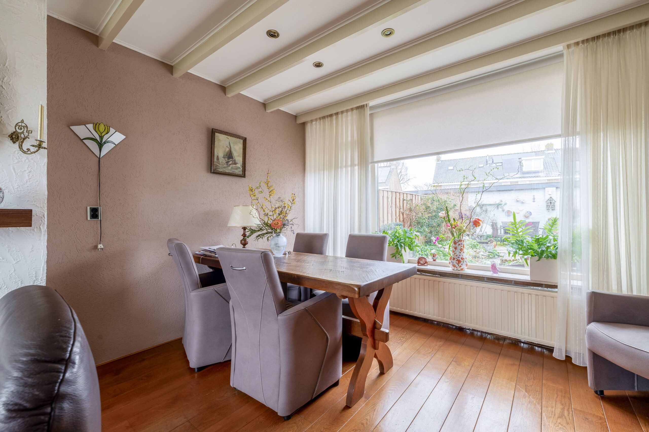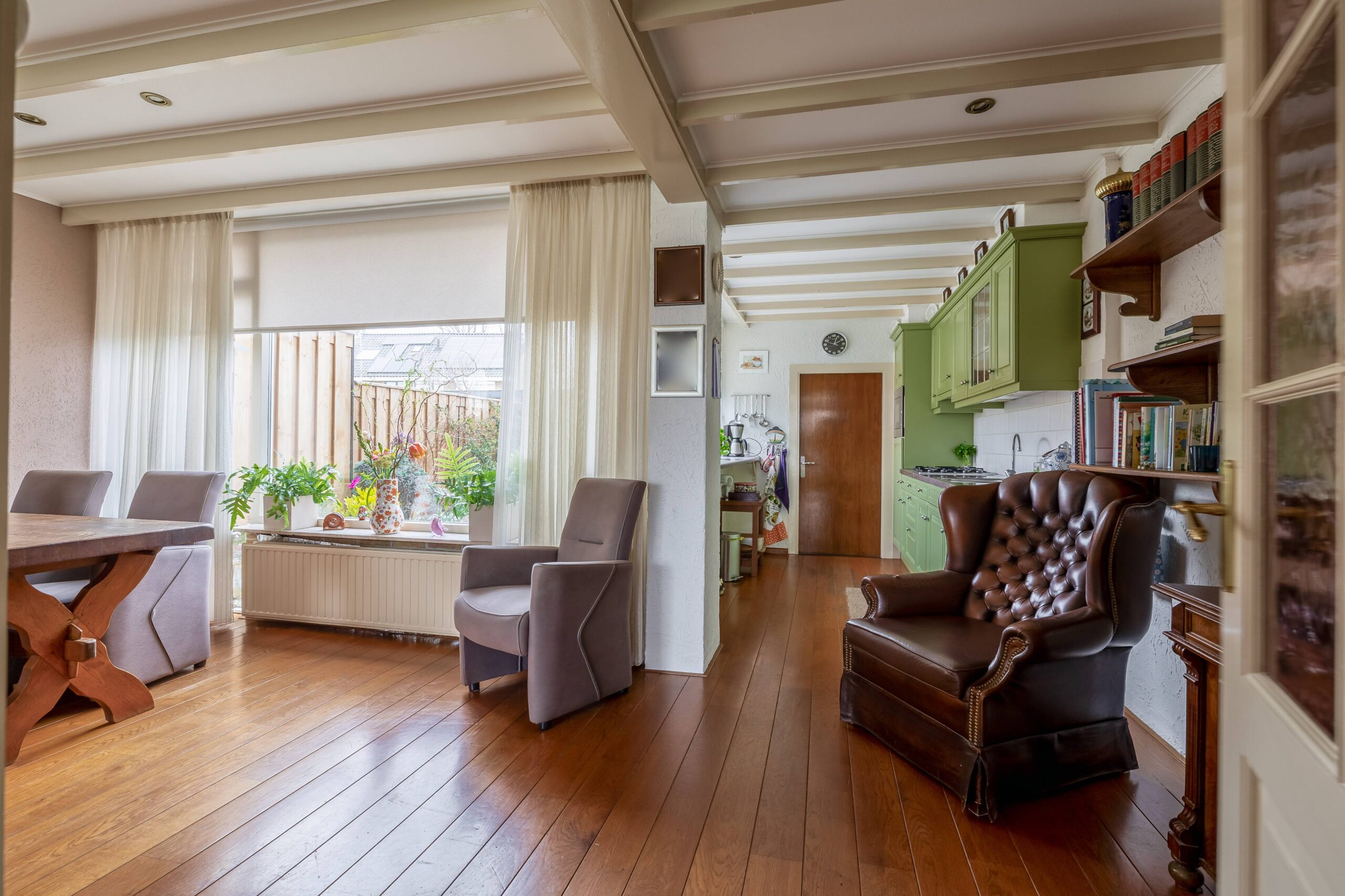 Op de vloer een mooie houten vloer en de woning heeft nog een balkenplafond en een schouw.