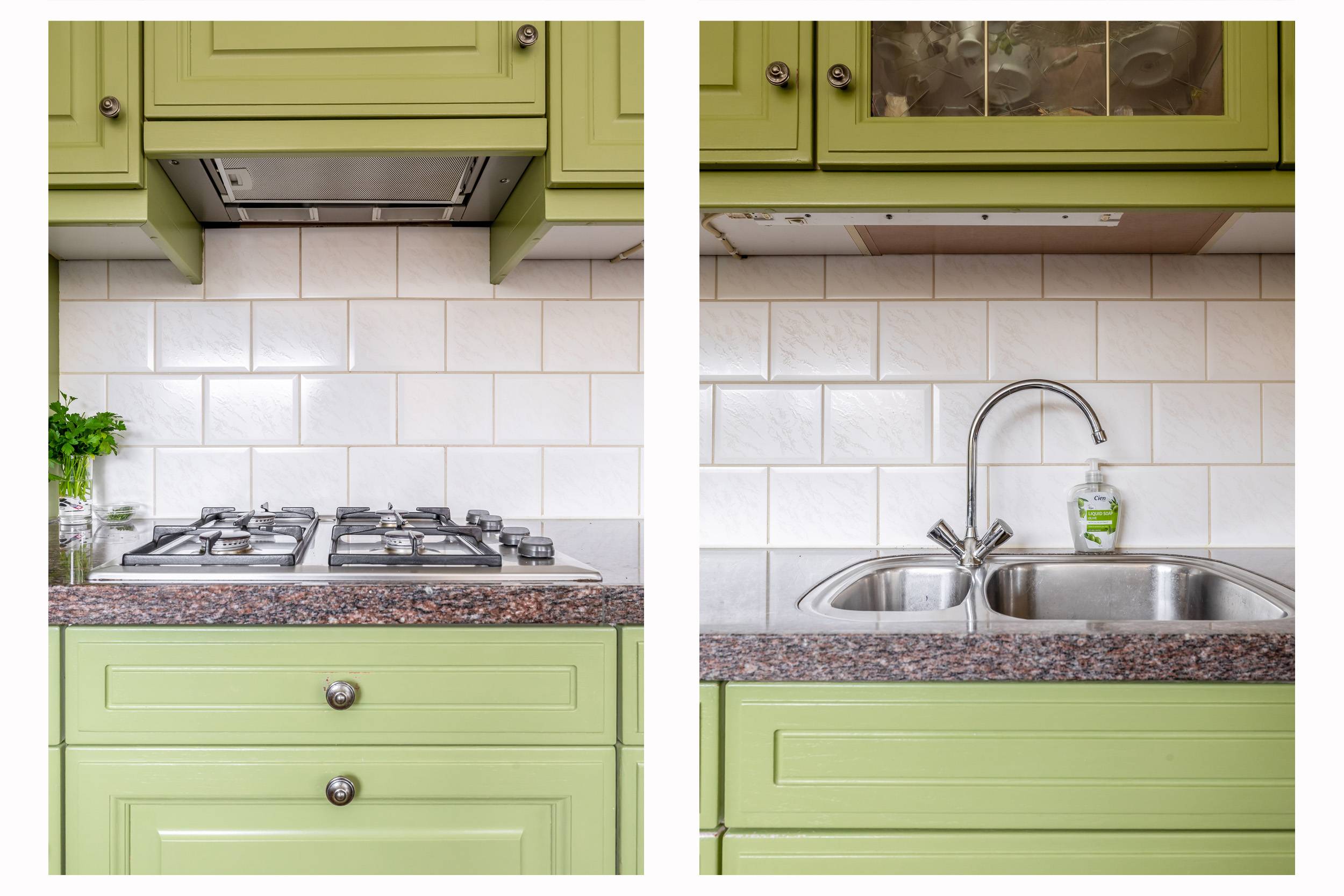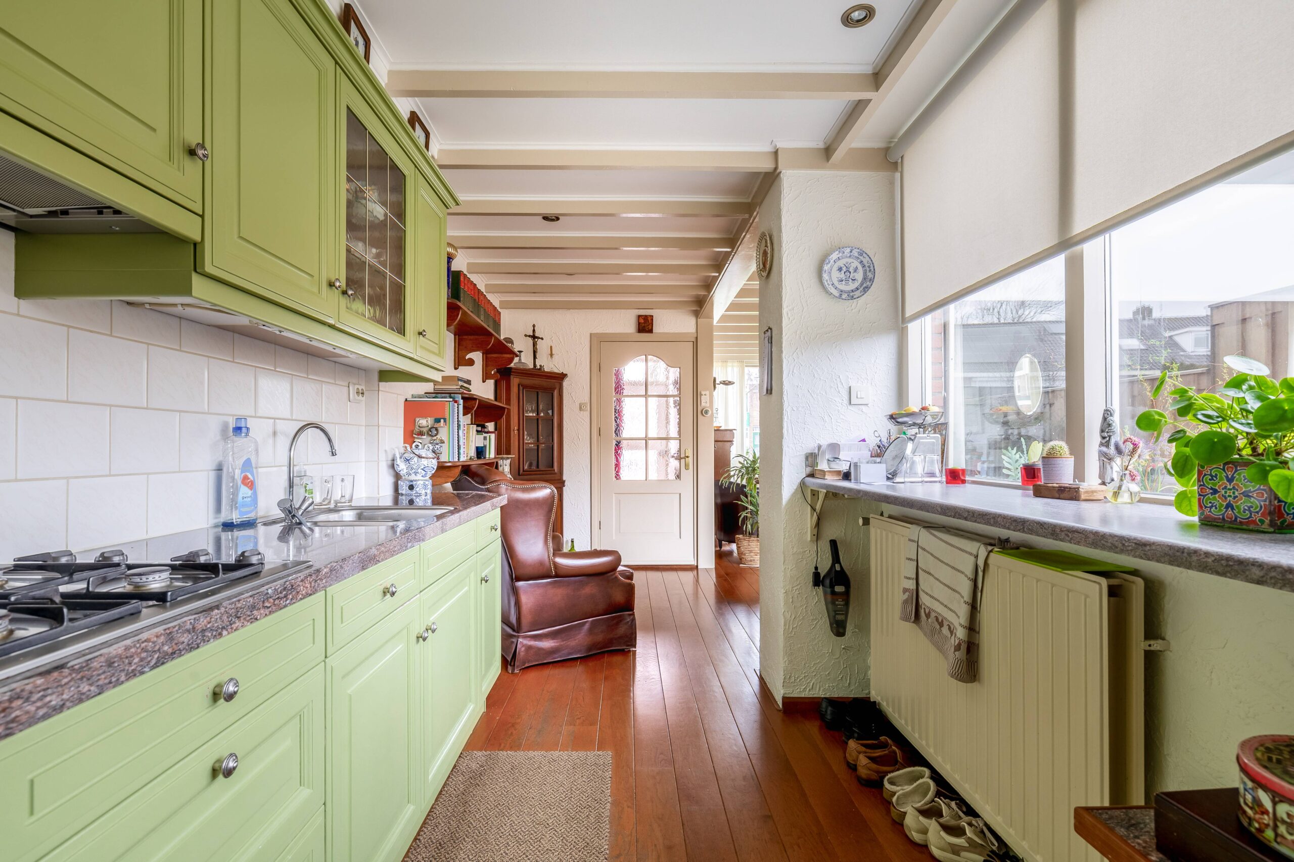 De aanbouw heeft een betonnen vloer, de overige vloeren zijn van hout. De keuken zelf is geverfd en heeft een natuurstenen aanrechtblad, een afzuigkap, een gaskookplaat, een combimagnetron en een koelkast. Aansluitend de bijkeuken met de opstelling van het witgoed en de CV ketel (’15).