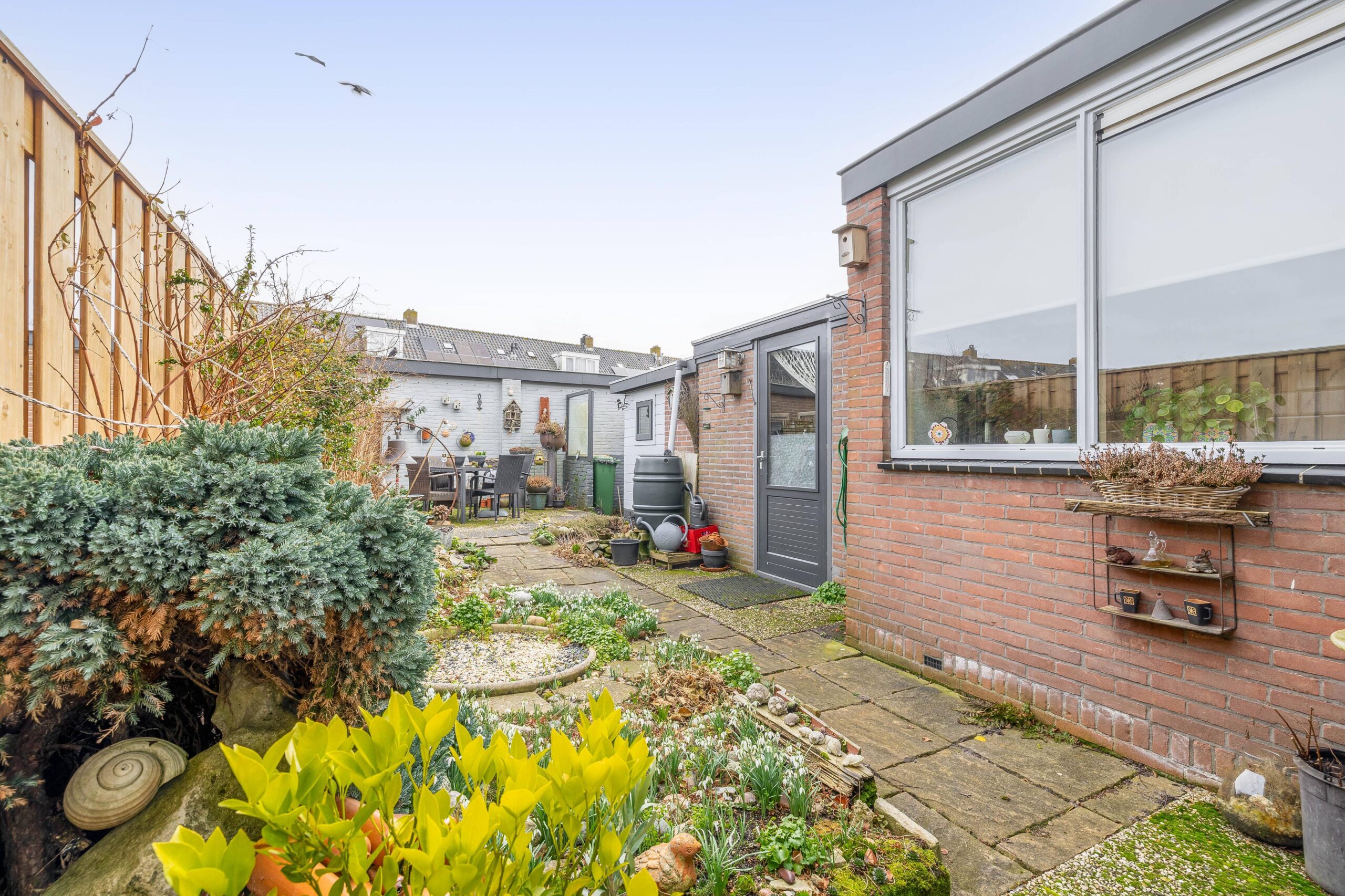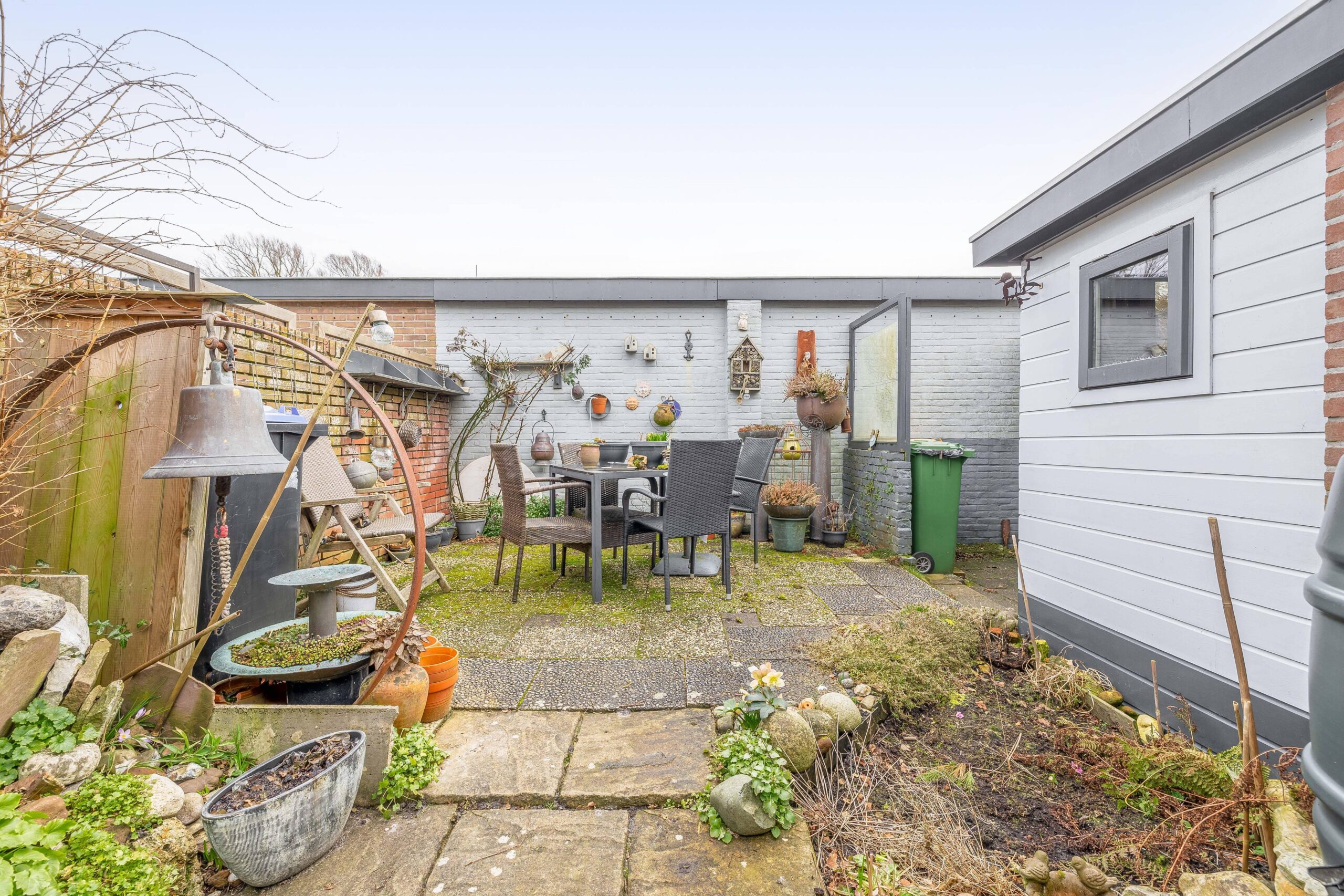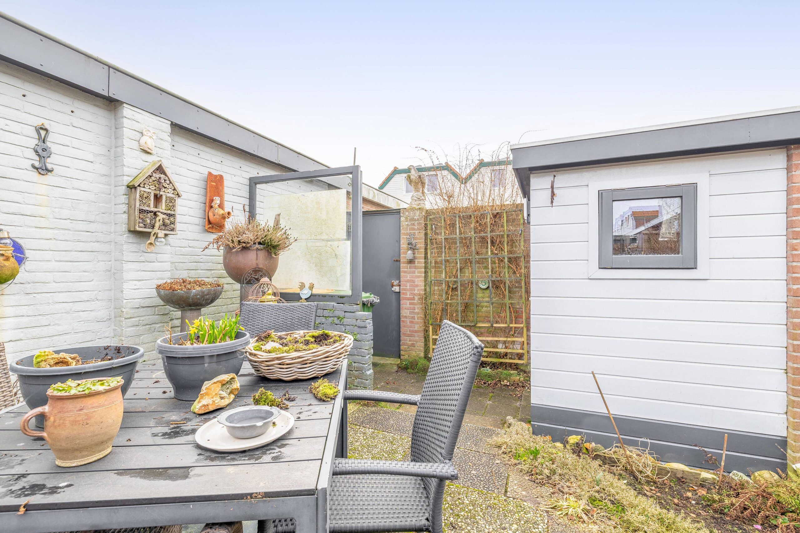 Fijne zonnige tuin met poort naar de steeg. De berging is keurig en met hout afgewerkt.
