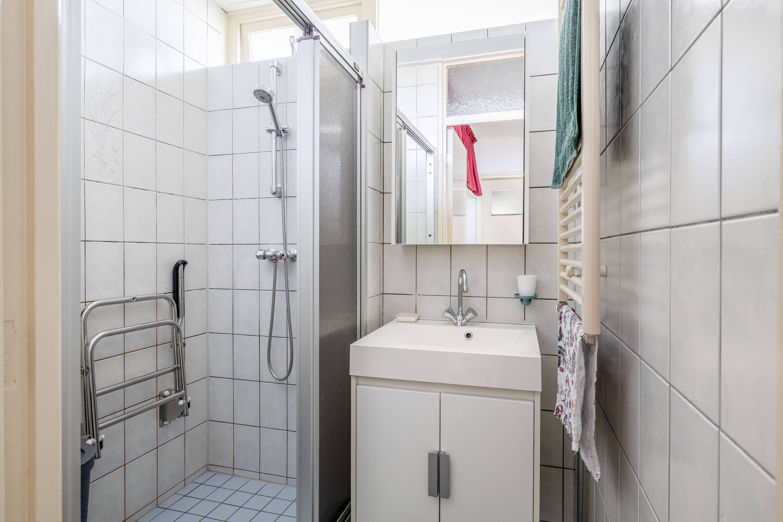 De badkamer is ingedeeld met een schuifdeur naar de douche, wastafelmeubel en handdoekenradiator.