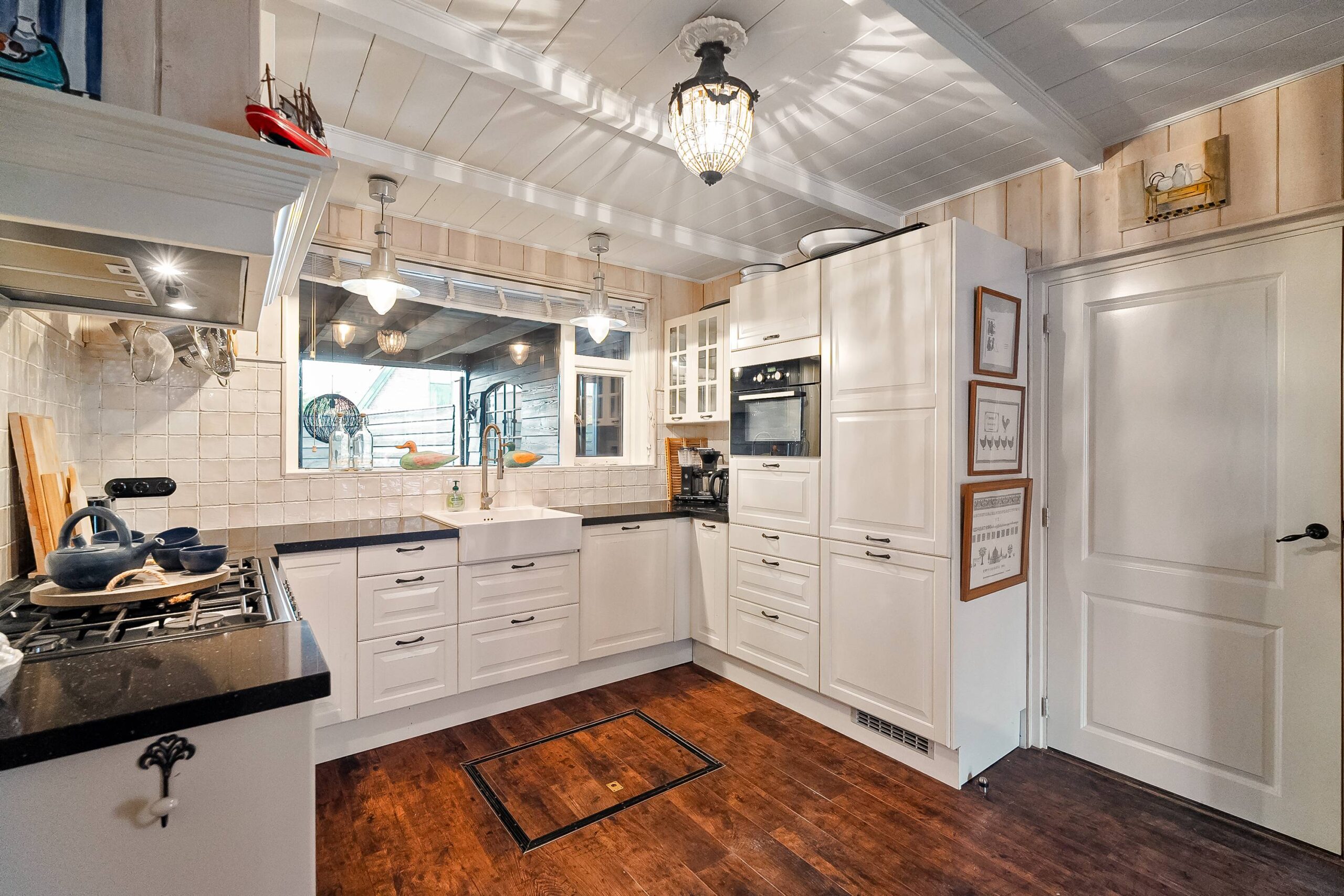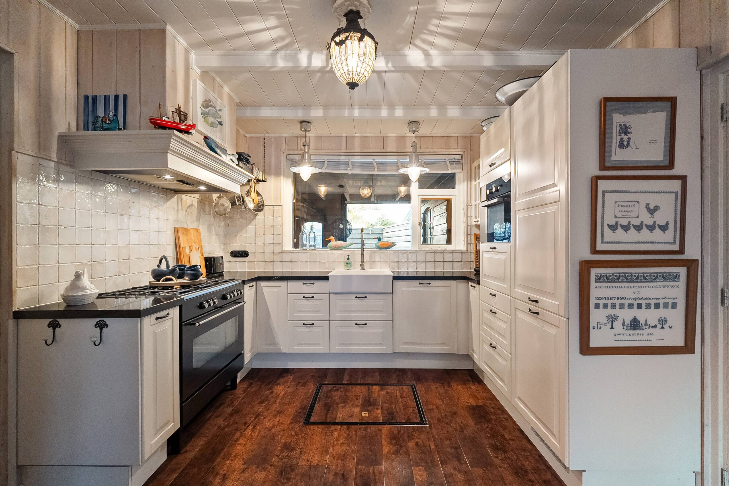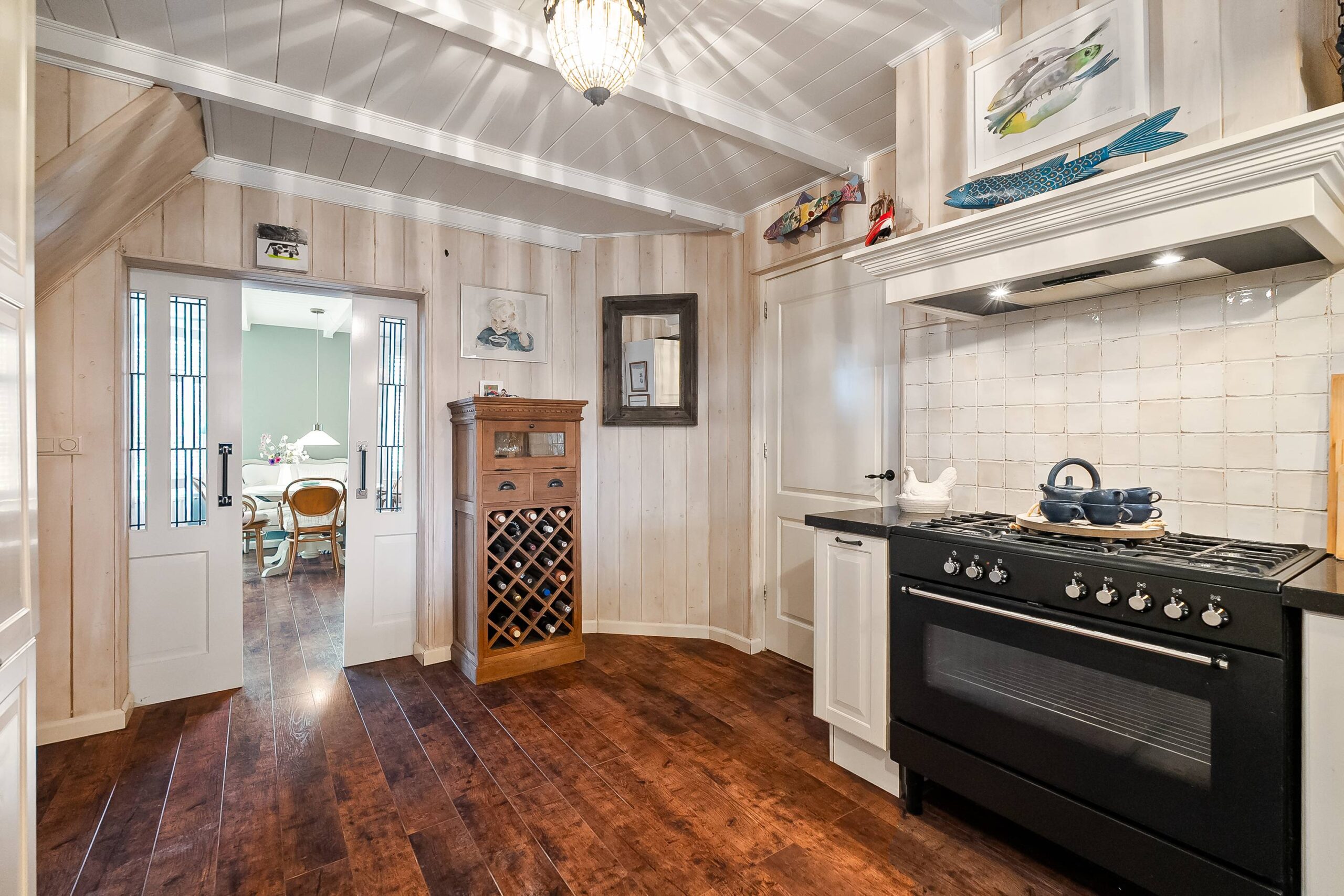 De keuken is middels suitedeuren af te sluiten van de woonkamer. De keuken is een functionele en prettig ingedeelde ruimte waar je uitkijkt op de overkapping. Alle wenselijke apparatuur is aanwezig: een 5-pits gasfornuis met oven, afzuigkap, vaatwasser, combimagnetron en koel-vriescombinatie. Extra bergruimte in een praktische vaste kast.