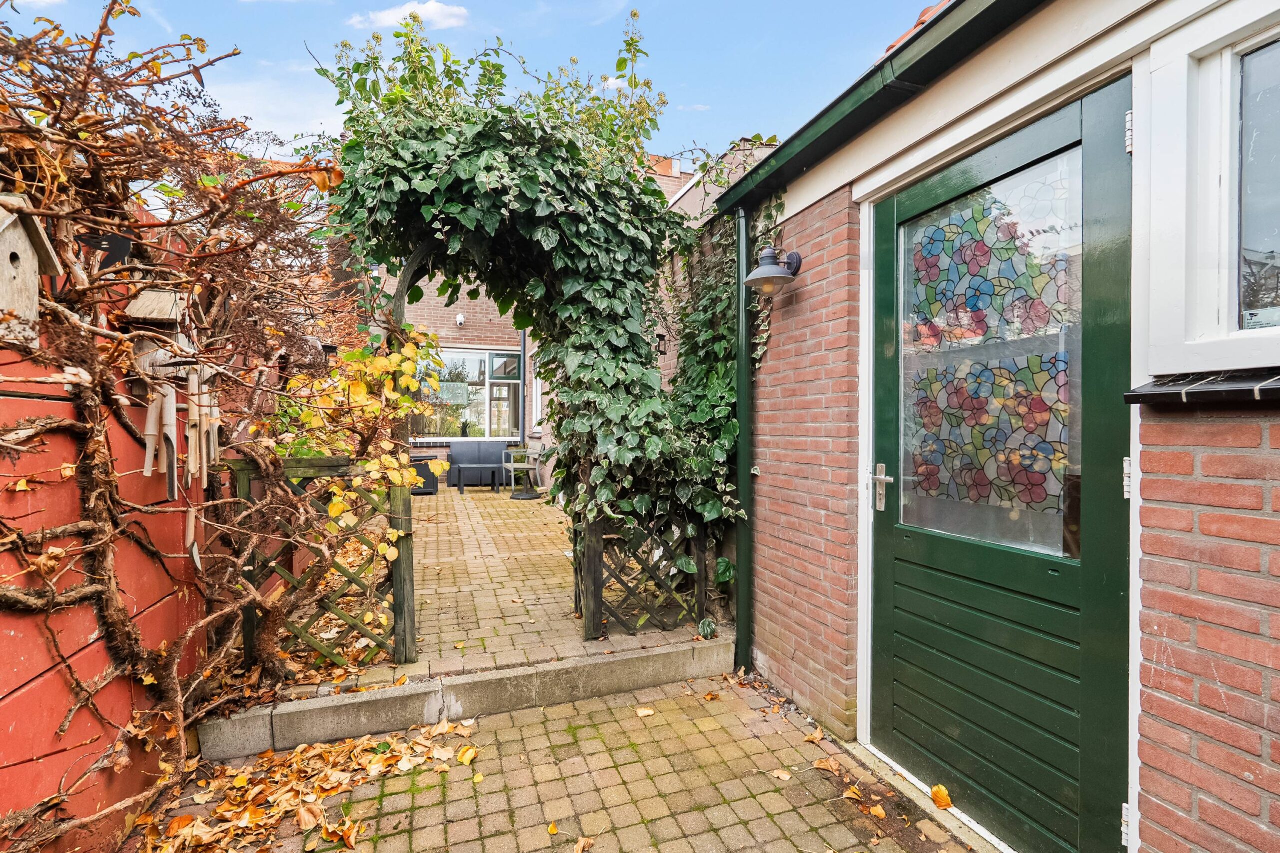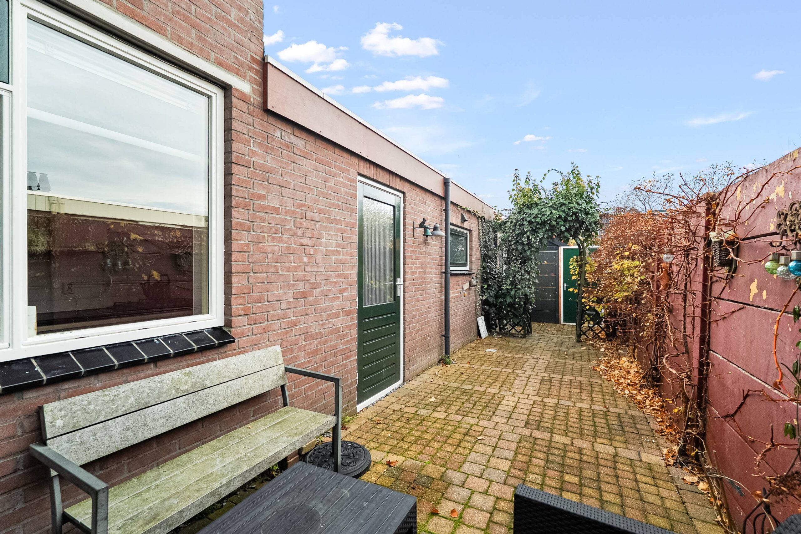 De achtertuin is verzorgd aangelegd en biedt een aangebouwde stenen berging met vliering. Ook is er een buitenkraan en een achterom aanwezig.
