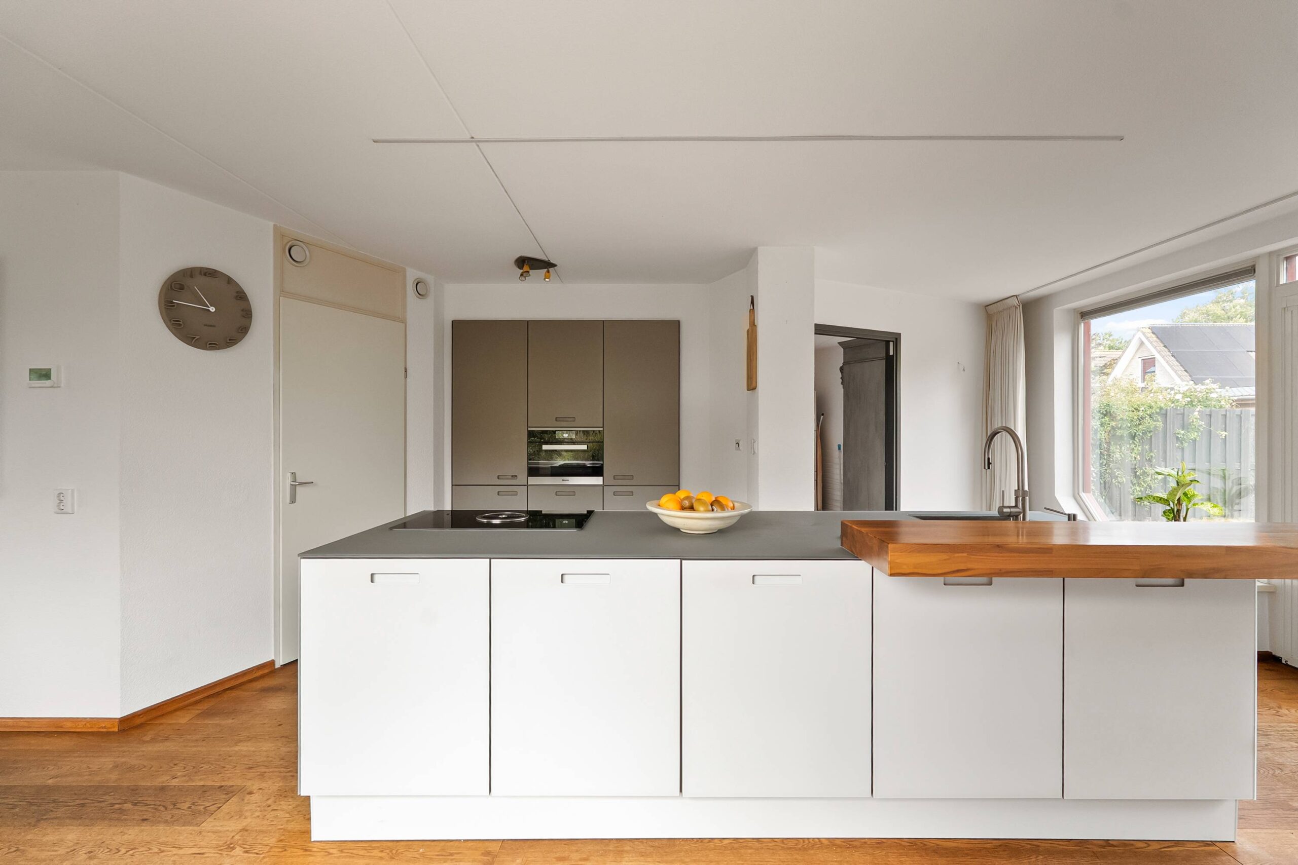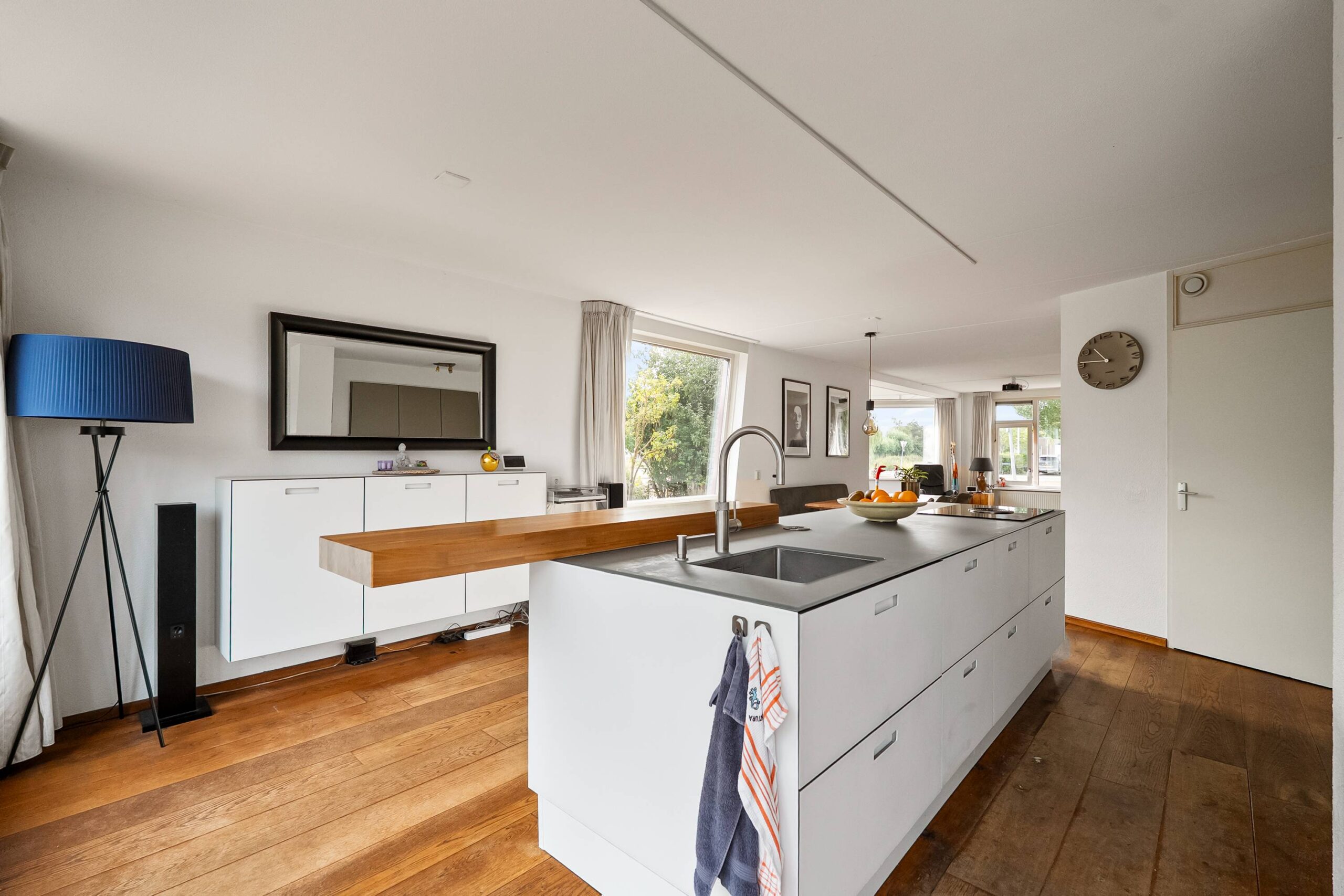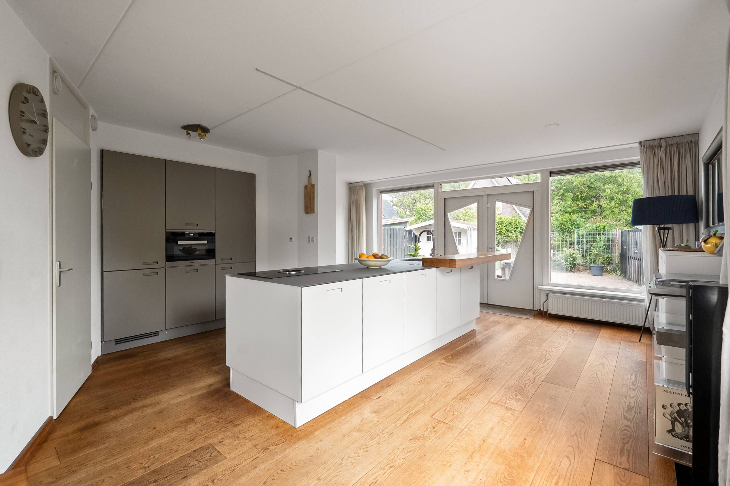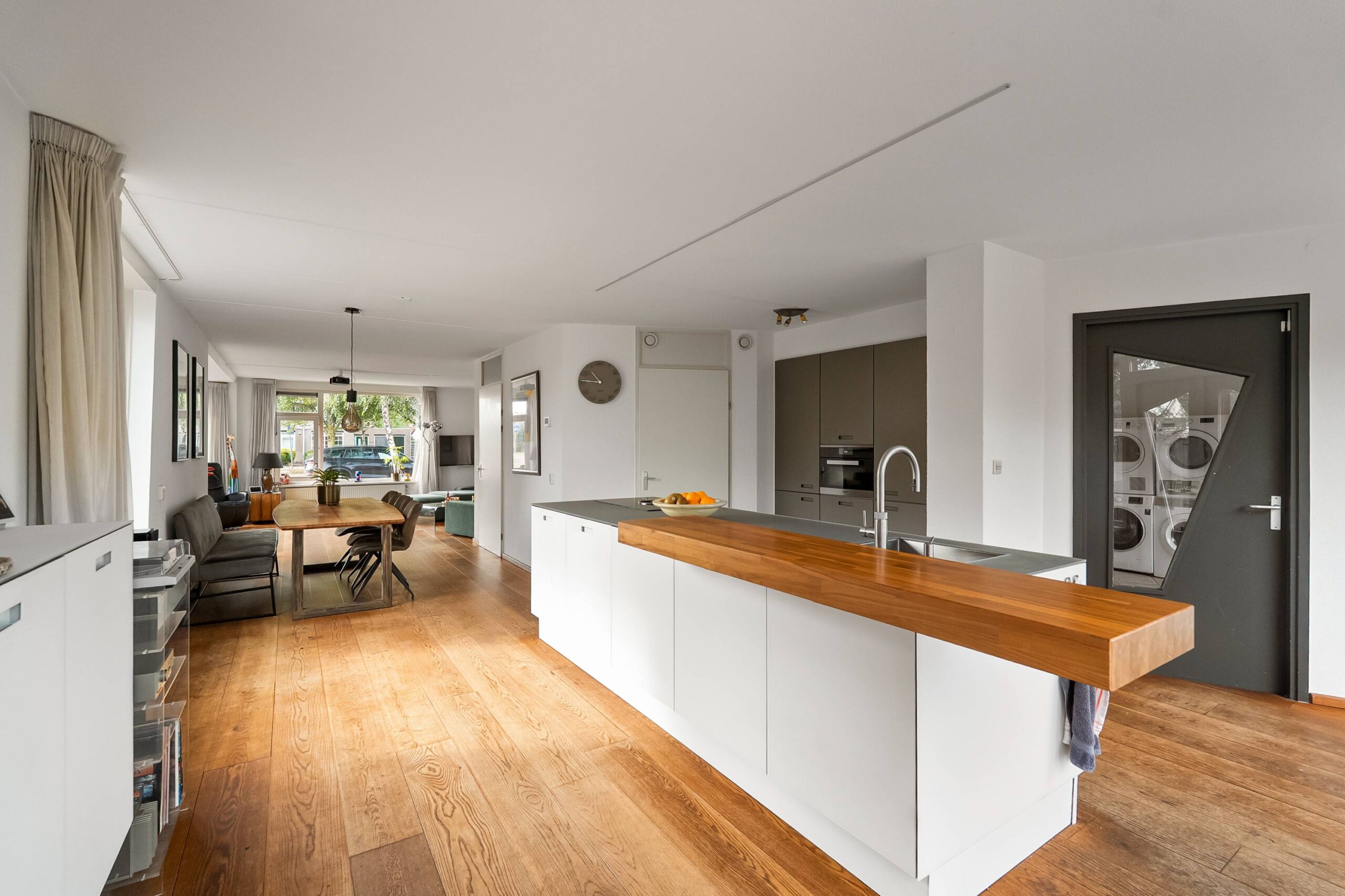 De woonkamer is erg licht dankzij de erker en grote raampartijen aan de voorzijde. Aan de achterzijde is in 2007 een aanbouw gerealiseerd in dezelfde architectonische stijl. Hier vind je de luxe keuken, uitgerust met een Bora inductiekookplaat met geïntegreerde afzuiging, een koel-vriescombinatie, vaatwasser, stoomoven en Quooker. De keuken staat in verbinding met een praktische bijkeuken met witgoedaansluiting en vanuit hier heb je toegang tot de garage met vliering en elektrische garagedeur.