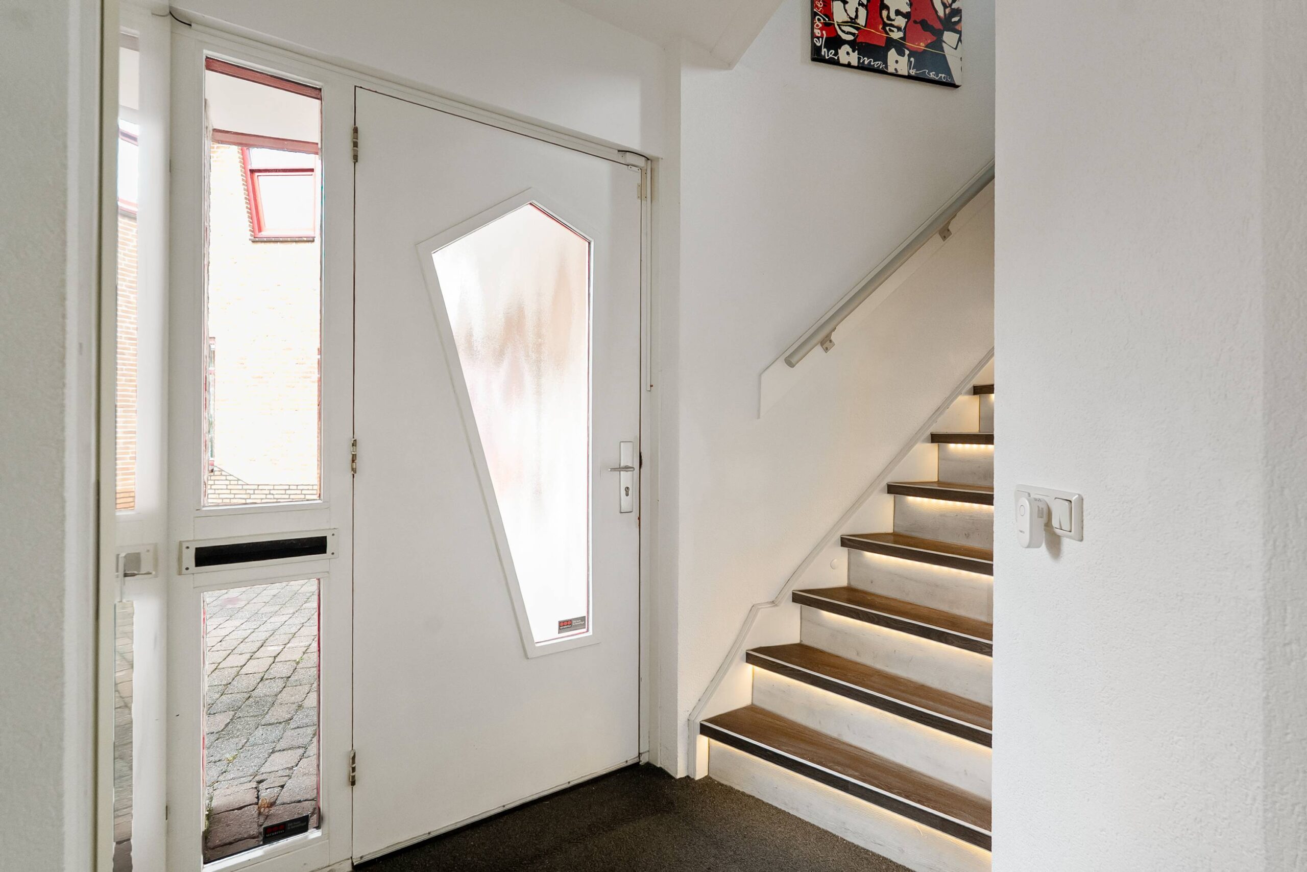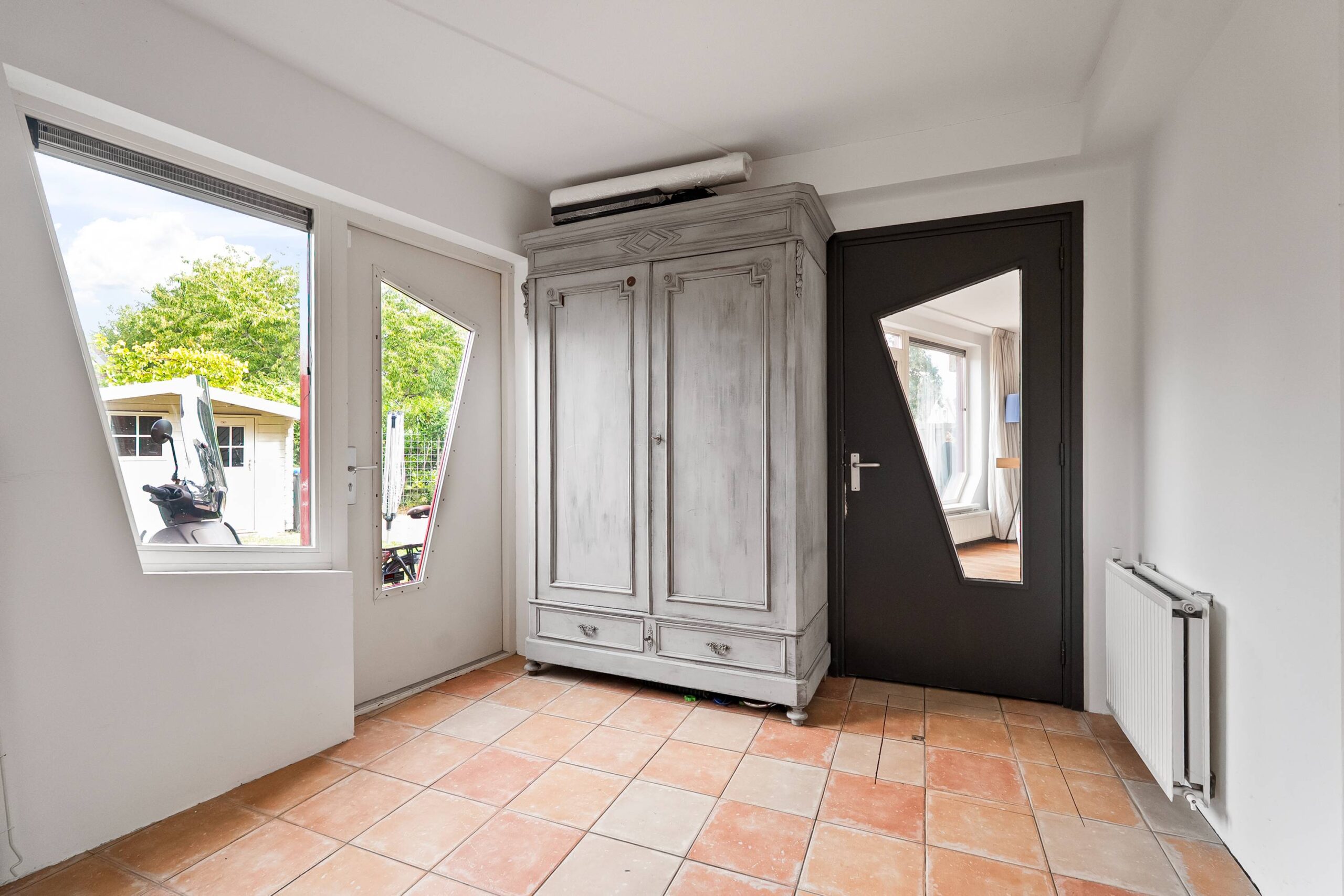 De auto(‘s) kunnen op de eigen oprit worden geparkeerd. De entree van de woning bevindt zich aan de zijkant. De hal is ruim en hier bevinden zich de meterkast, het toilet met fontein, de trapopgang en toegang tot de woonkamer.