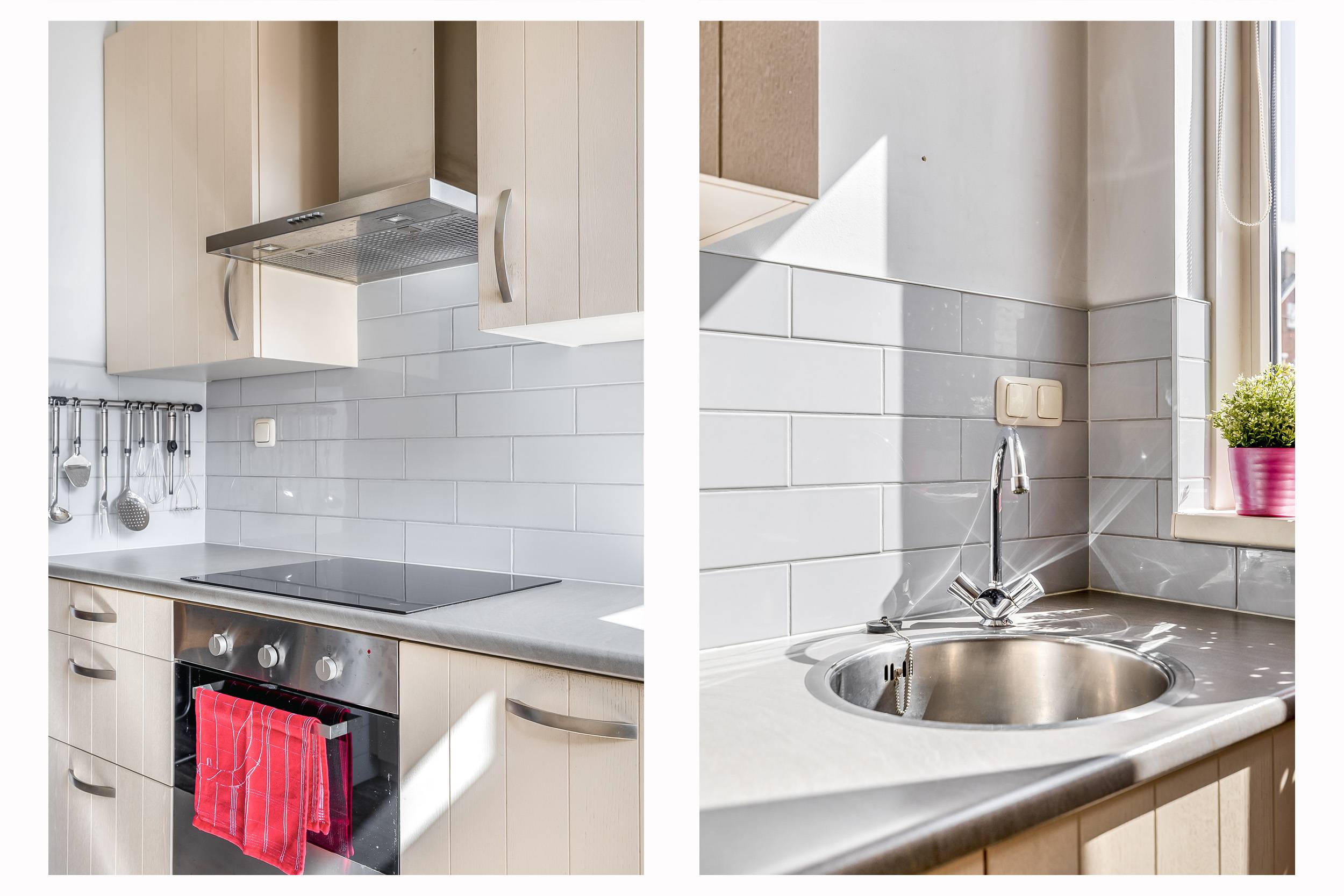 Aan de achterzijde bevindt zich de keuken, die functioneel is ingericht en is voorzien van een inductiekookplaat, afzuigkap, oven, vaatwasser, plintboiler en koelkast. Vanuit de keuken is er toegang tot de achtertuin.