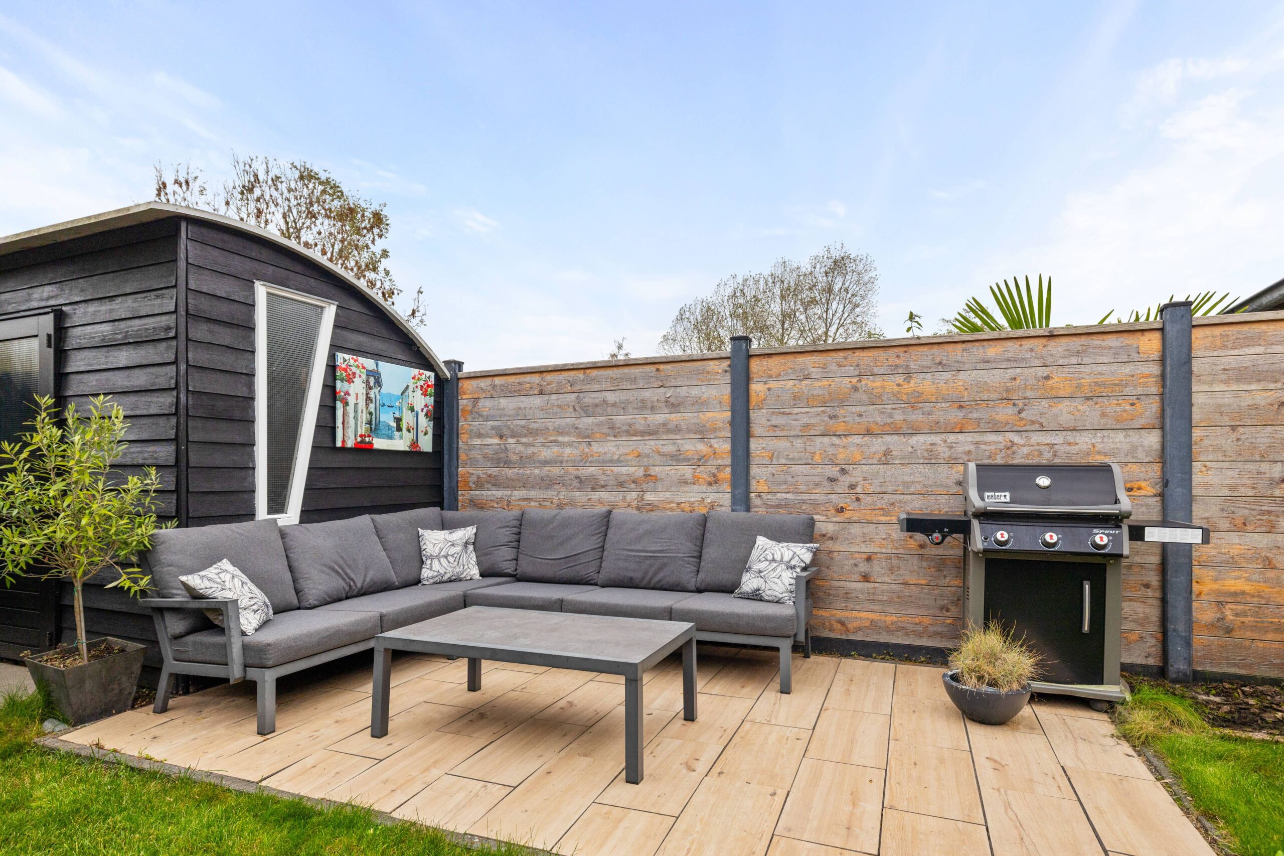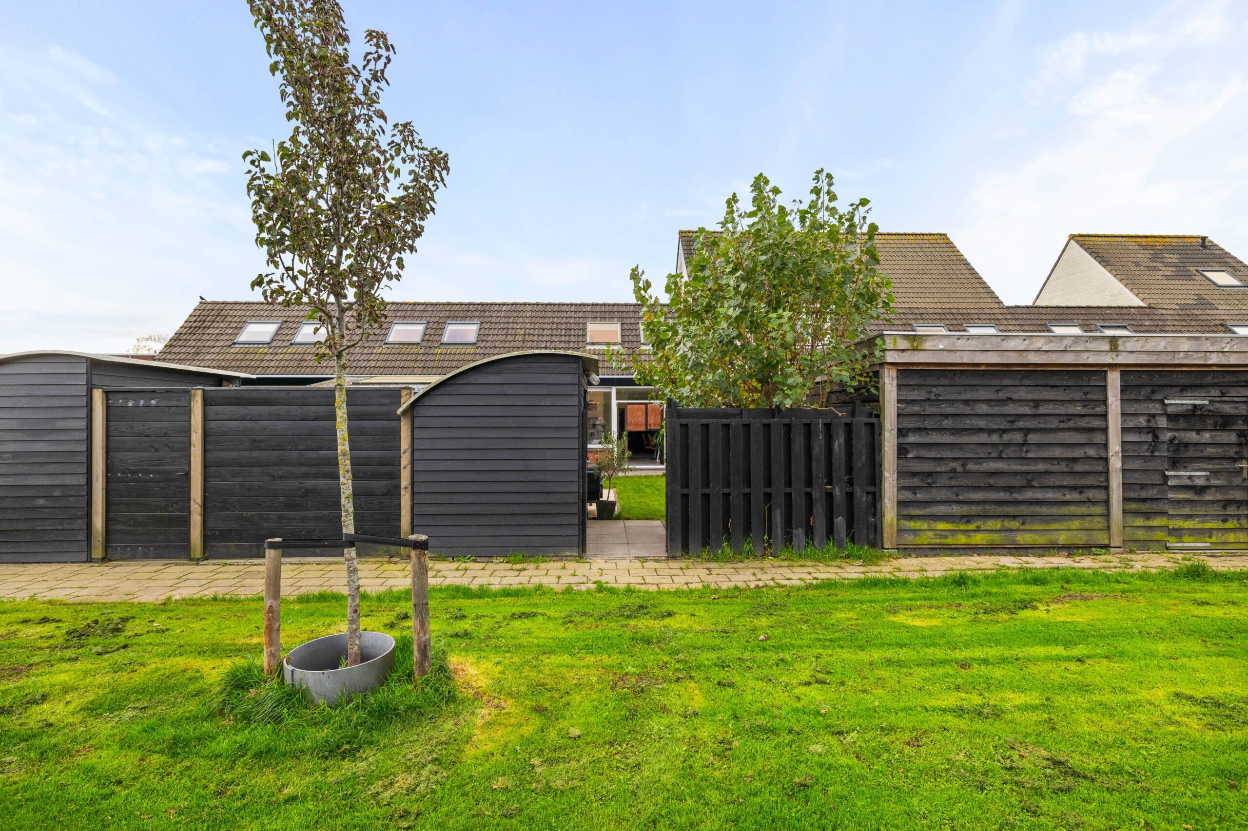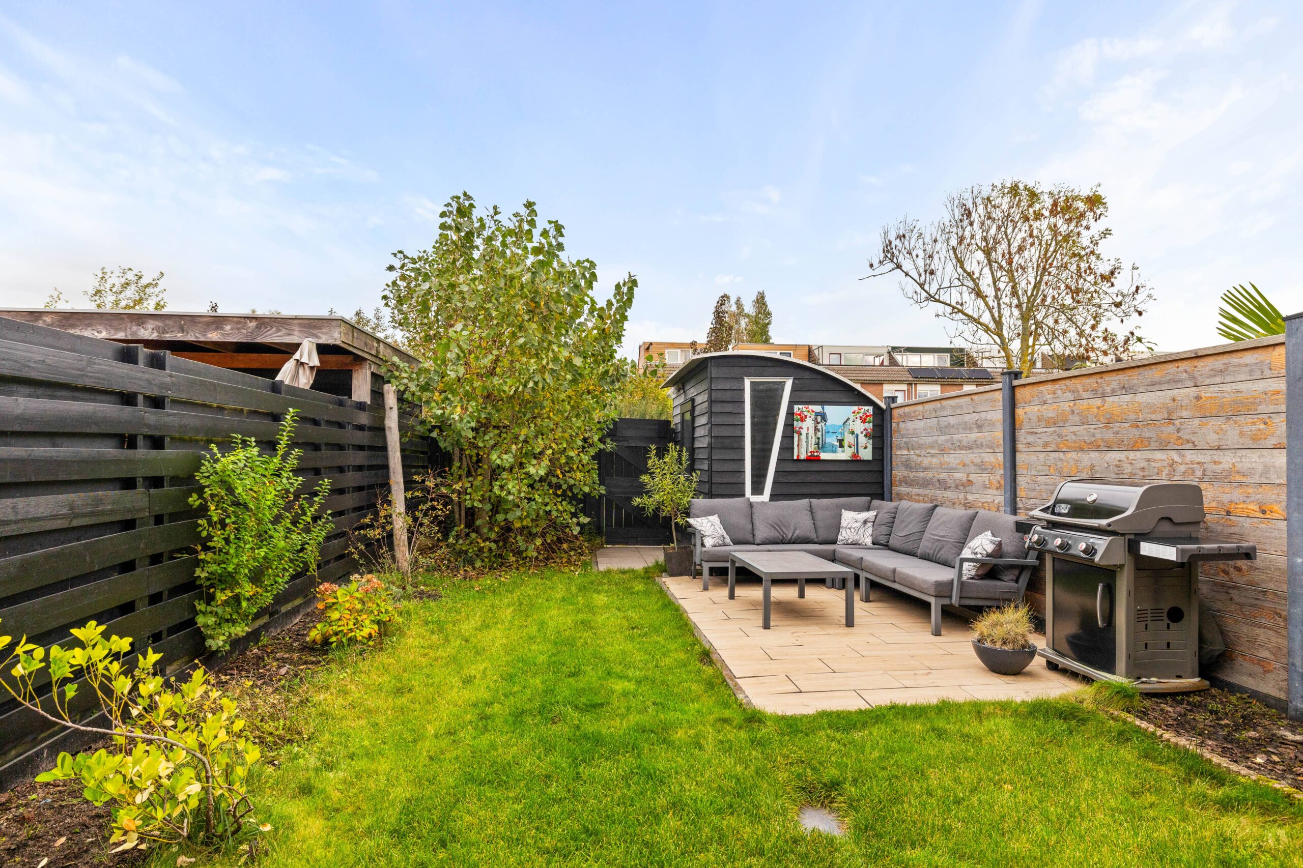 De ruime tuin is onderhoudsvriendelijk aangelegd en bereikbaar via een achterom. Achterin de tuin staat een vrijstaande houten berging.