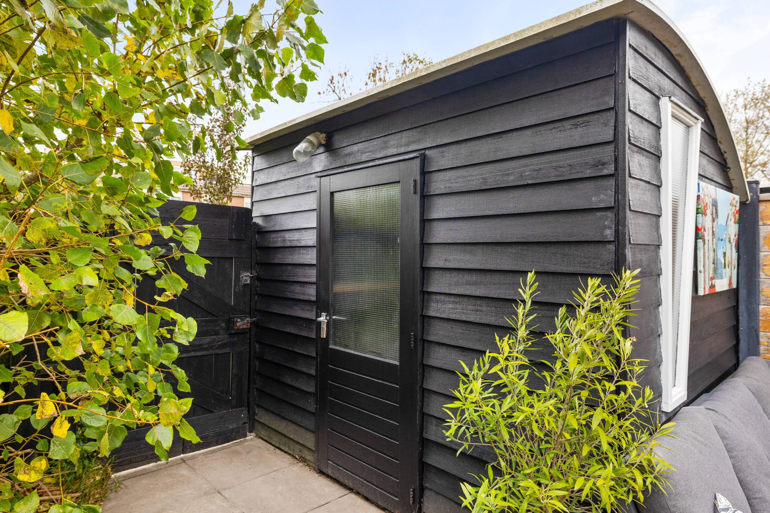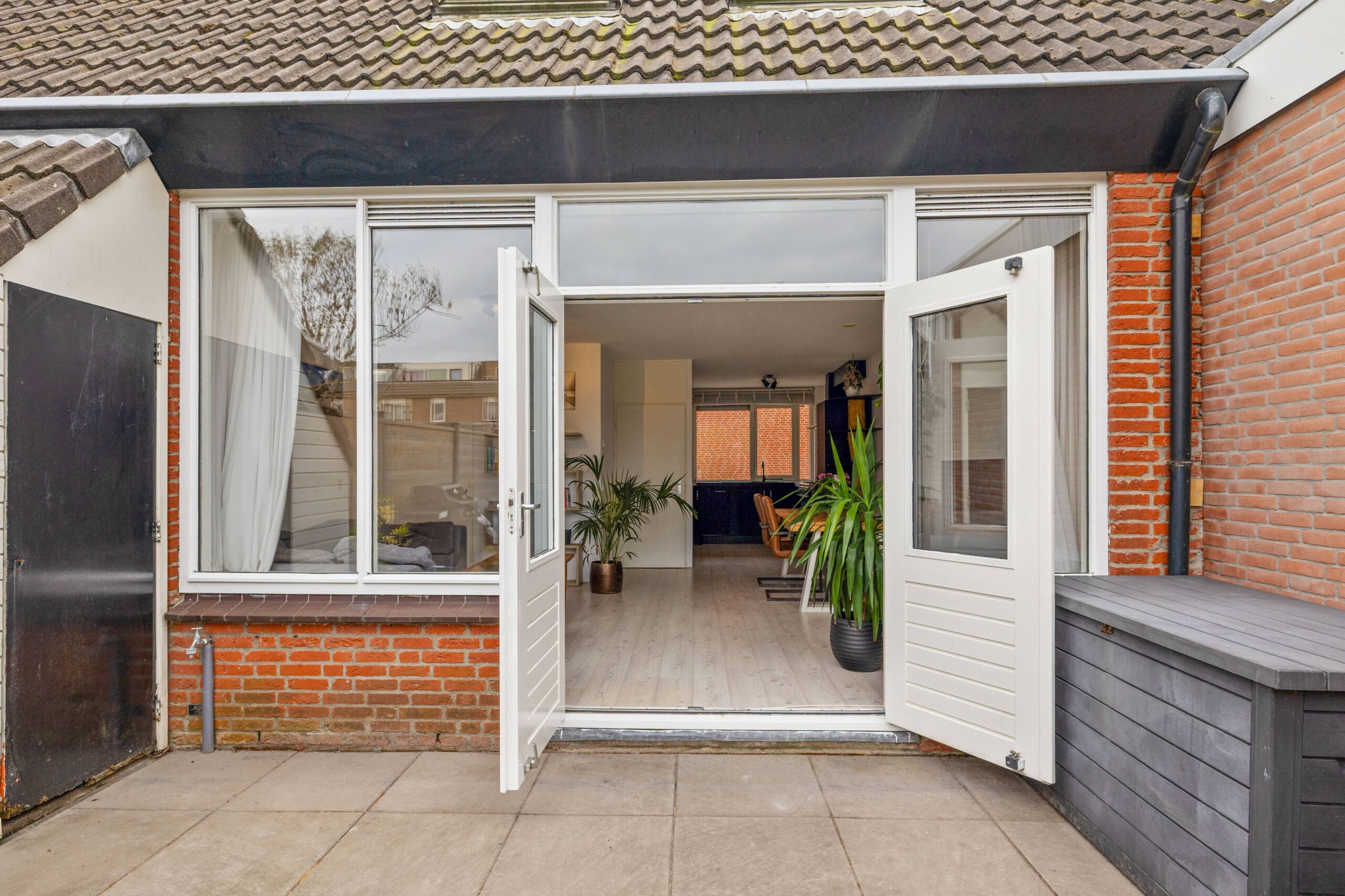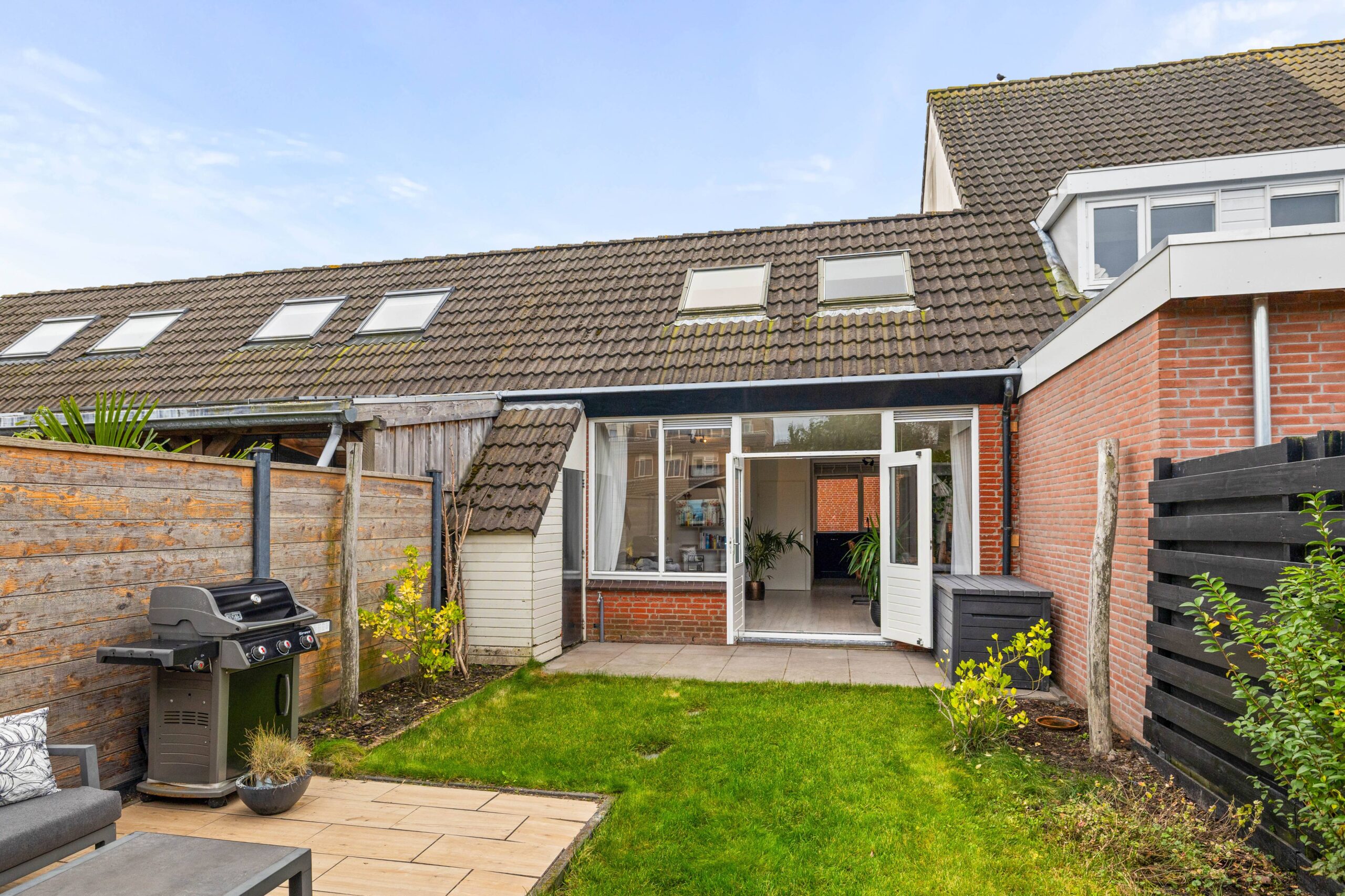 De ruime tuin is onderhoudsvriendelijk aangelegd en bereikbaar via een achterom. Achterin de tuin staat een vrijstaande houten berging.