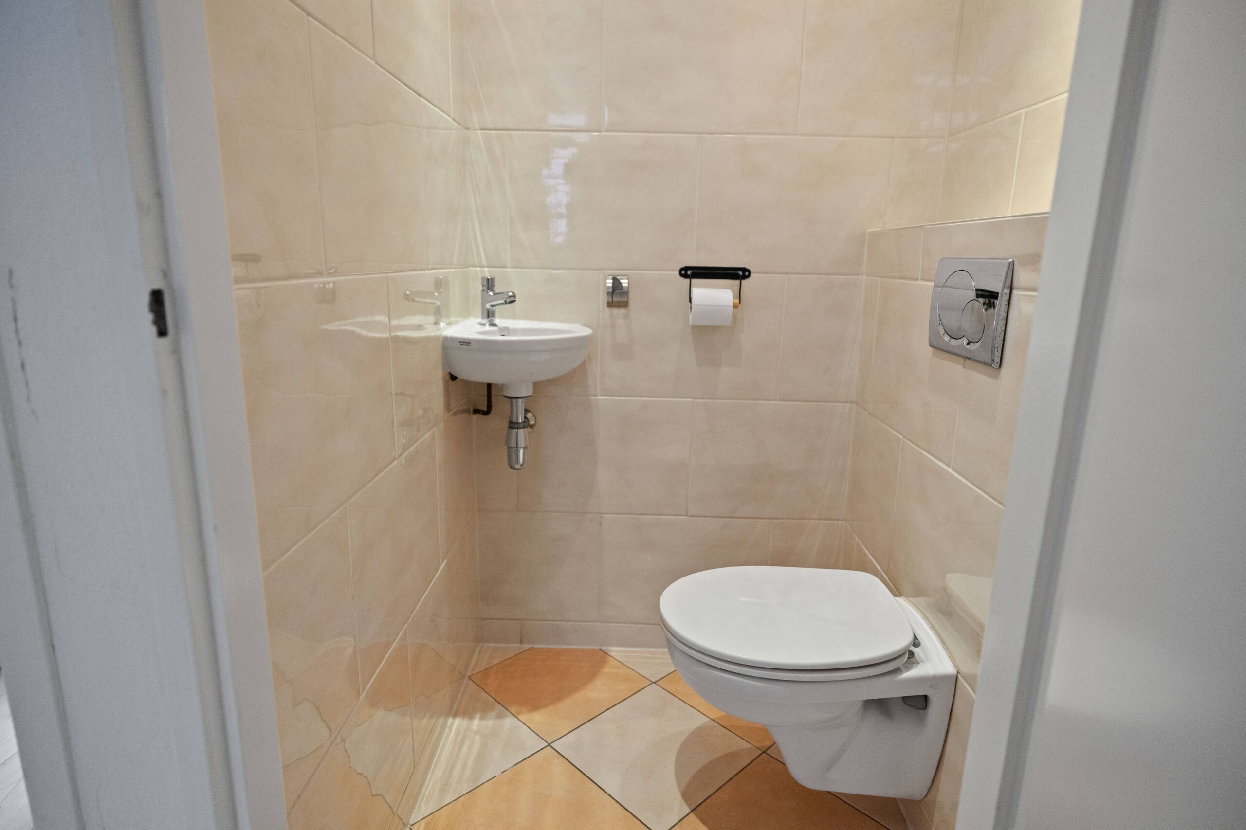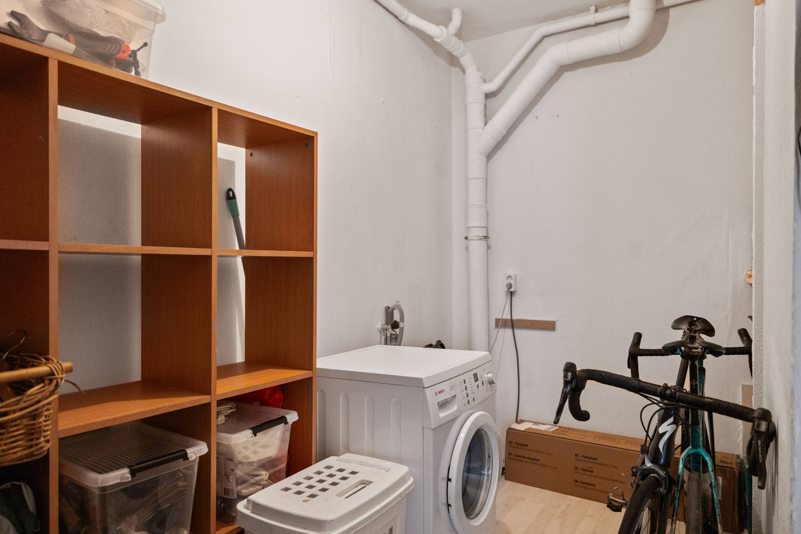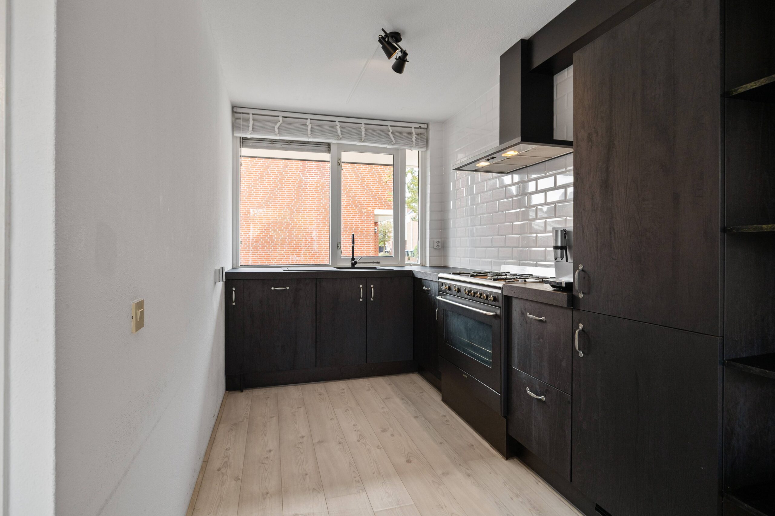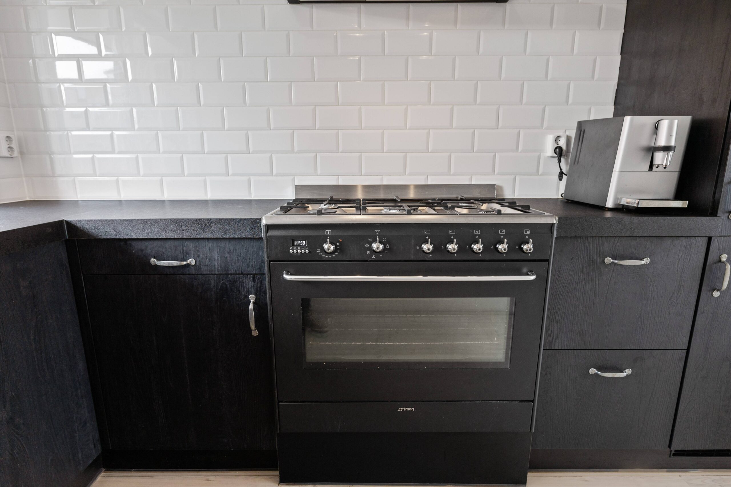 Apart toilet in de hal. De lichte woonkamer met tuindeuren grenst aan de tuin en de open keuken aan de voorzijde met zicht over het pleintje. De keuken is modern zwart met inbouwapparatuur.