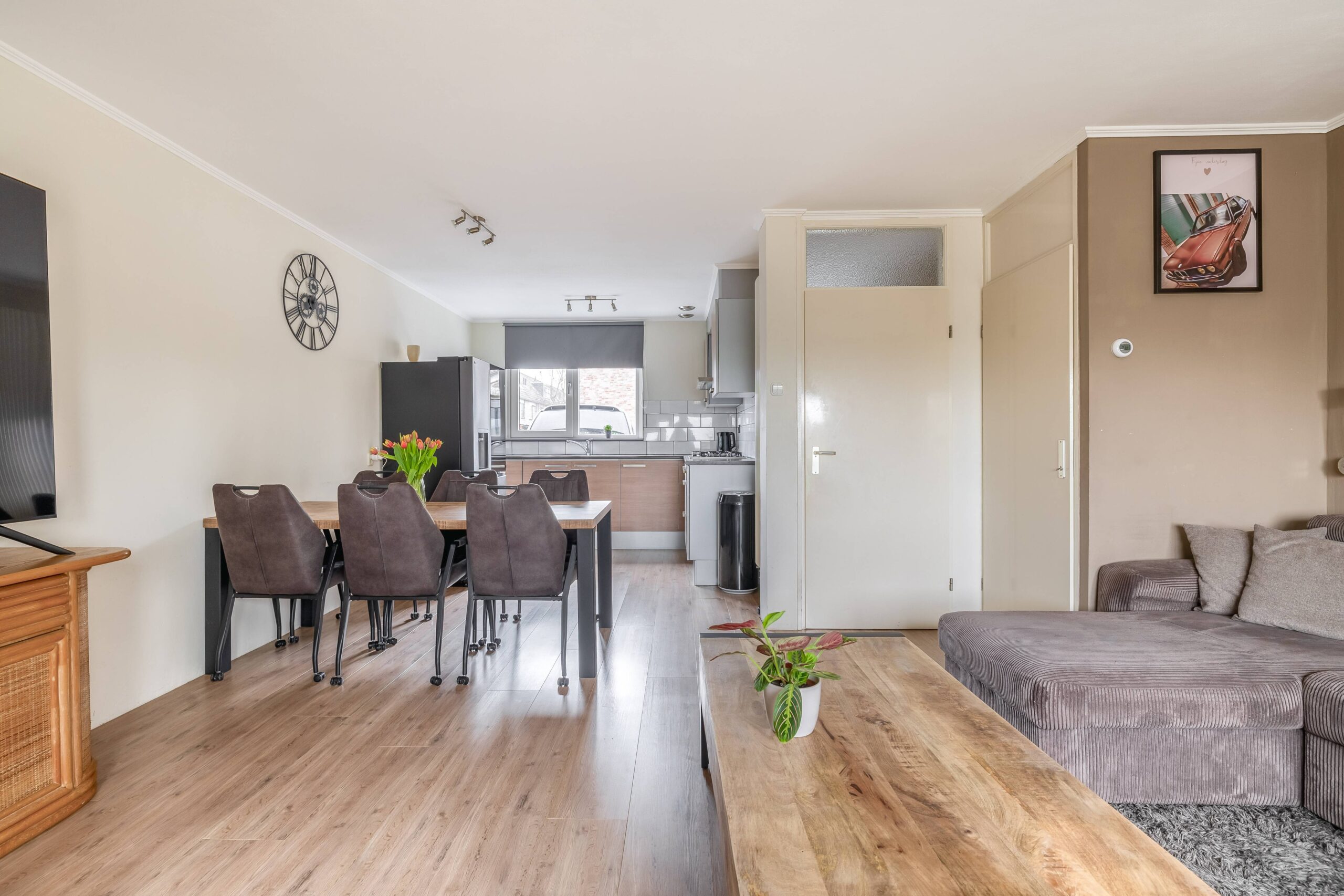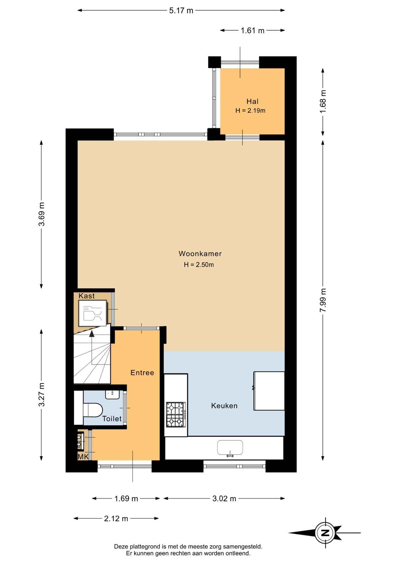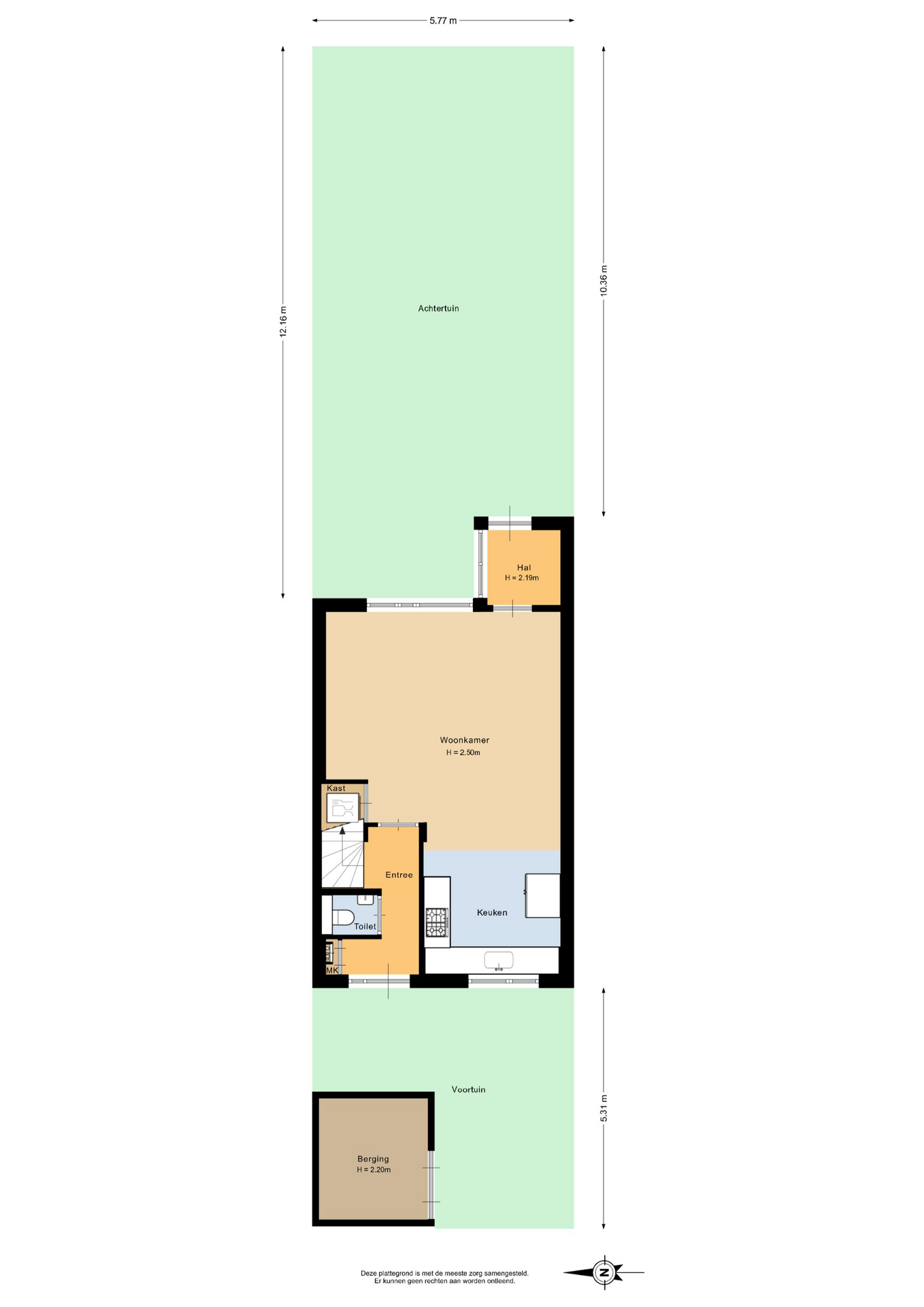 Hal/entree met meterkast, modern toilet met fontein en toegang tot de woonkamer. De keuken bevindt zich aan de voorzijde van de woning en beschikt over een kookplaat, afzuigkap en vaatwasser. In de trapkast staat de combimagnetron (dit keukenblok stond voorheen op de plek van de losse koelkast). Via een deur aan de achterzijde kom je in een halletje met toegang tot de tuin. De achtertuin heeft een vrij uitzicht en er is een achterom aanwezig.