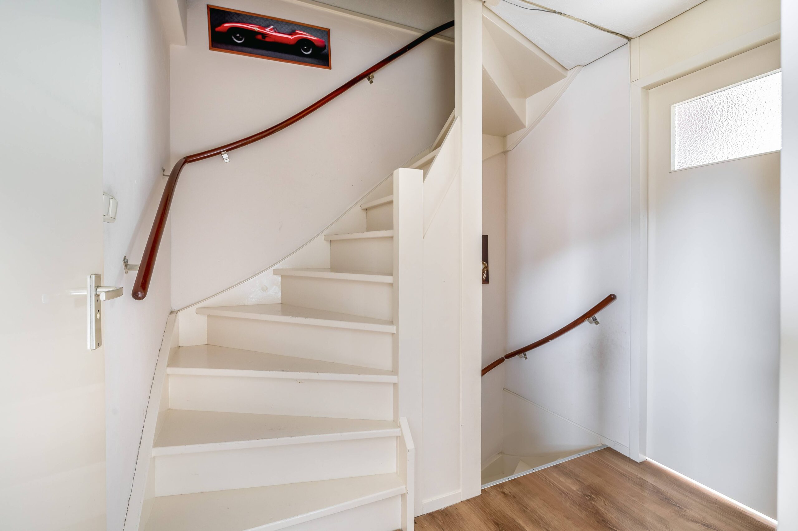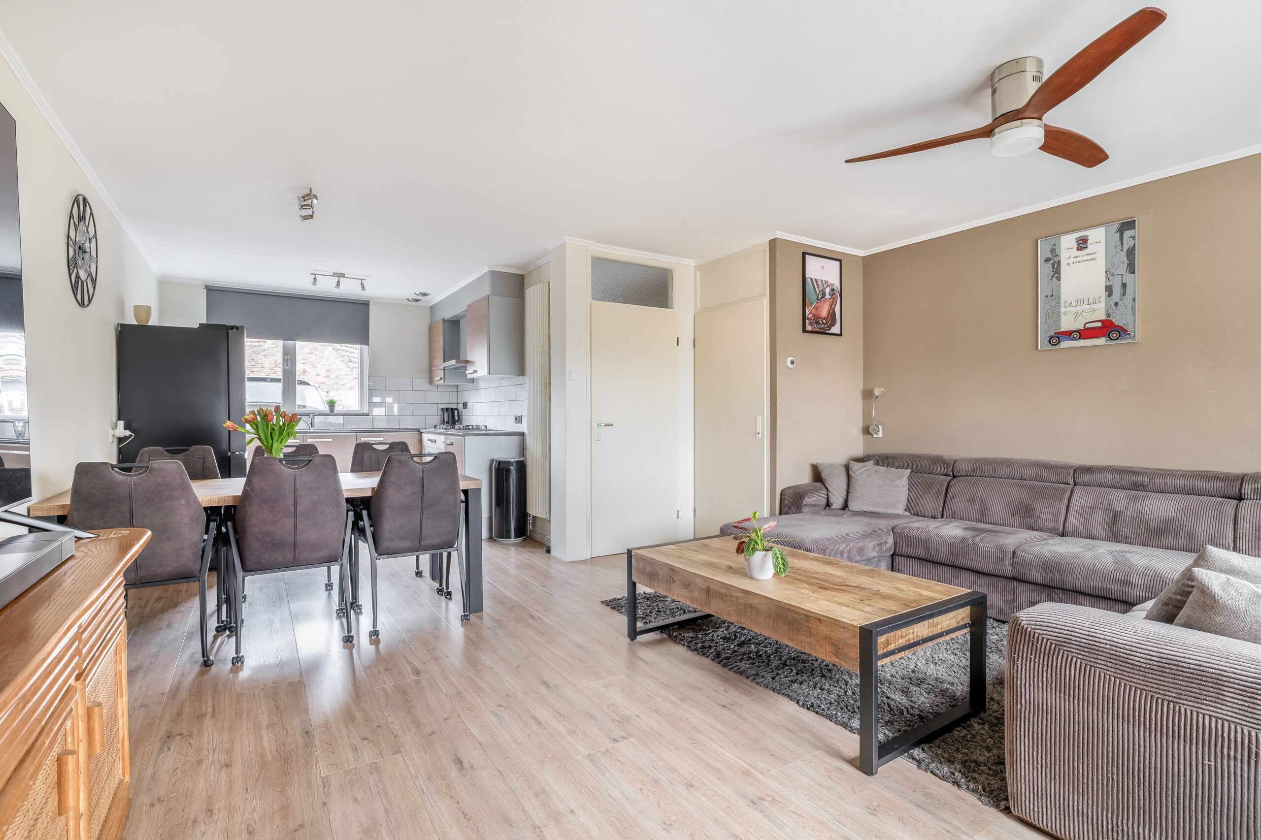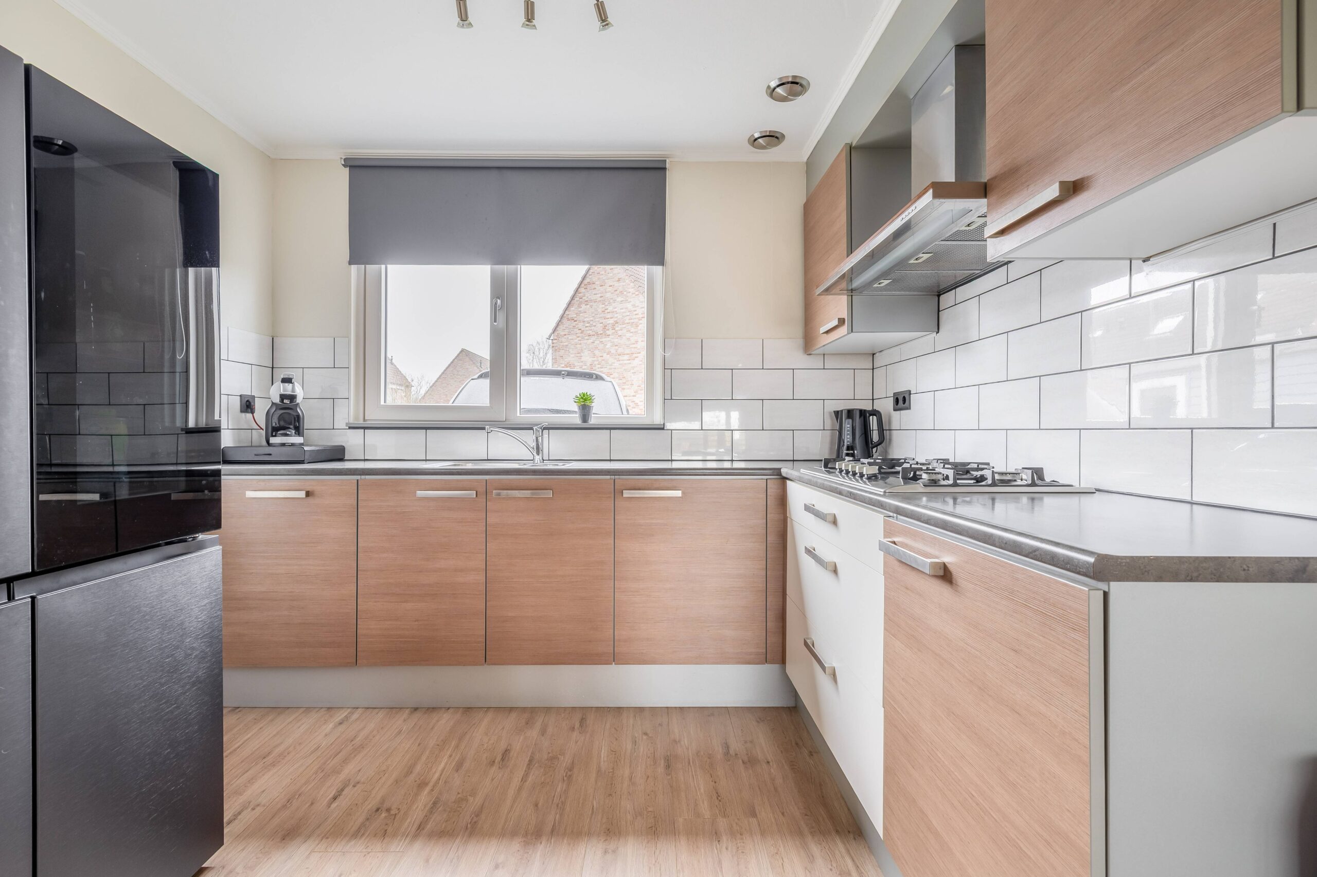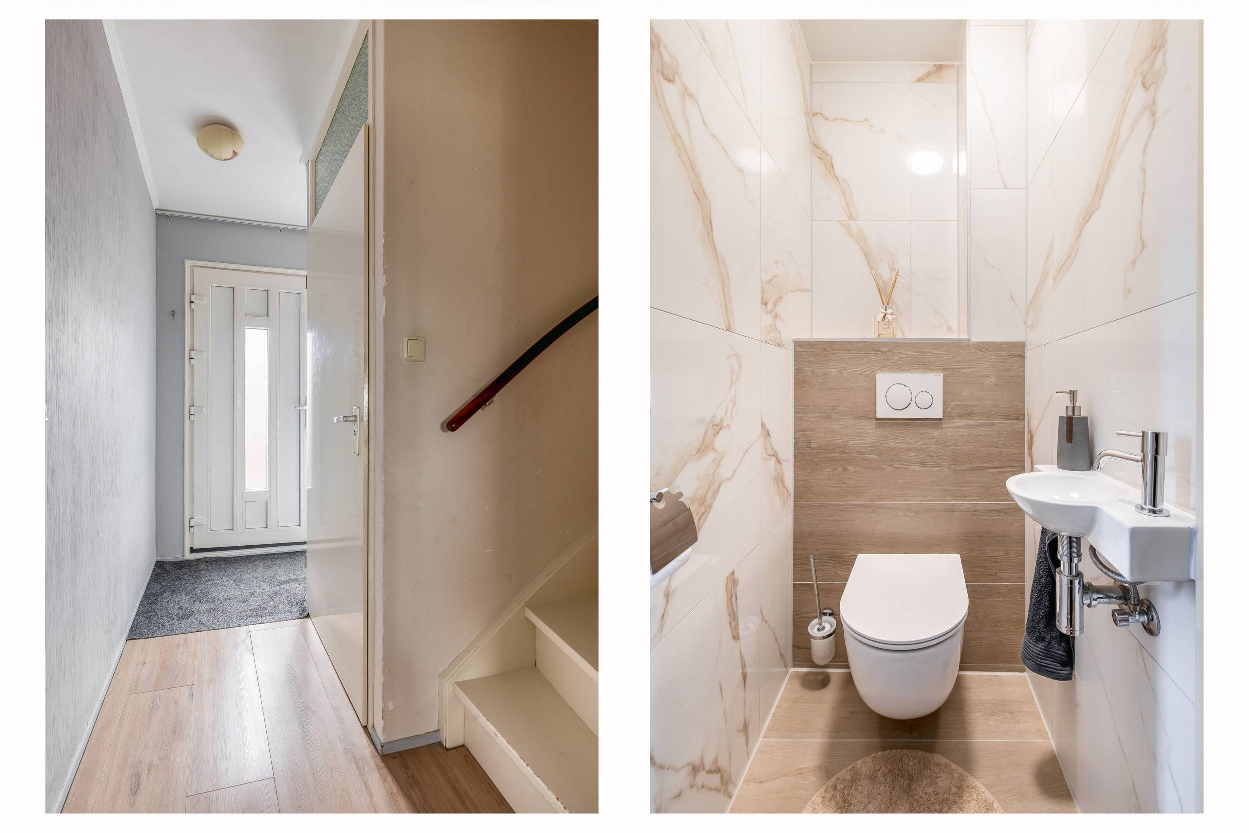 Hal/entree met meterkast, modern toilet met fontein en toegang tot de woonkamer. De keuken bevindt zich aan de voorzijde van de woning en beschikt over een kookplaat, afzuigkap en vaatwasser. In de trapkast staat de combimagnetron (dit keukenblok stond voorheen op de plek van de losse koelkast). Via een deur aan de achterzijde kom je in een halletje met toegang tot de tuin. De achtertuin heeft een vrij uitzicht en er is een achterom aanwezig.