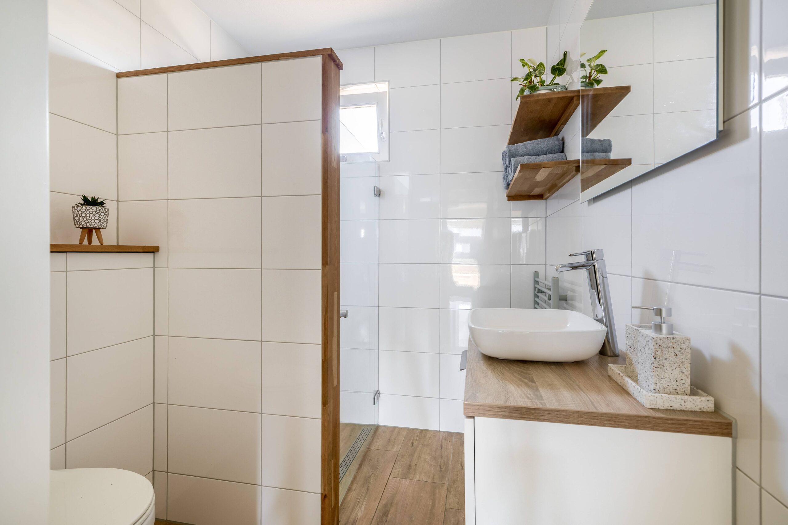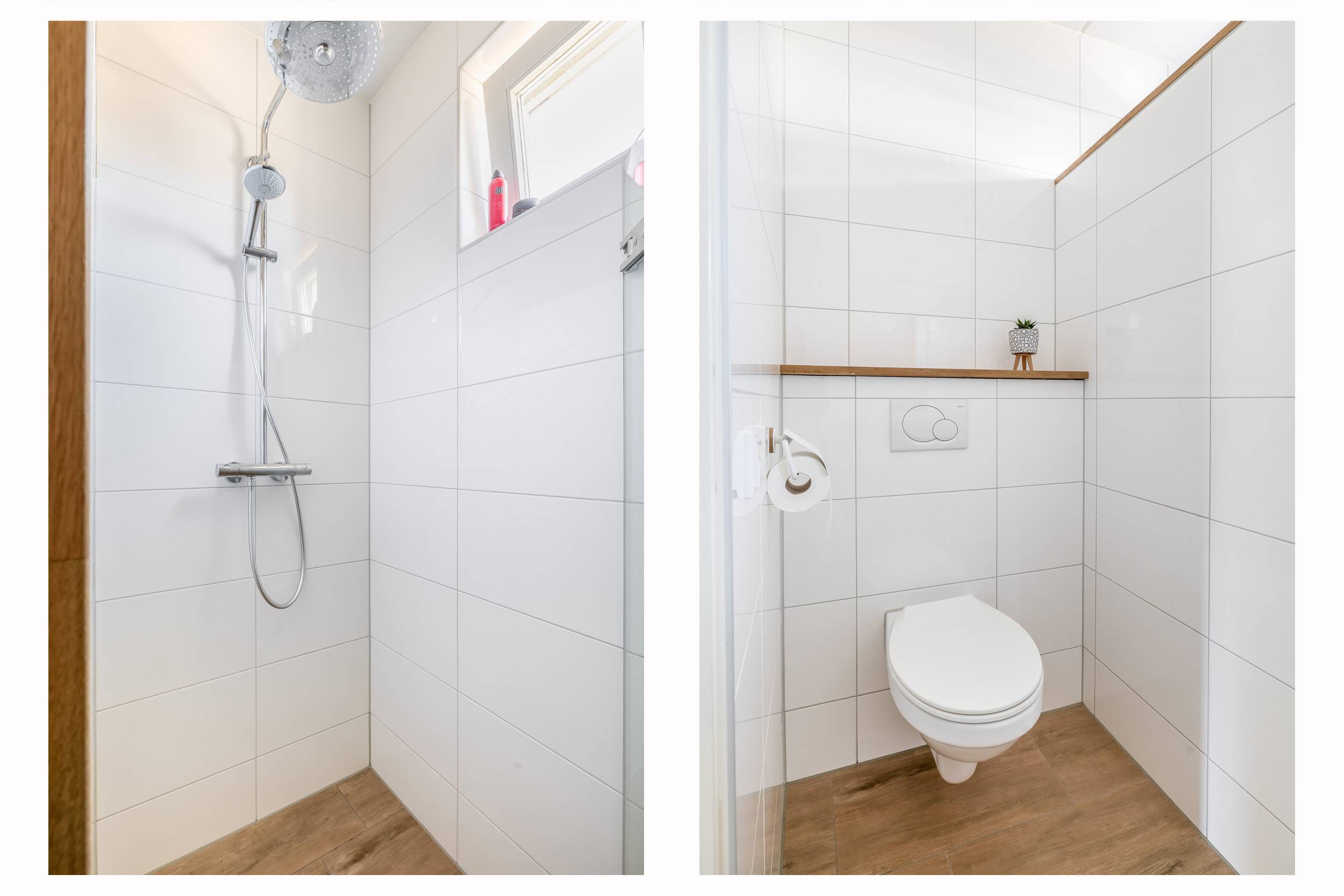 Op de 1e verdieping zijn 3 ruime slaapkamers aanwezig. Je hebt hier een mooie hoogte wat ruimtelijk prachtig is. De badkamer is volledig betegeld en ingericht met wastafelmeubel, inloopdouche en 2e toilet.