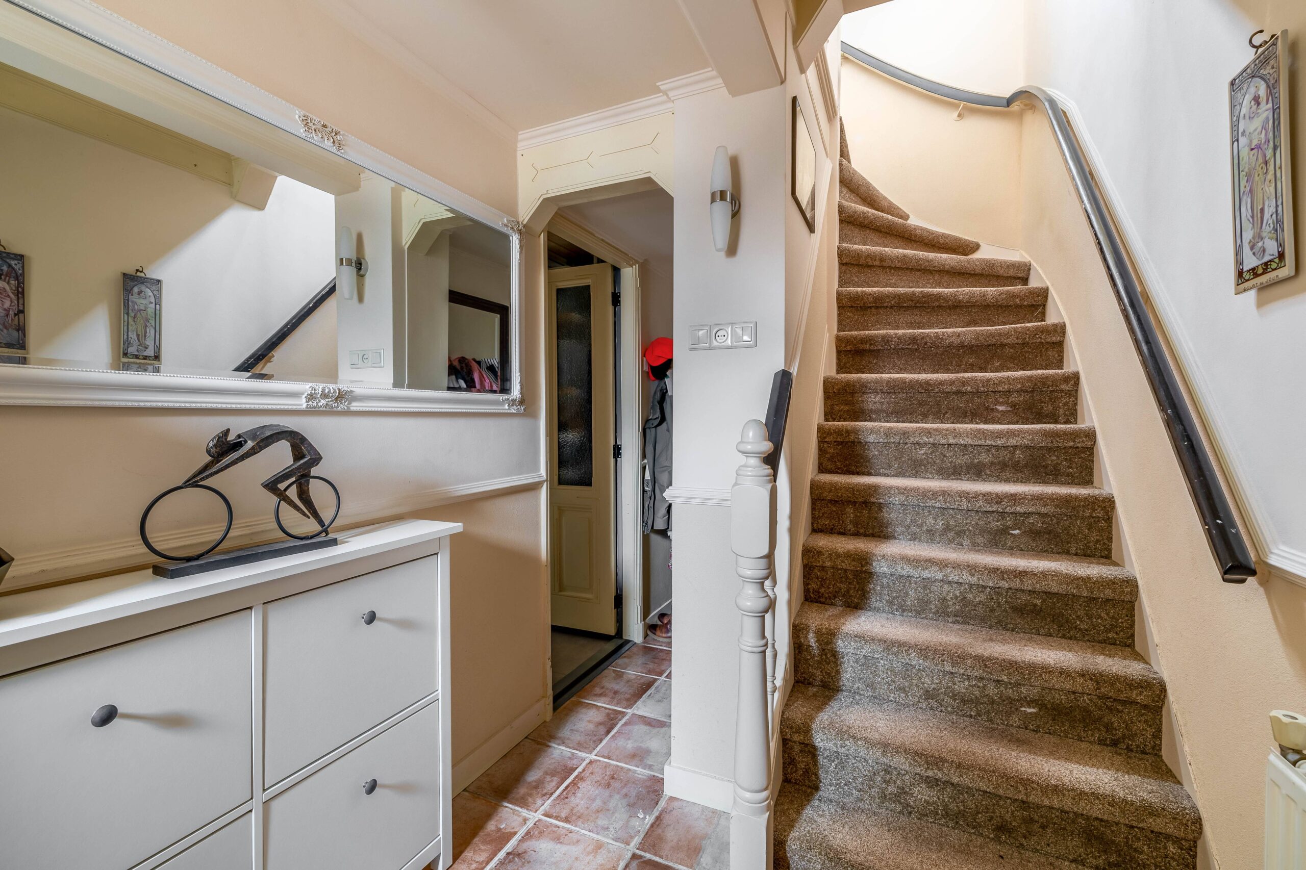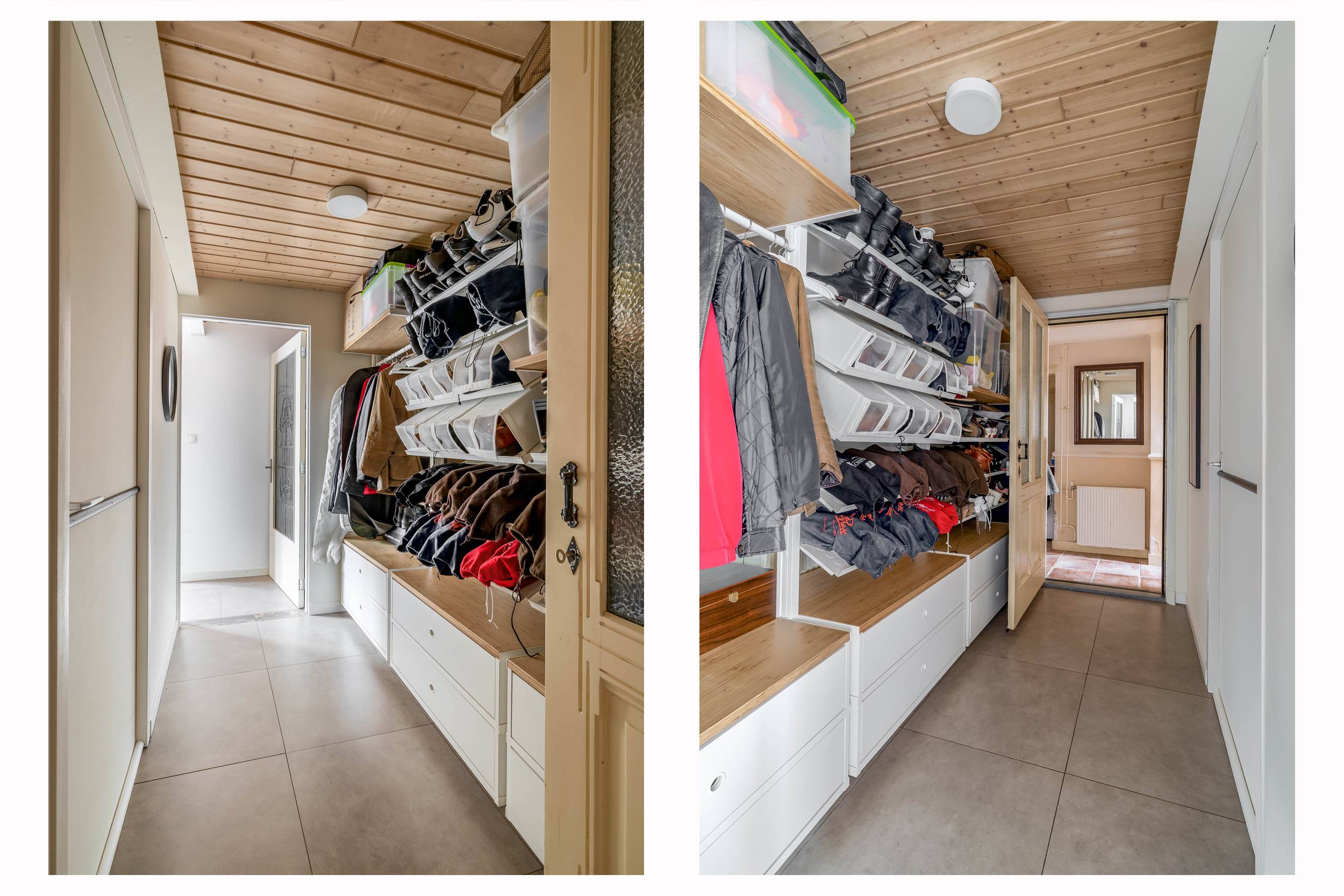 Via de entree kom je in de hal met groepenkast, trapopgang en wasmachine aansluiting onder de trap. Via de tussenhal met kastruimte toegang tot de inpandige garage met openslaande deuren en tot de slaapkamer.