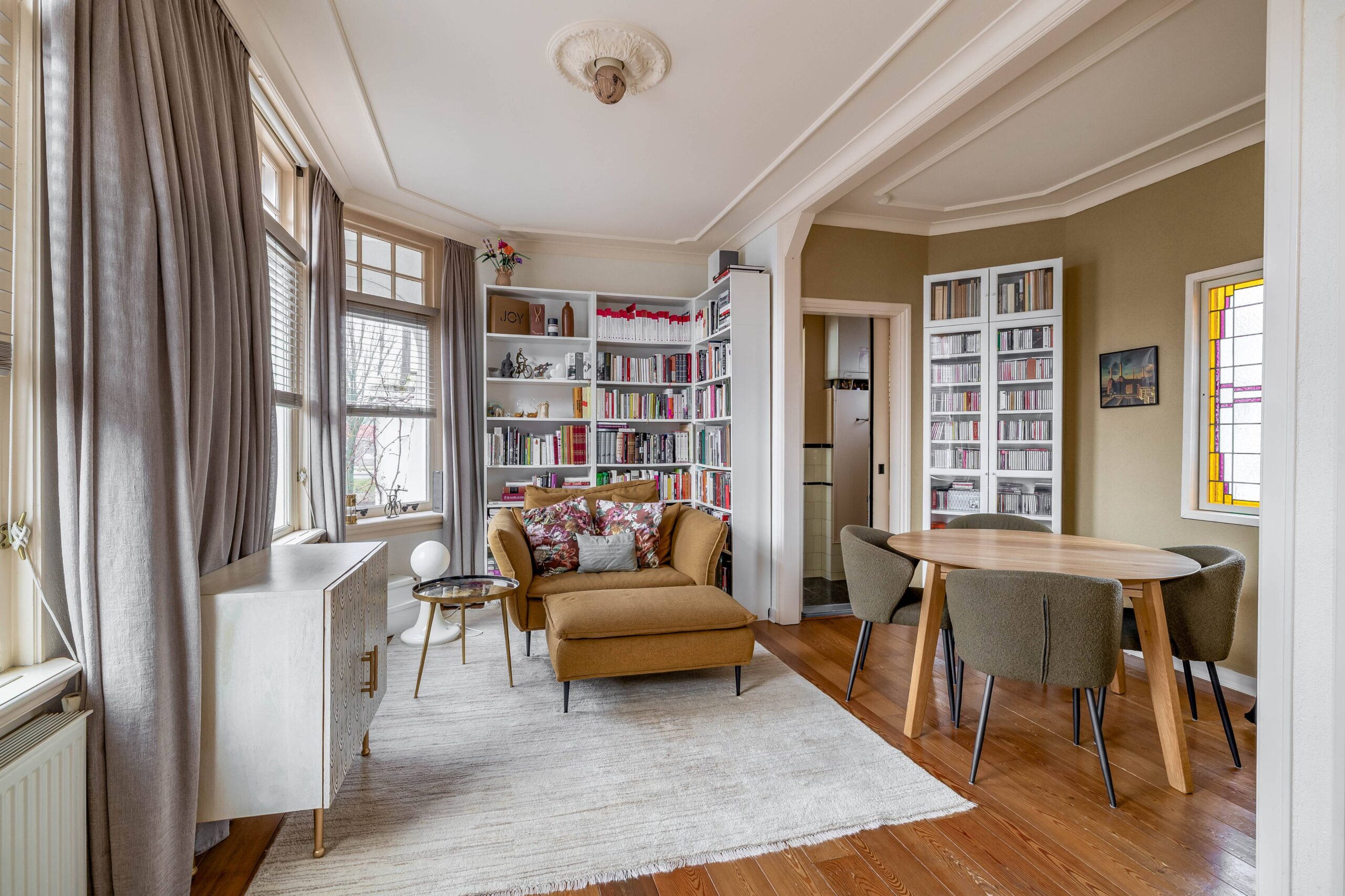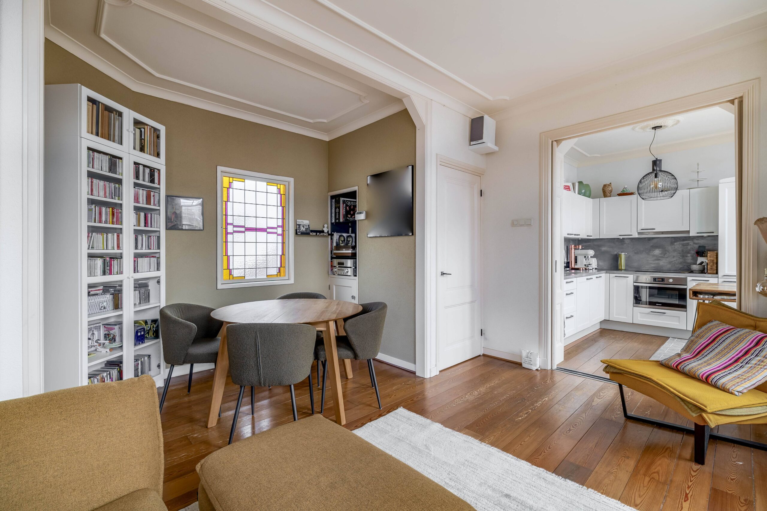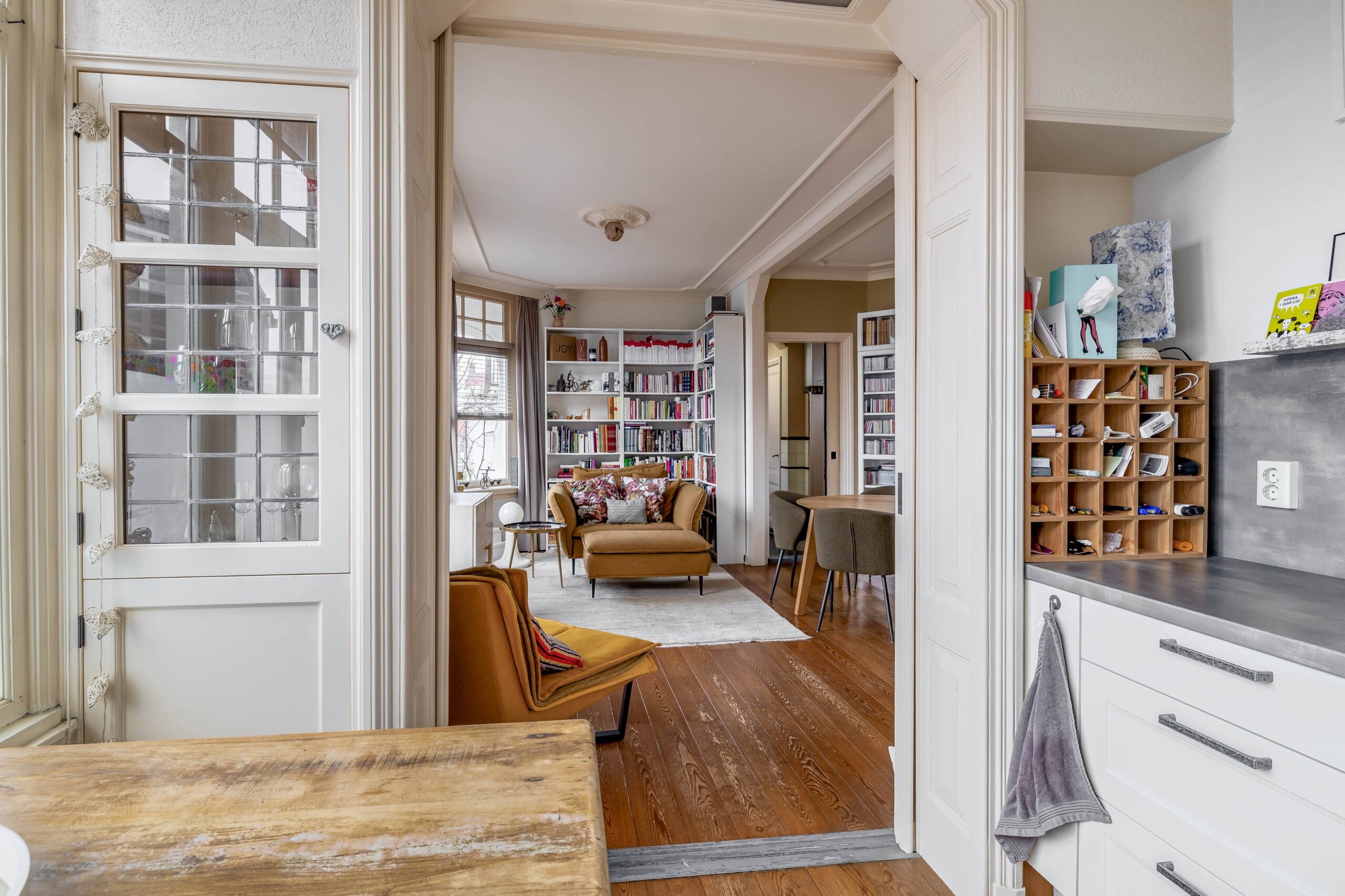 De woonkamer is op de eerste verdieping gelegen. Sfeervol en rustig. Faaie houten afwerkvloer en originele vaste kasten wordt middels suitedeuren met glas-in-lood details gescheiden van de keuken. De keuken is in 2020 vernieuwd en voorzien van een inductiekookplaat, afzuigkap, vaatwasser, combi-oven met magnetronfunctie, koelkast en vriezer. Vanuit de woonkamer toegang tot het halletje met het authentieke toilet en het balkon. Een heerlijke plek waar u de hele dag van de zon én het uitzicht kunt genieten.