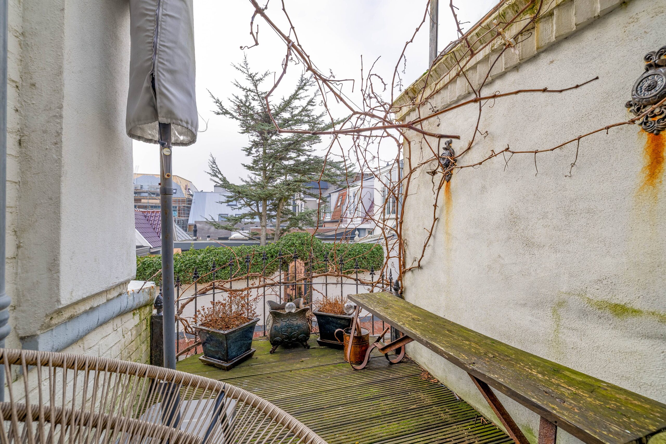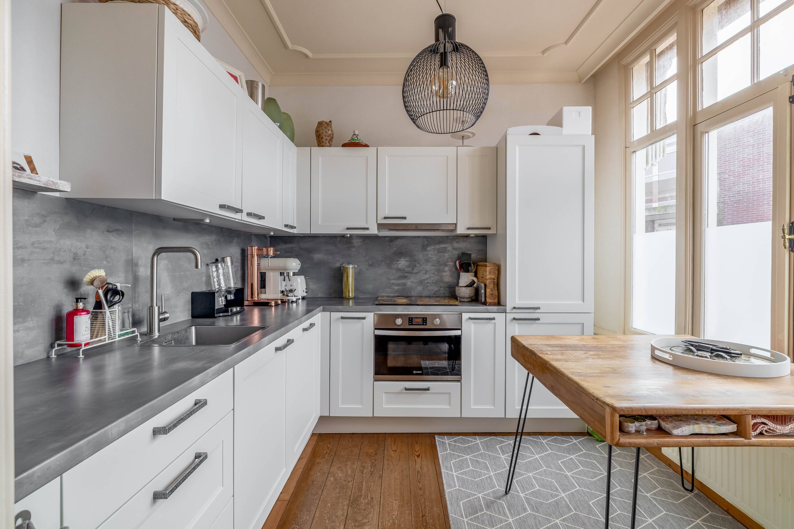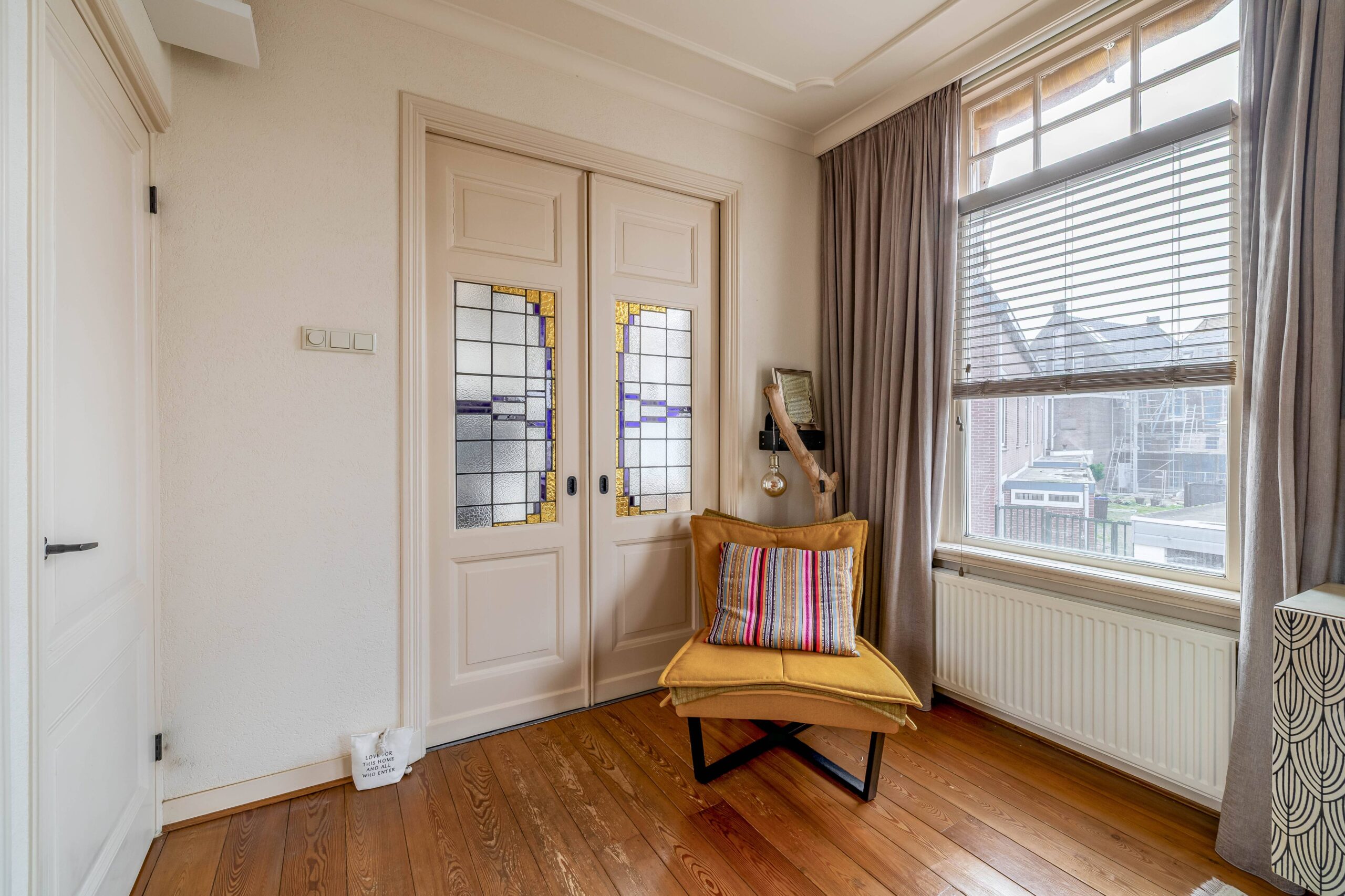 De woonkamer is op de eerste verdieping gelegen. Sfeervol en rustig. Faaie houten afwerkvloer en originele vaste kasten wordt middels suitedeuren met glas-in-lood details gescheiden van de keuken. De keuken is in 2020 vernieuwd en voorzien van een inductiekookplaat, afzuigkap, vaatwasser, combi-oven met magnetronfunctie, koelkast en vriezer. Vanuit de woonkamer toegang tot het halletje met het authentieke toilet en het balkon. Een heerlijke plek waar u de hele dag van de zon én het uitzicht kunt genieten.
