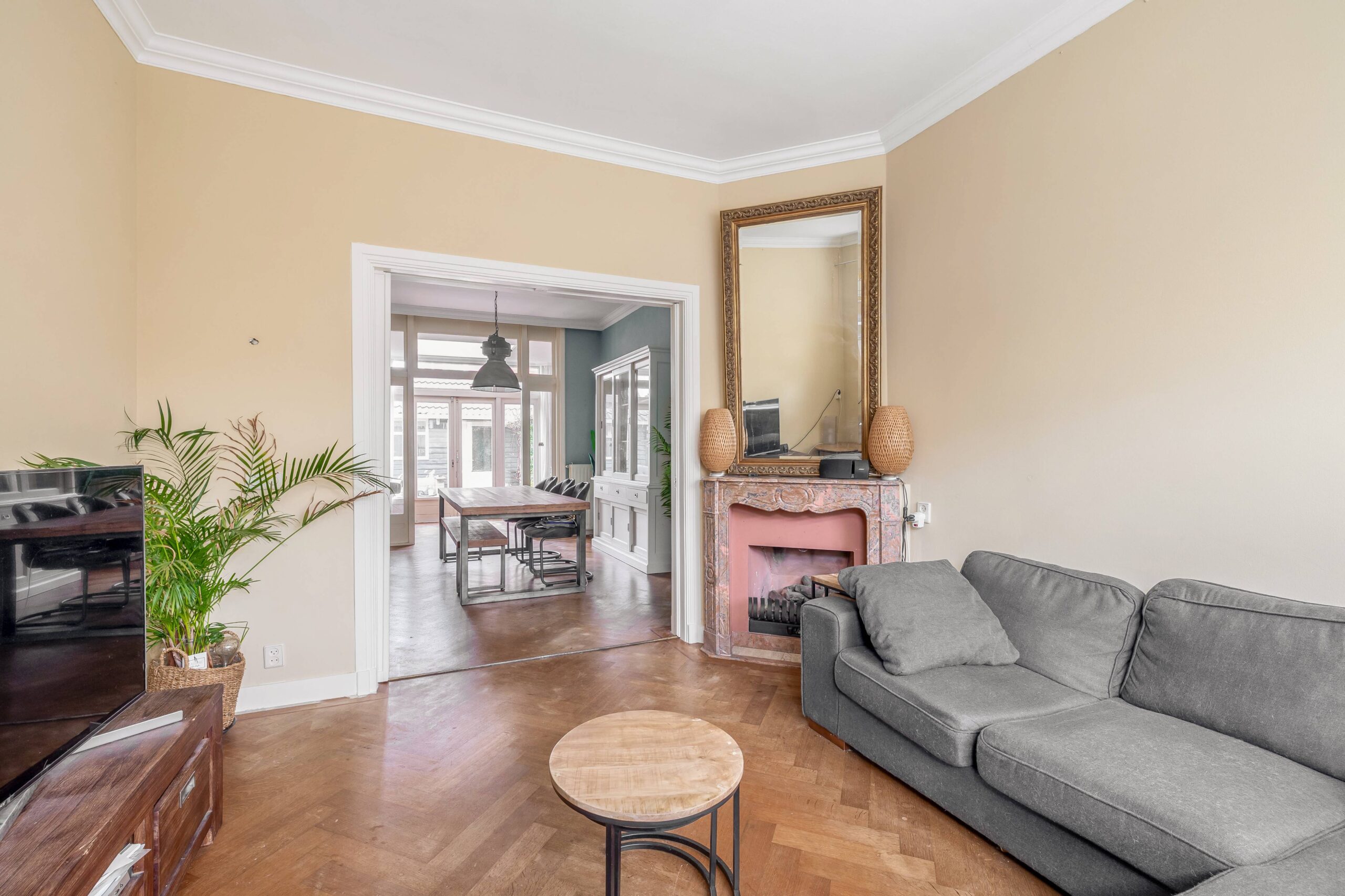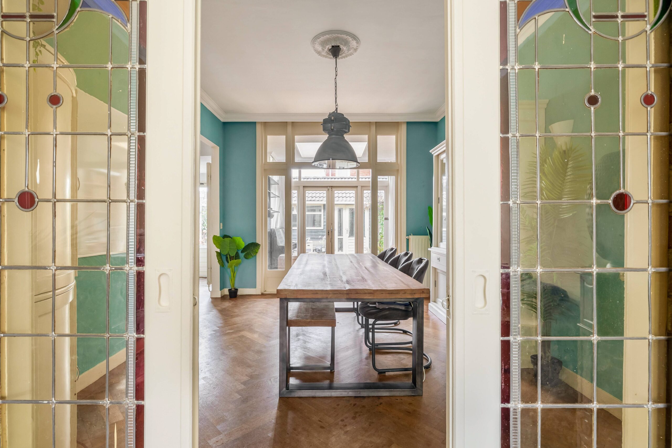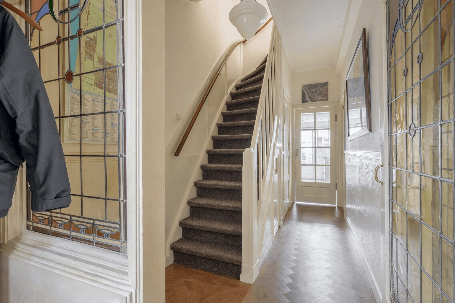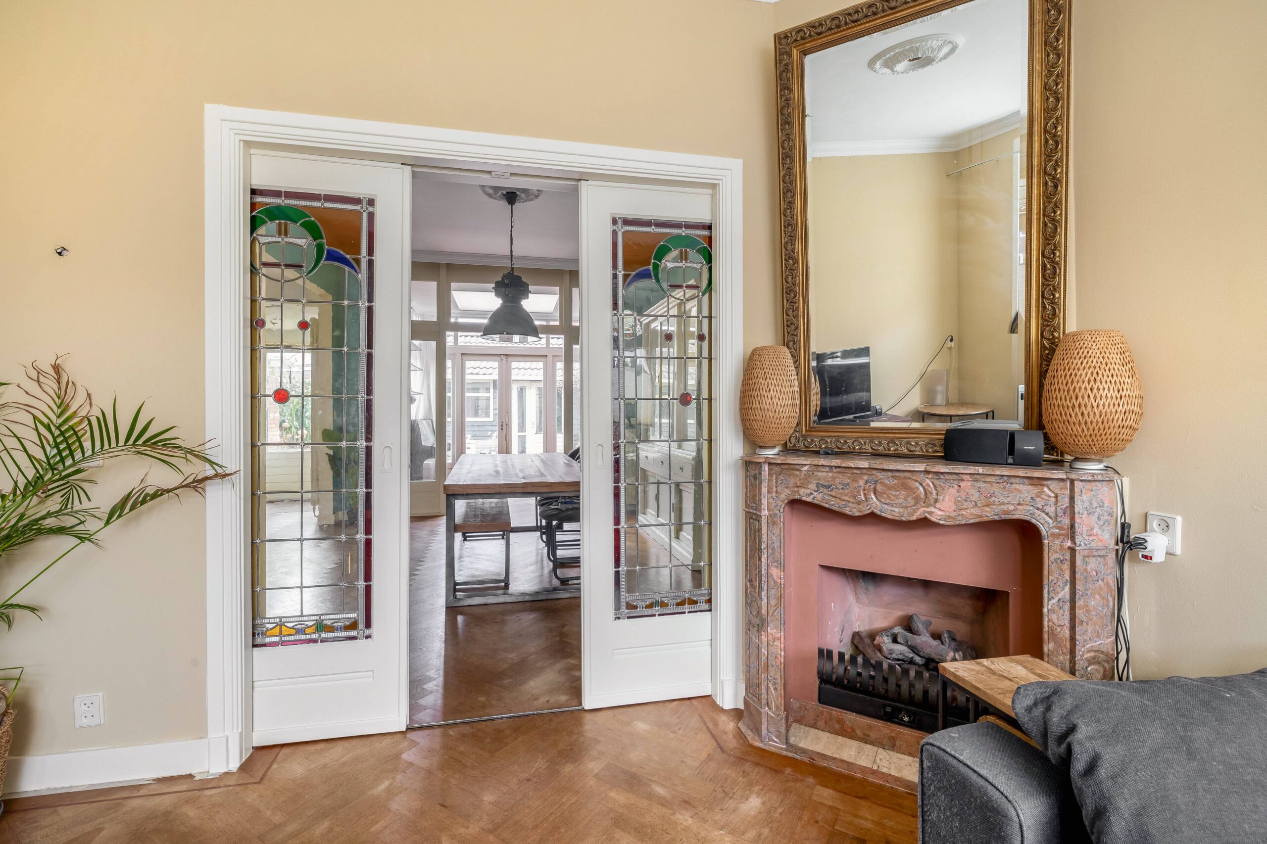 De ruime woonkamer is sfeervol met hoge plafonds en een visgraat houten vloer. De originele deuren ensuite met glas-in-lood zorgen voor een mooie scheiding in voor- en achterkamer en staan, samen met de schouw met gashaard, symbool voor het authentieke karakter van de woning. Aan de achterzijde bevinden zich een serre met dakraam en deuren naar de tuin en een open (inbouw)keuken.