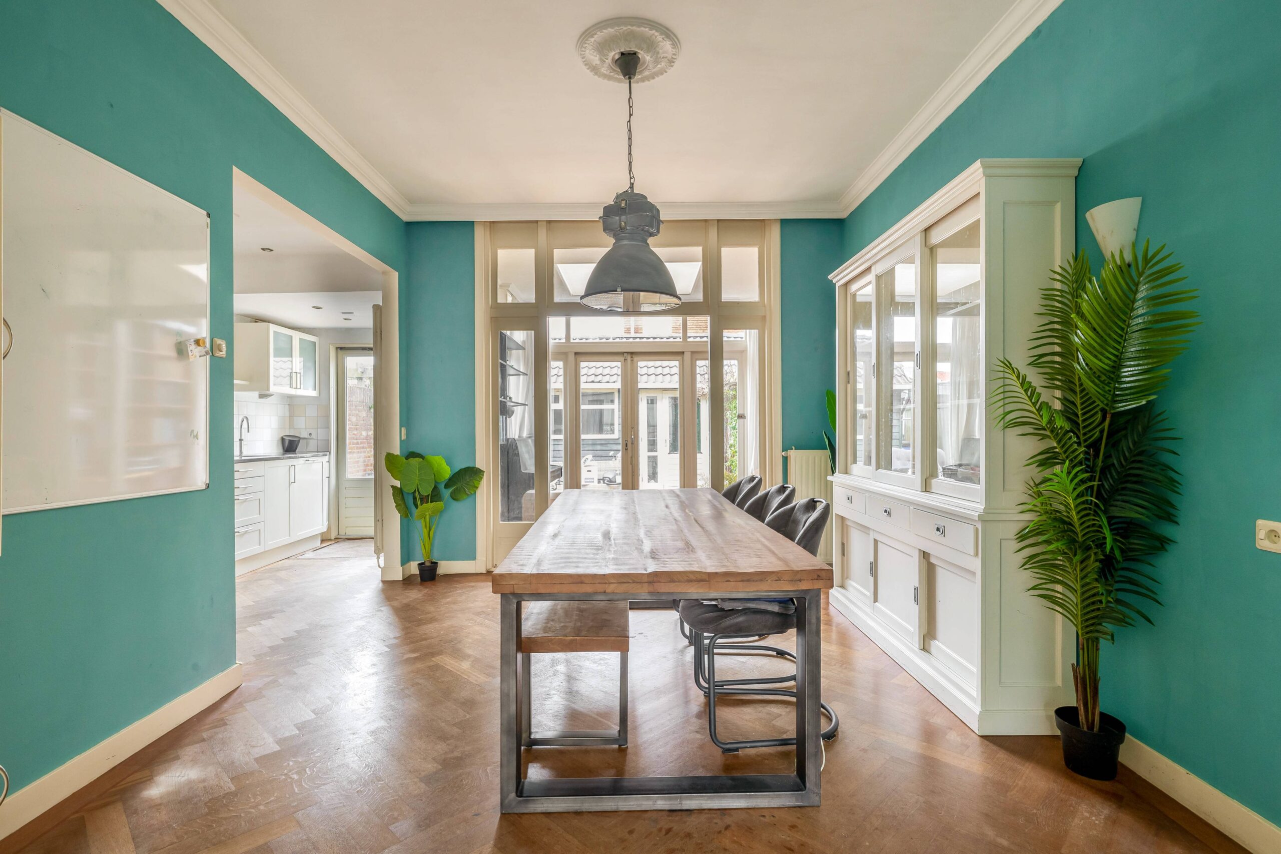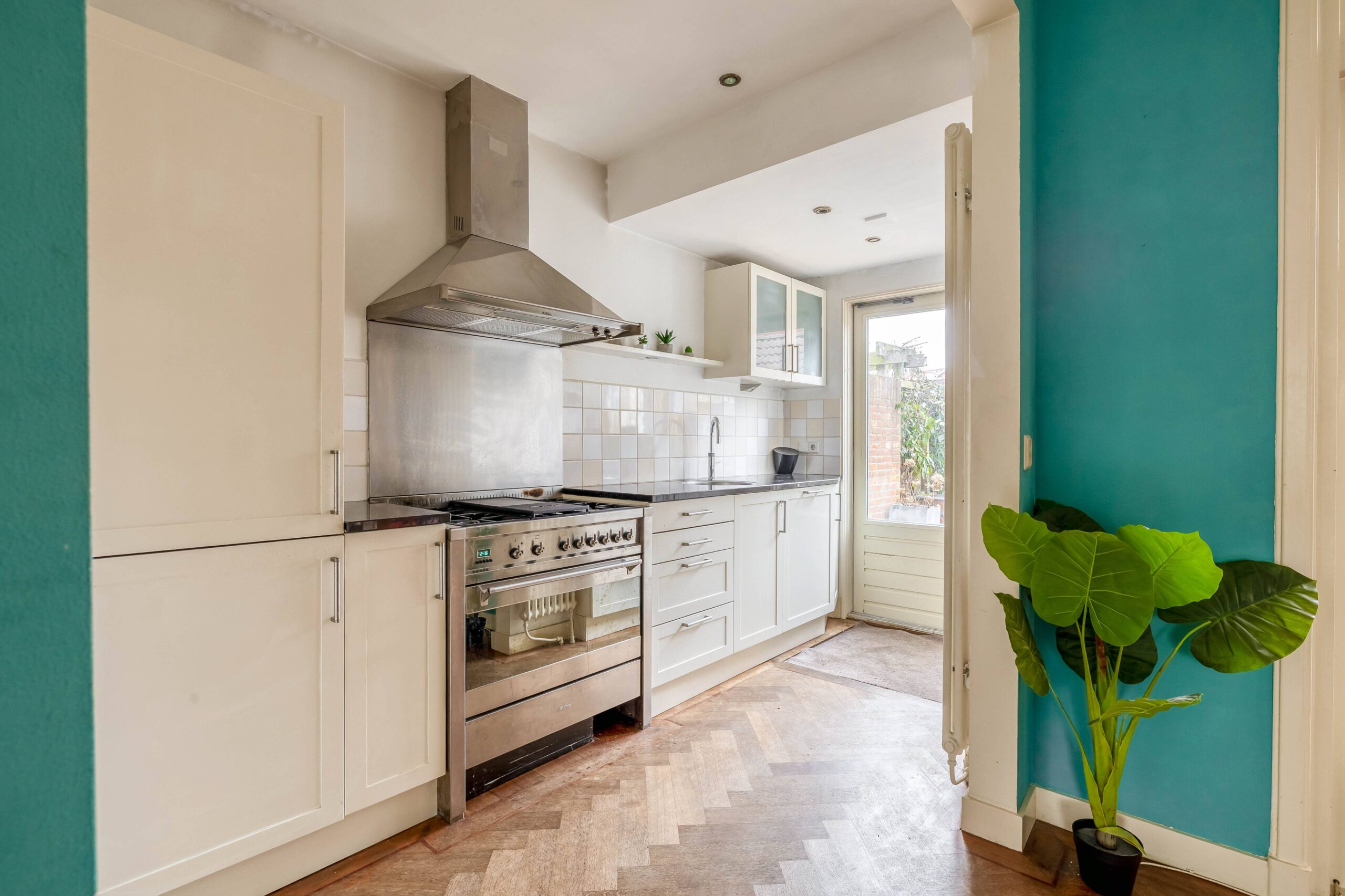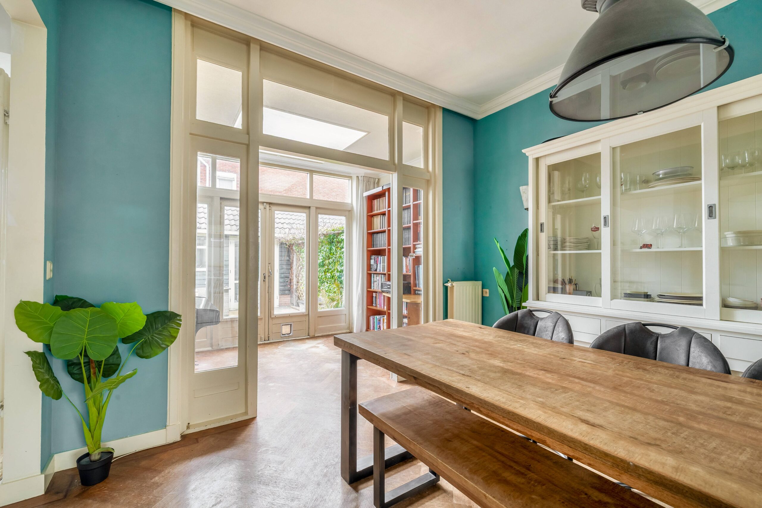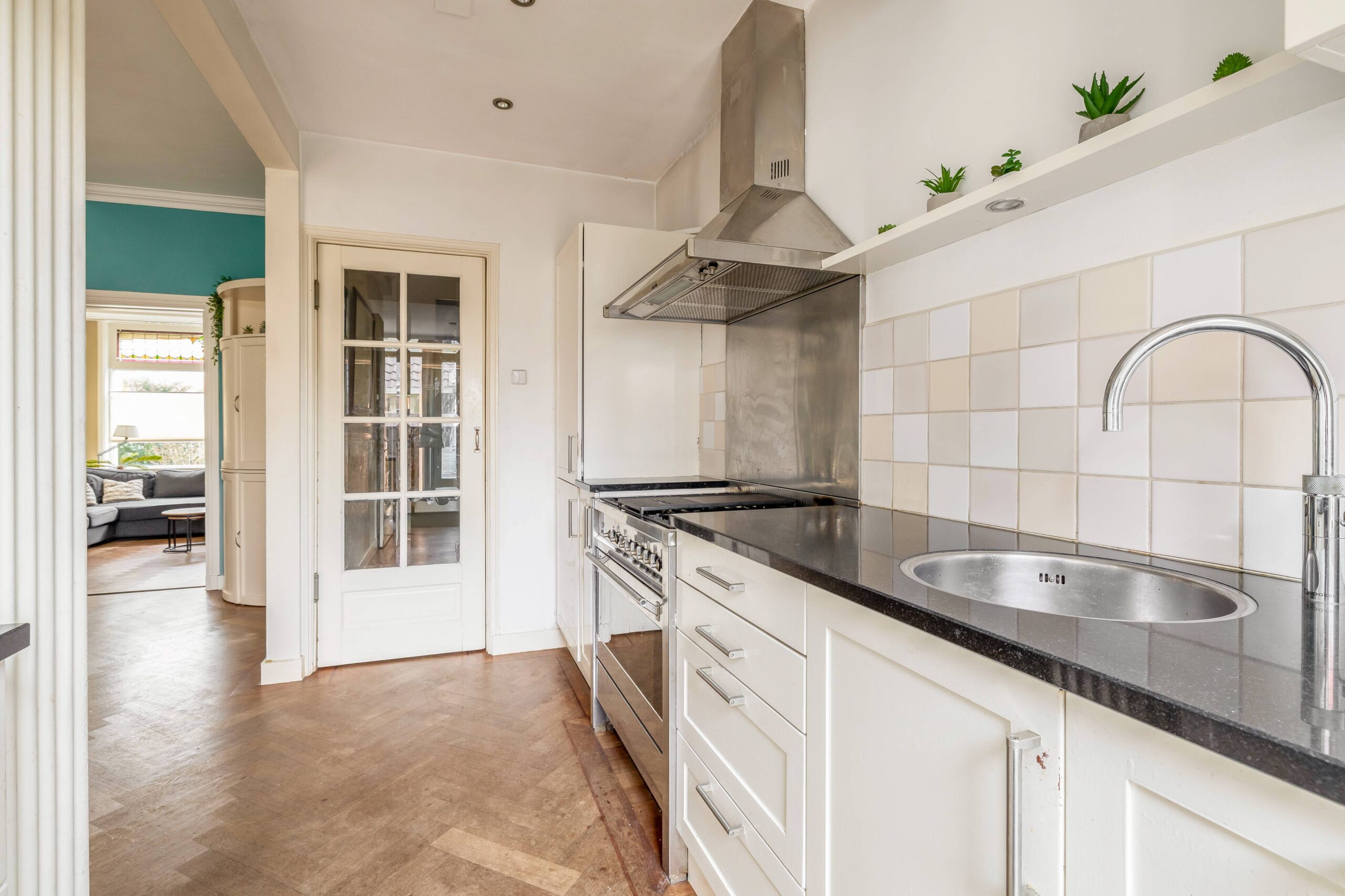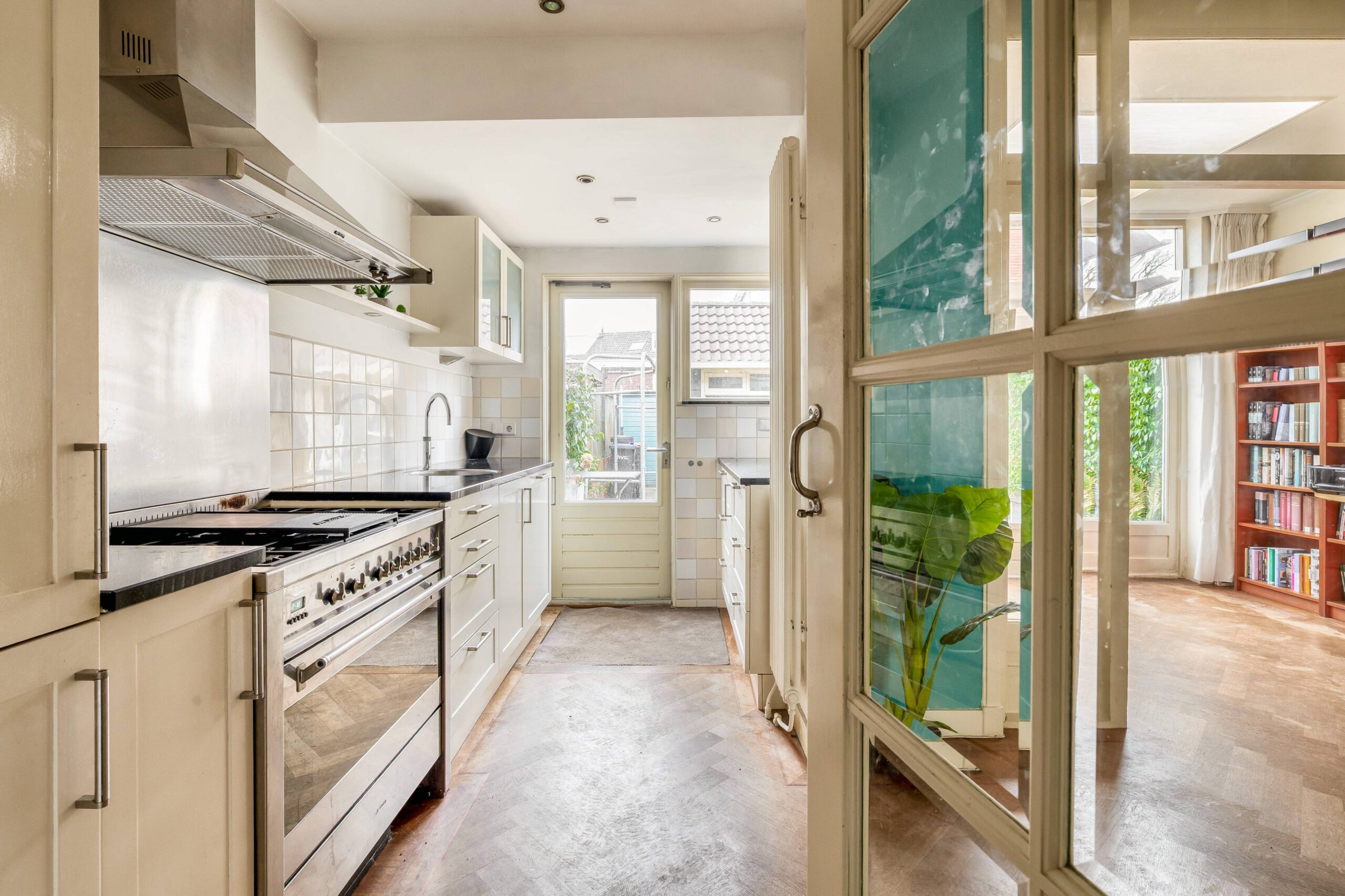 De ruime woonkamer is sfeervol met hoge plafonds en een visgraat houten vloer. De originele deuren ensuite met glas-in-lood zorgen voor een mooie scheiding in voor- en achterkamer en staan, samen met de schouw met gashaard, symbool voor het authentieke karakter van de woning. Aan de achterzijde bevinden zich een serre met dakraam en deuren naar de tuin en een open (inbouw)keuken.