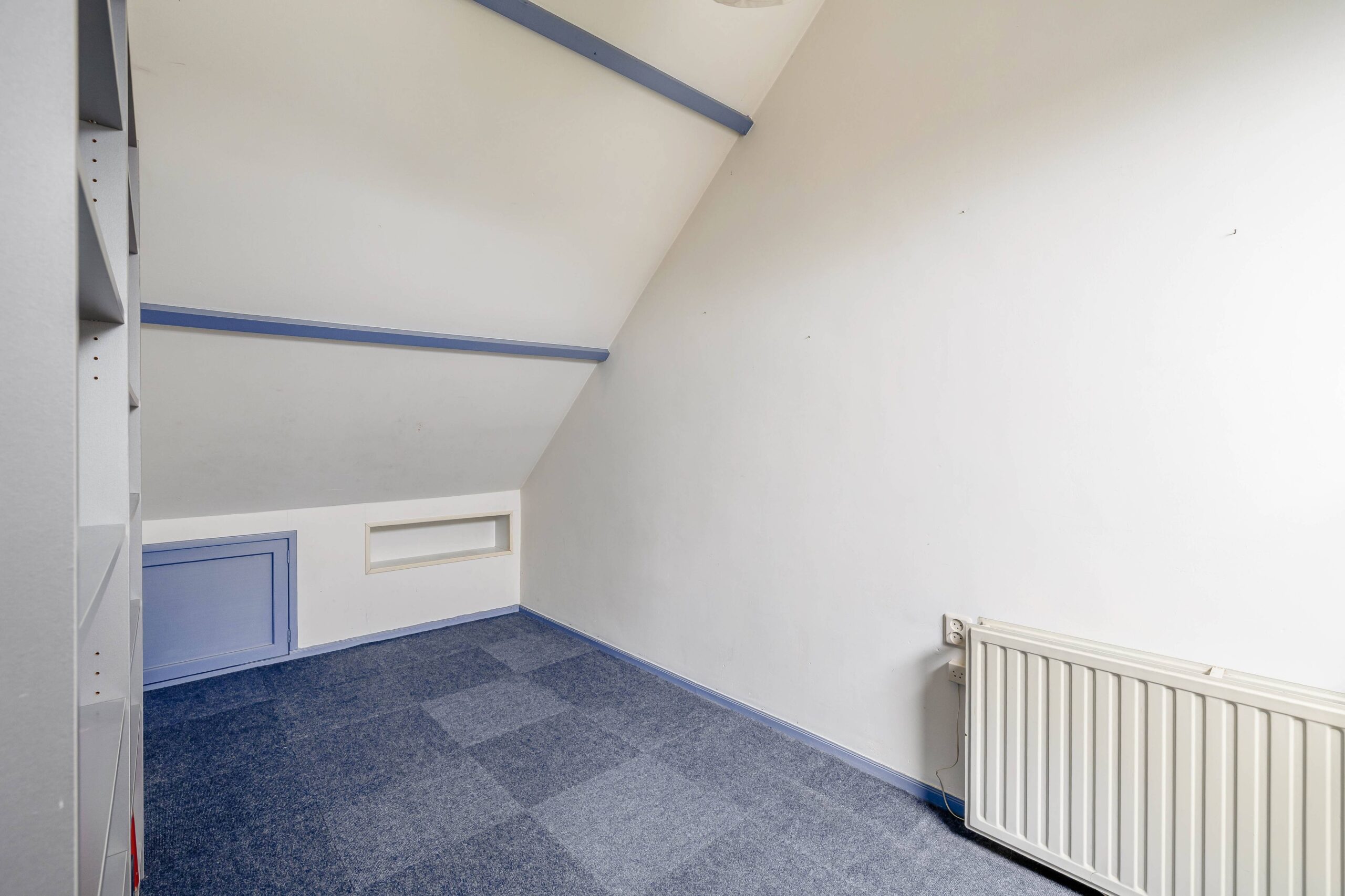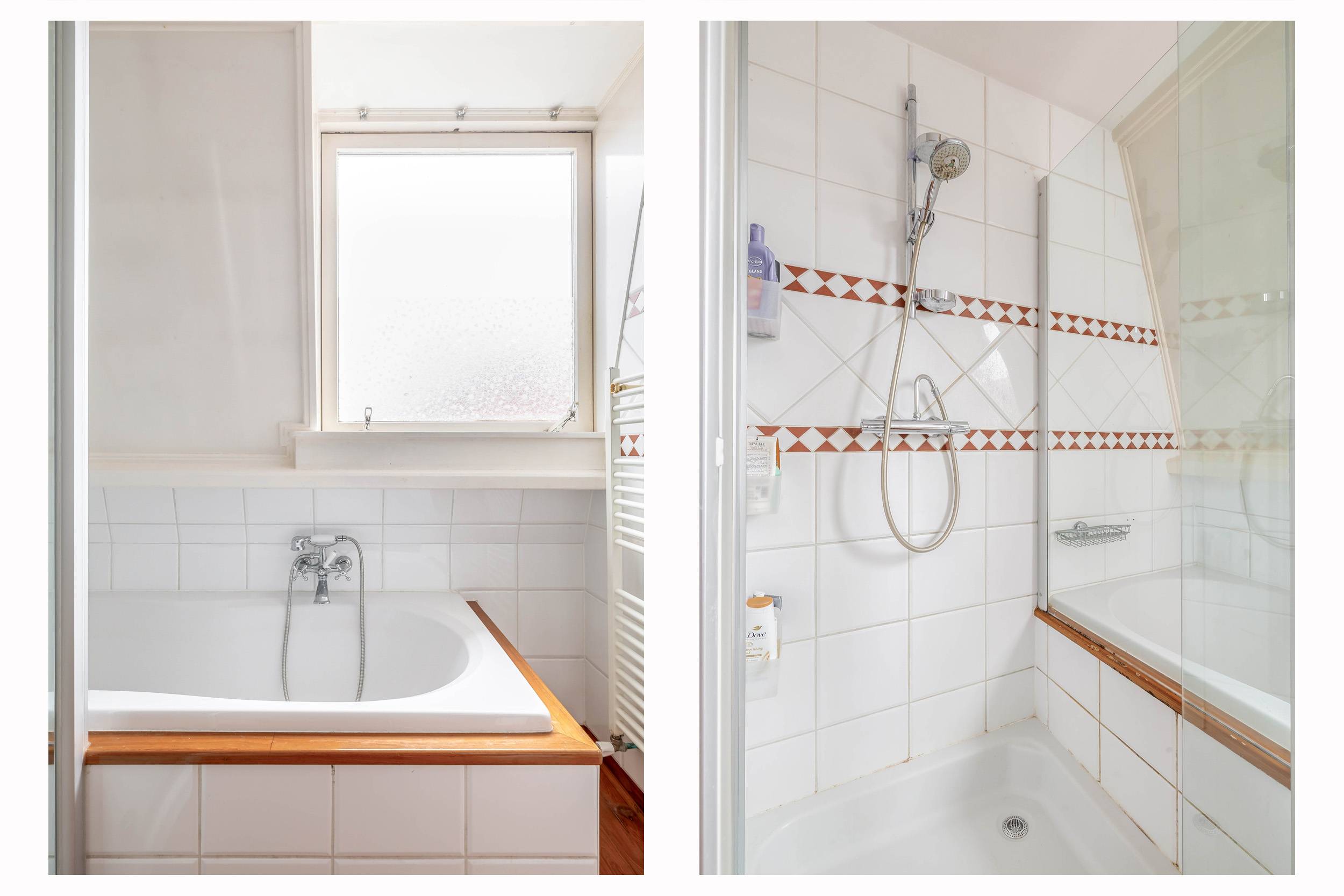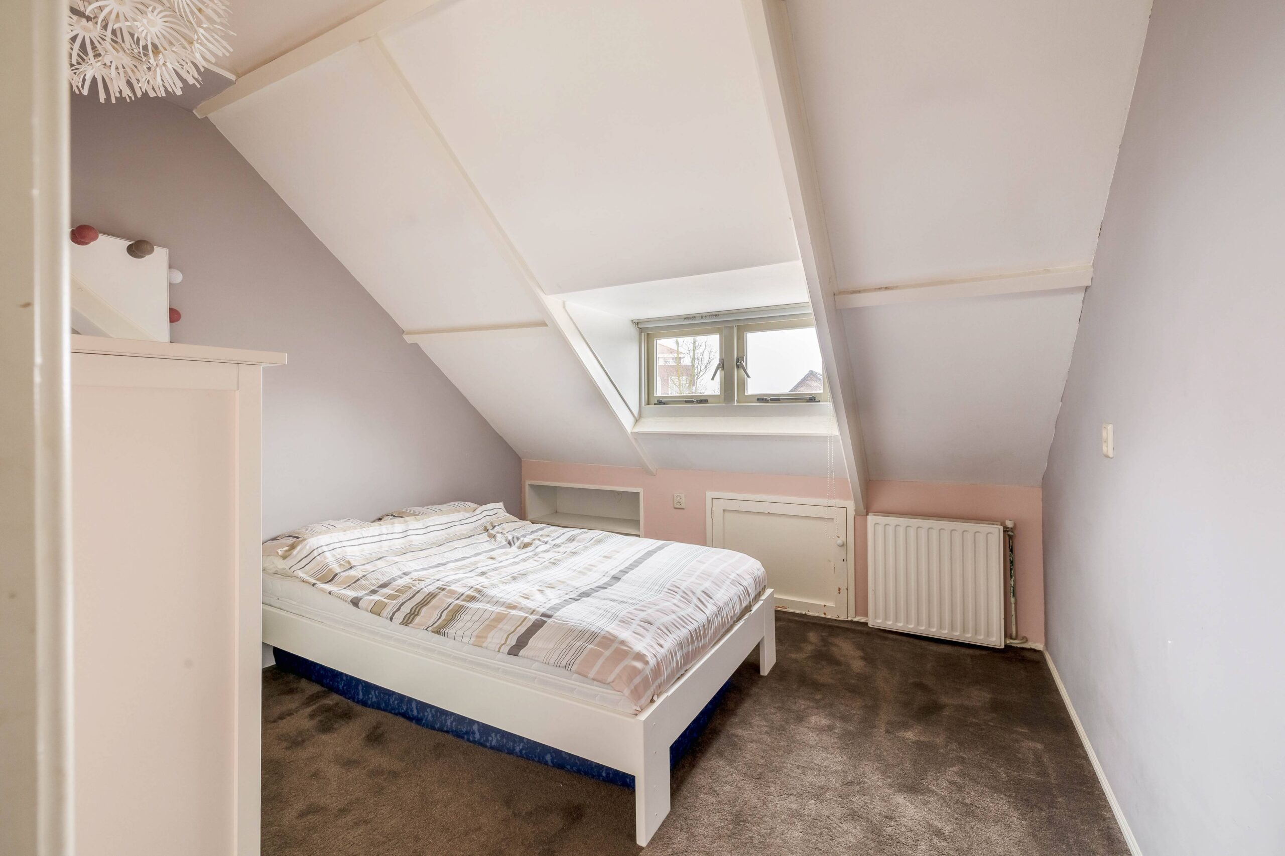 Op de eerste verdieping zijn twee riante slaapkamers, waarvan de hoofdslaapkamer een inloopkast heeft, en een badkamer, ingericht met een ligbad, douchecabine, 2e toilet en wastafel. Via een vaste trap kom je vervolgens uit op de zolderverdieping, die niet alleen nog twee slaapkamers bevat maar ook een voorzolder, met bergruimte en de opstelling van de CV ketel (’16) en de wasmachine. De slaapkamers hebben beide een dakraam en veel bergruimte achter de knieschotten.