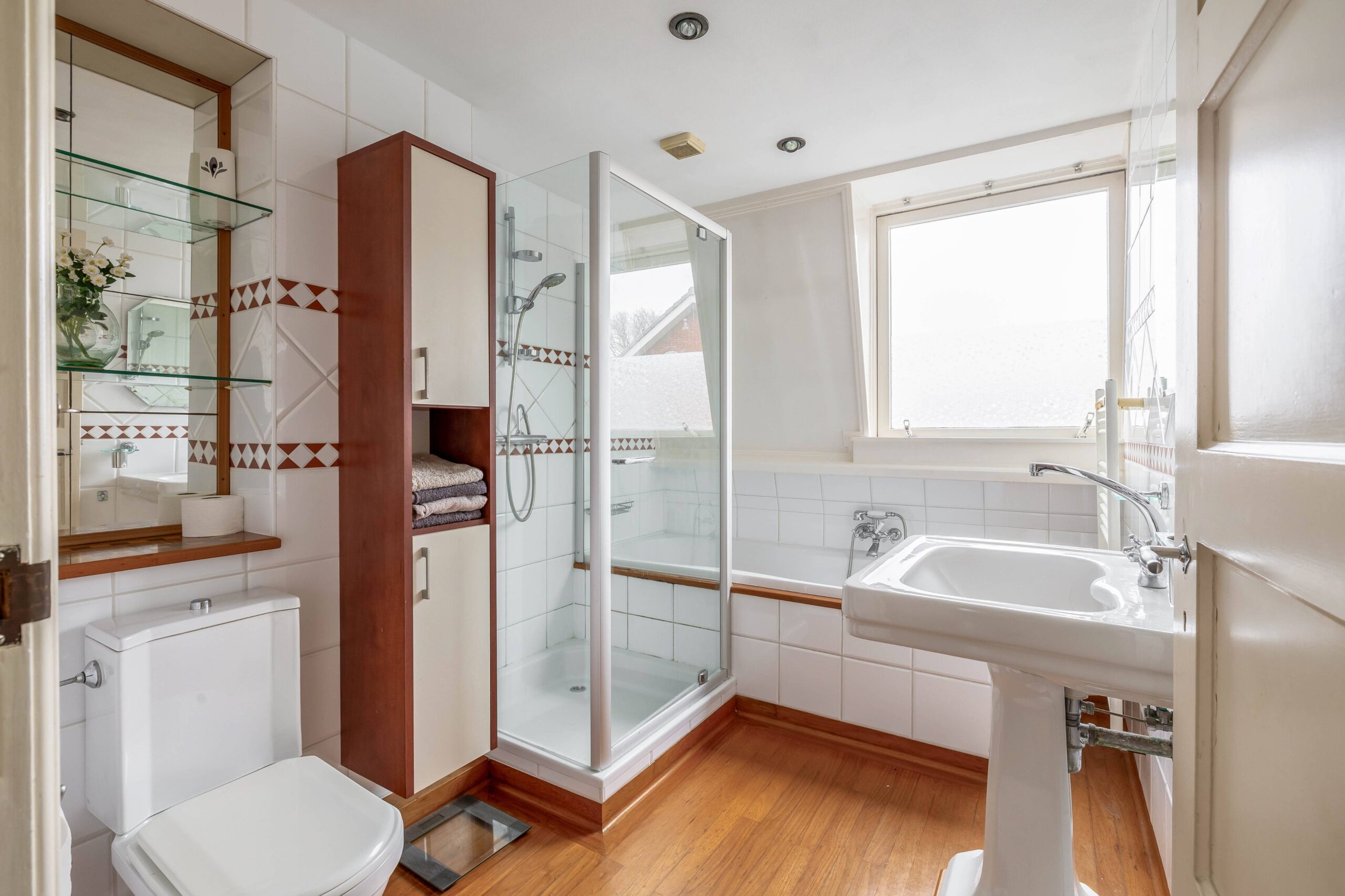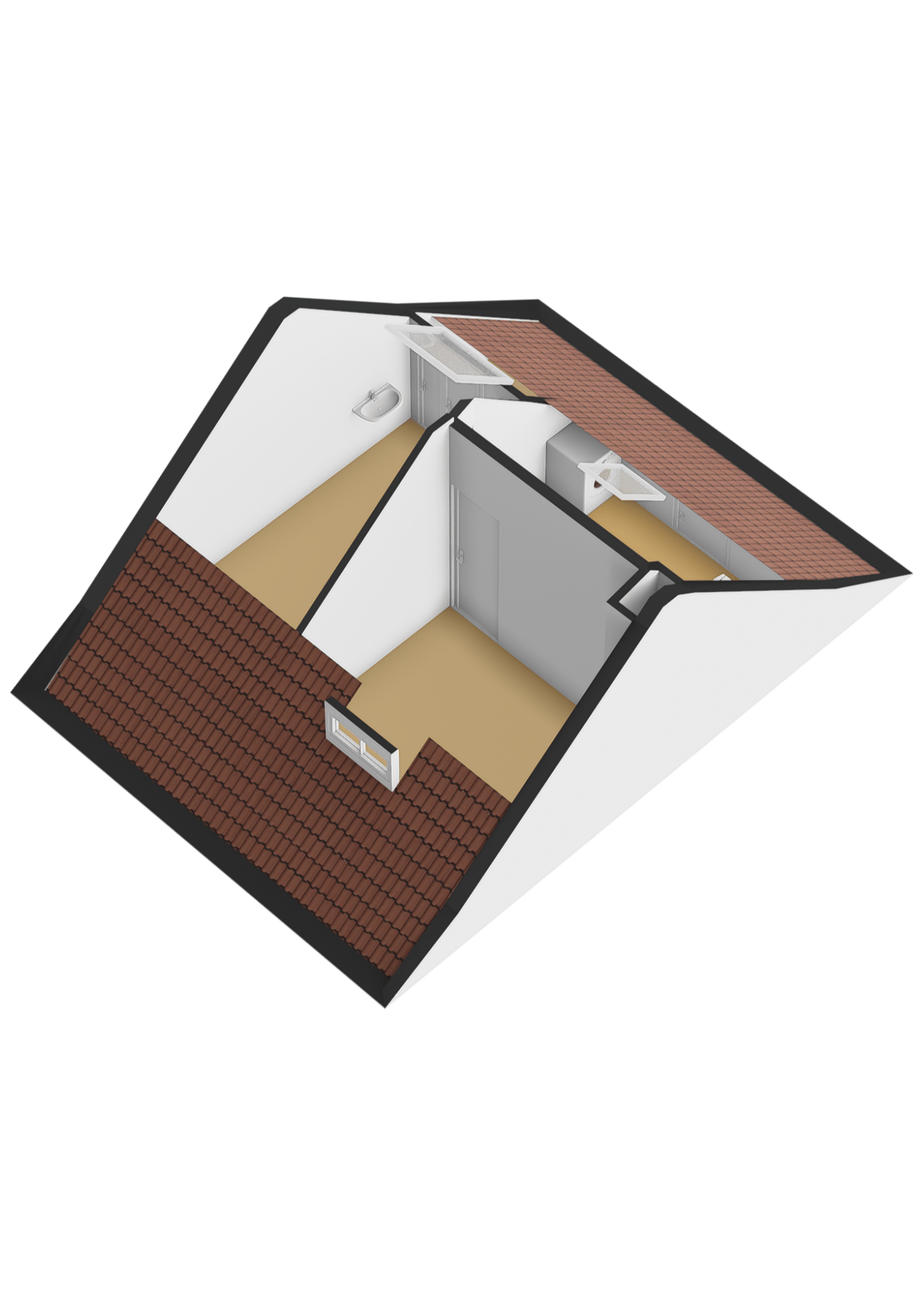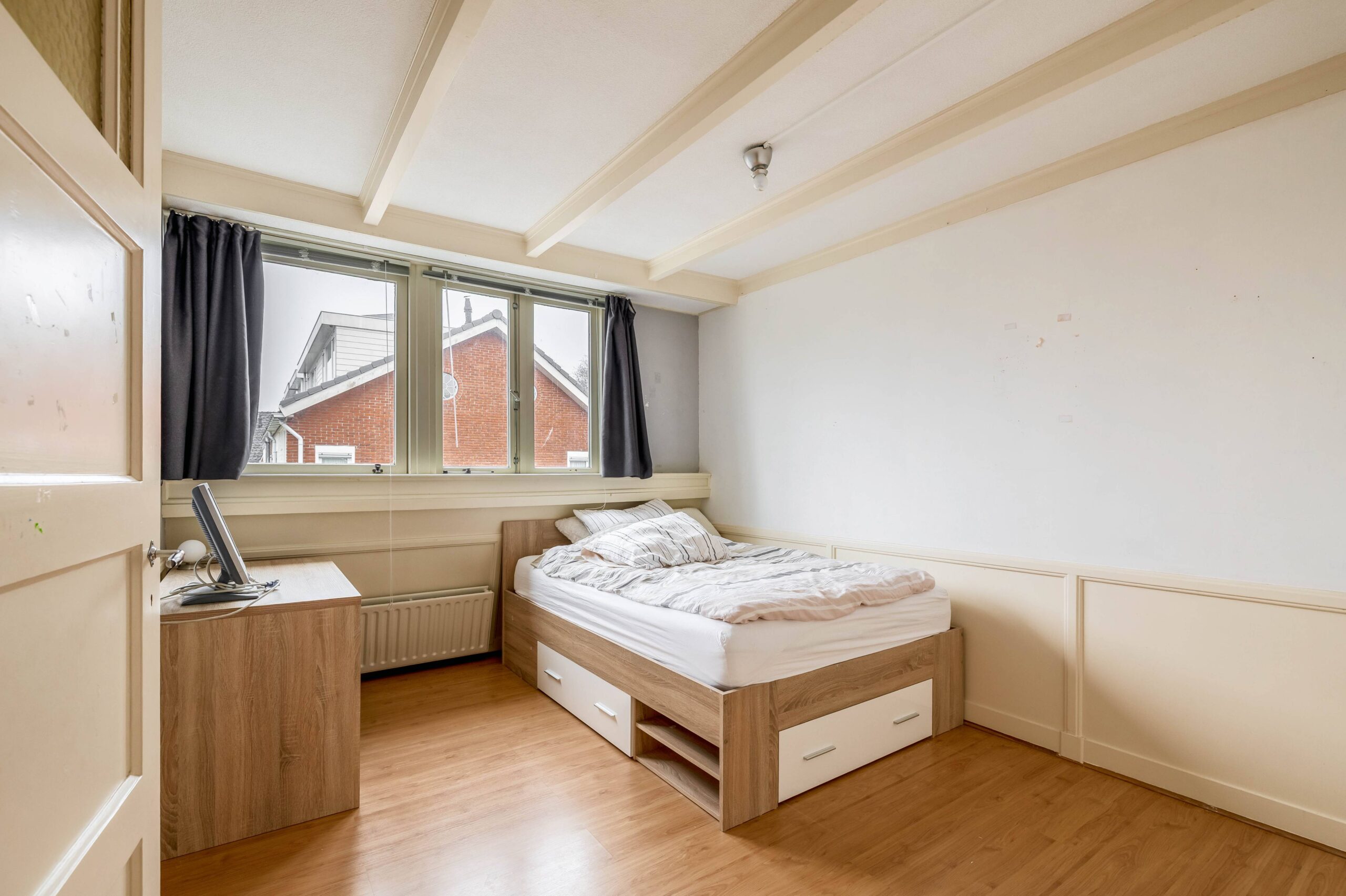 Op de eerste verdieping zijn twee riante slaapkamers, waarvan de hoofdslaapkamer een inloopkast heeft, en een badkamer, ingericht met een ligbad, douchecabine, 2e toilet en wastafel. Via een vaste trap kom je vervolgens uit op de zolderverdieping, die niet alleen nog twee slaapkamers bevat maar ook een voorzolder, met bergruimte en de opstelling van de CV ketel (’16) en de wasmachine. De slaapkamers hebben beide een dakraam en veel bergruimte achter de knieschotten.