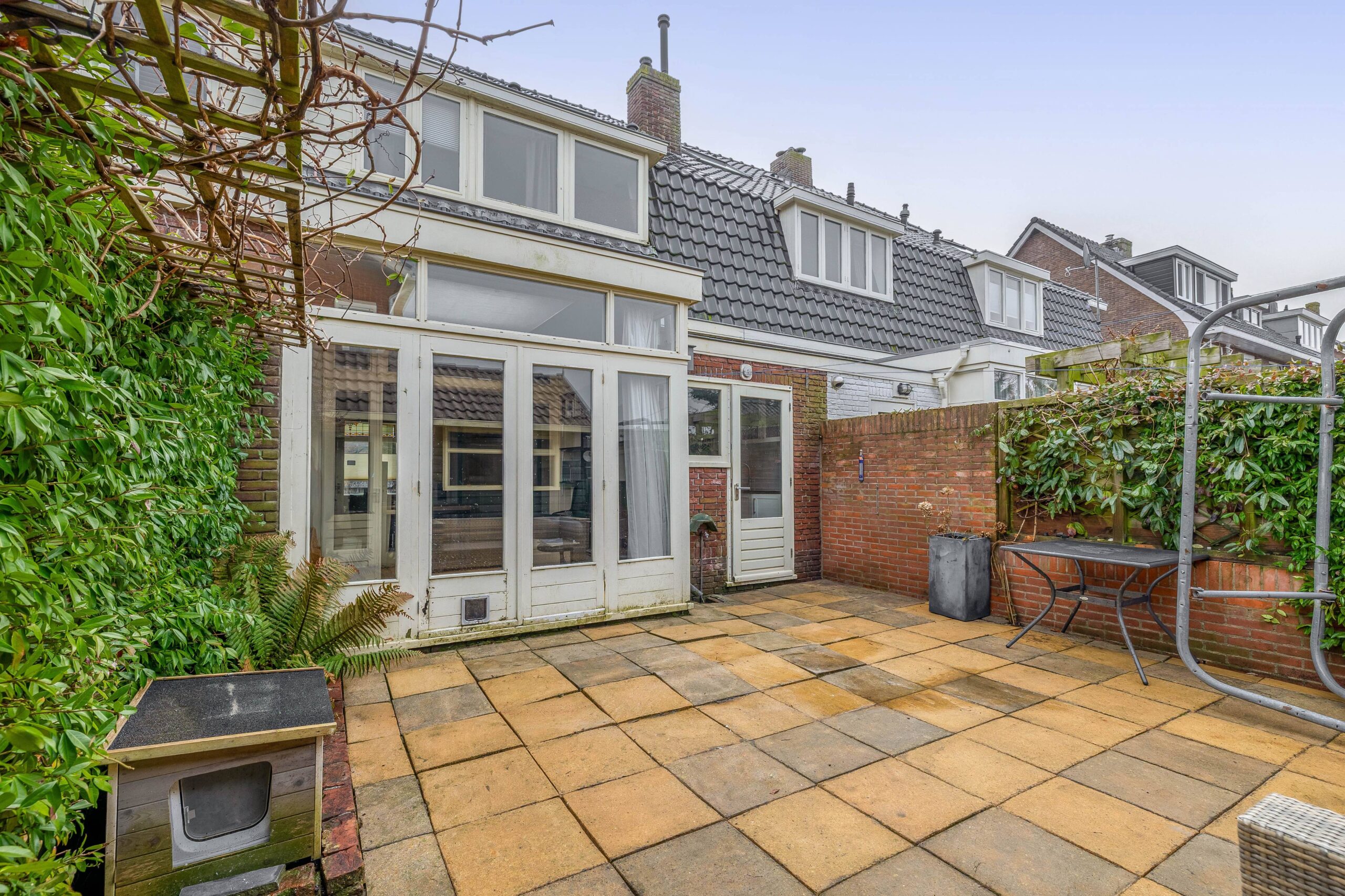 De achtertuin heeft een grote stenen schuur (die is aangesloten op de centrale verwarming van het huis) en een achterom naar de steeg.