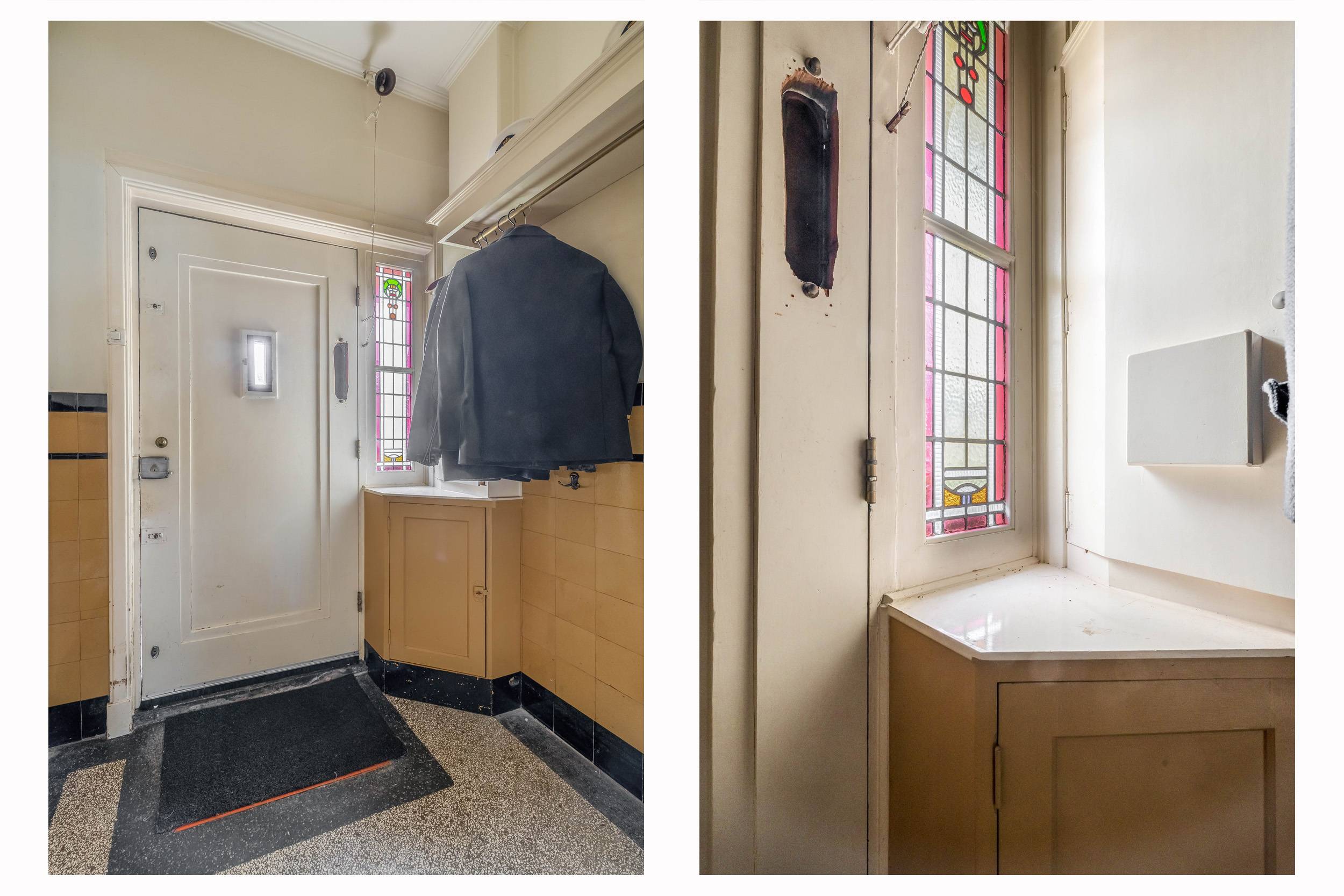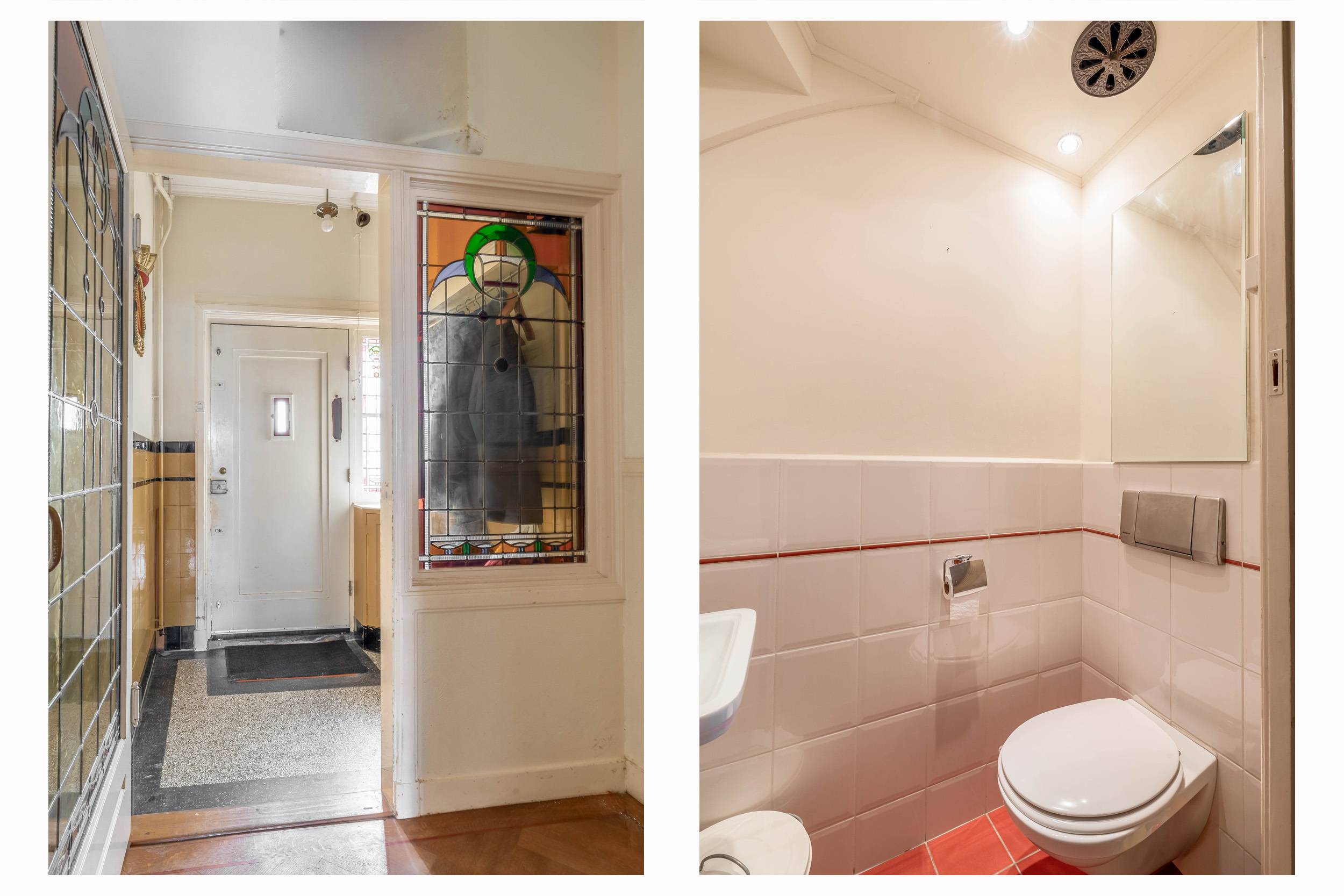 Via de onlangs opnieuw geschuurde en gelakte voordeur kom je binnen in de hal met granito vloer en kapstok, die via een klapdeur leidt naar de gang met de trap en het toilet met vrijdragend closet en fontein.