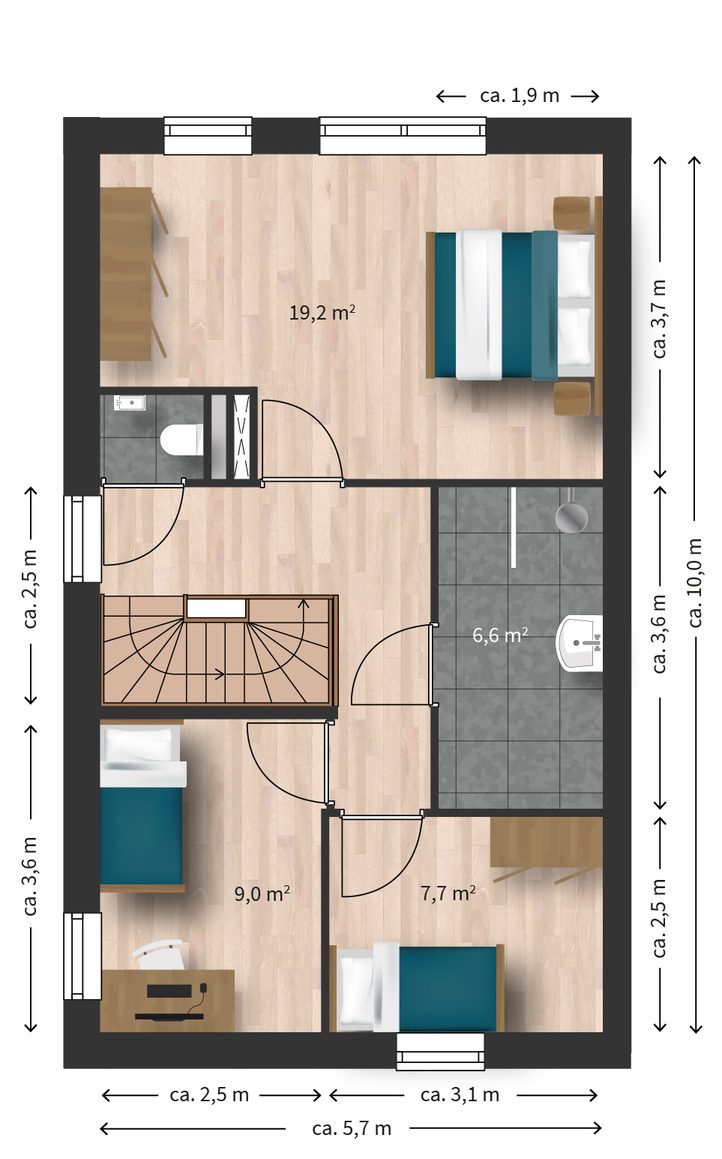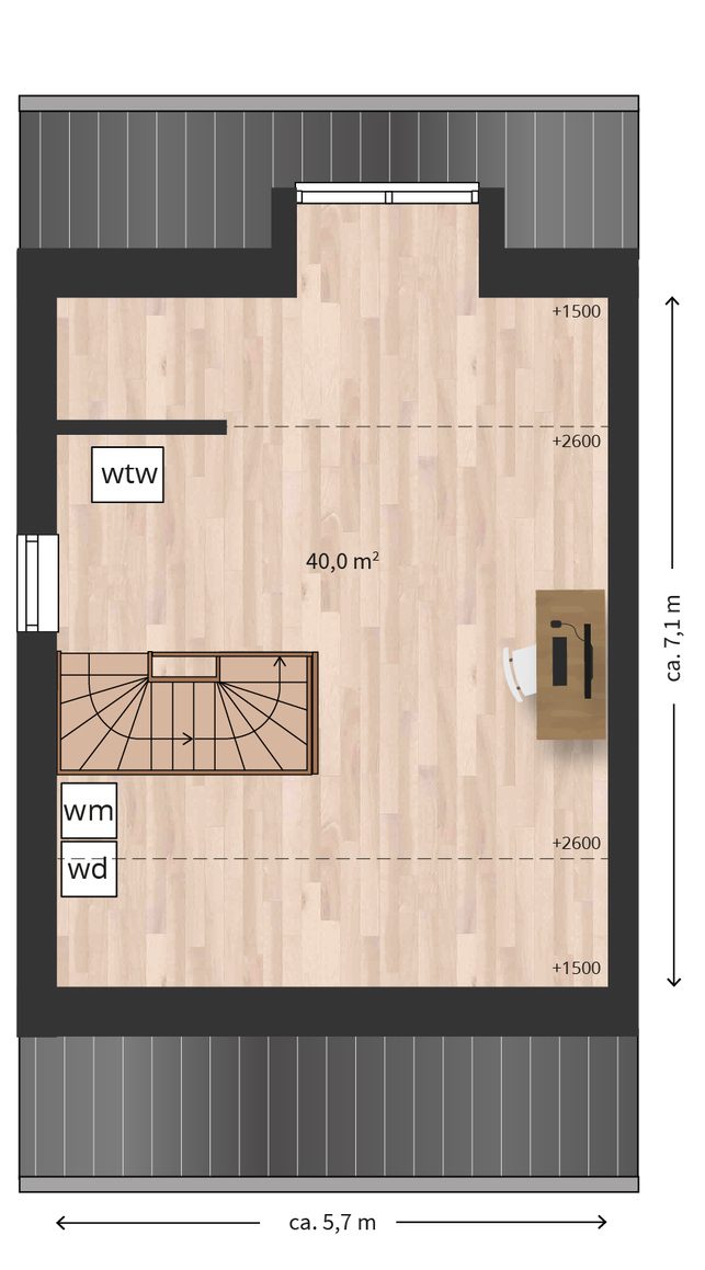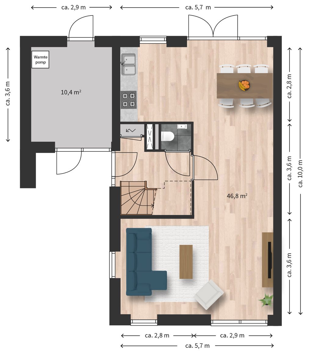 Binnen heeft de woning een efficiënte indeling. Op de begane grond is een woonkamer met open keuken aan de voorzijde. In de hal bevindt zich een toilet en de technische ruimte voor de warmtepomp. De zolderverdieping kan optioneel worden ingericht tot vierde slaapkamer.