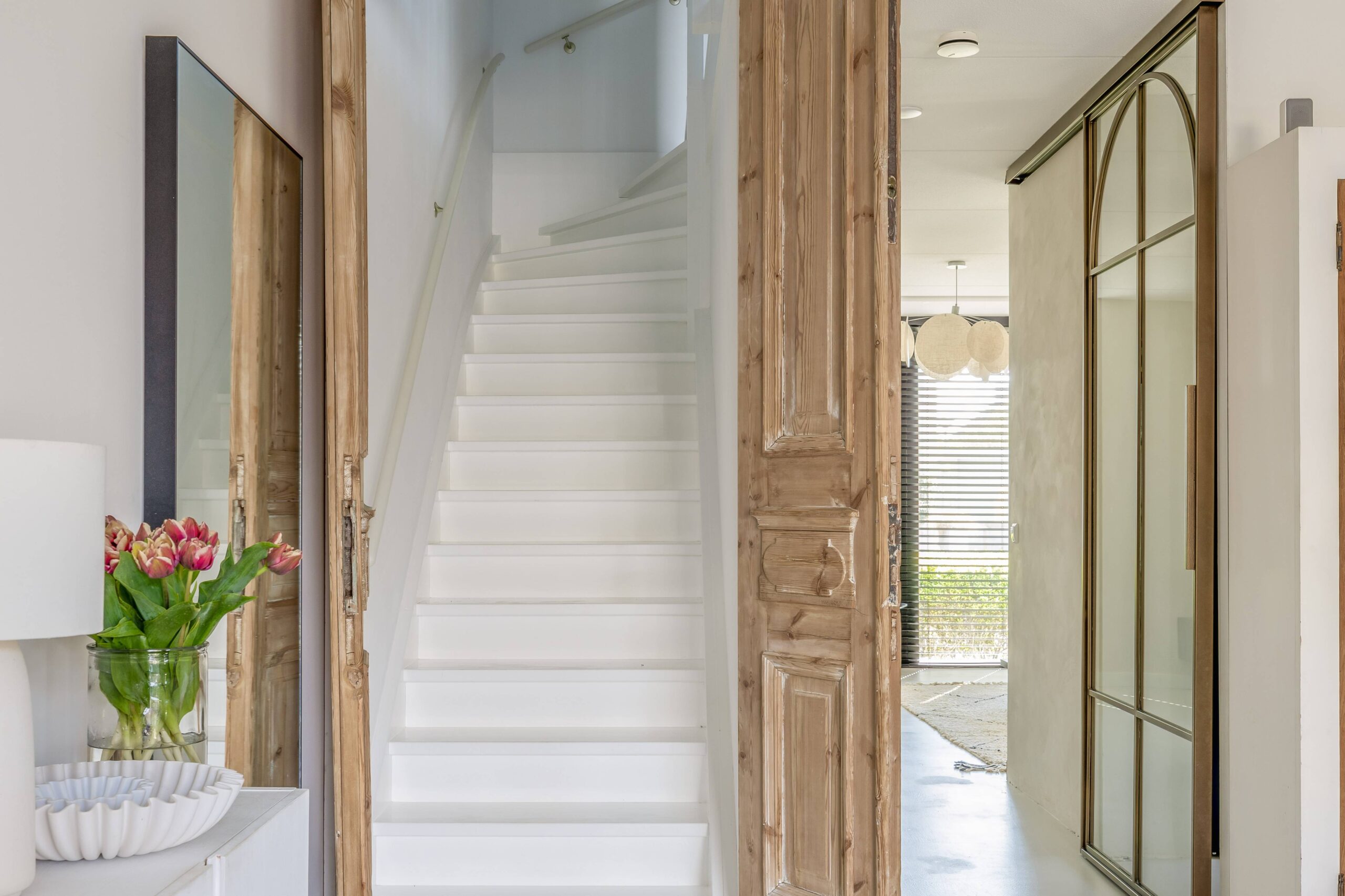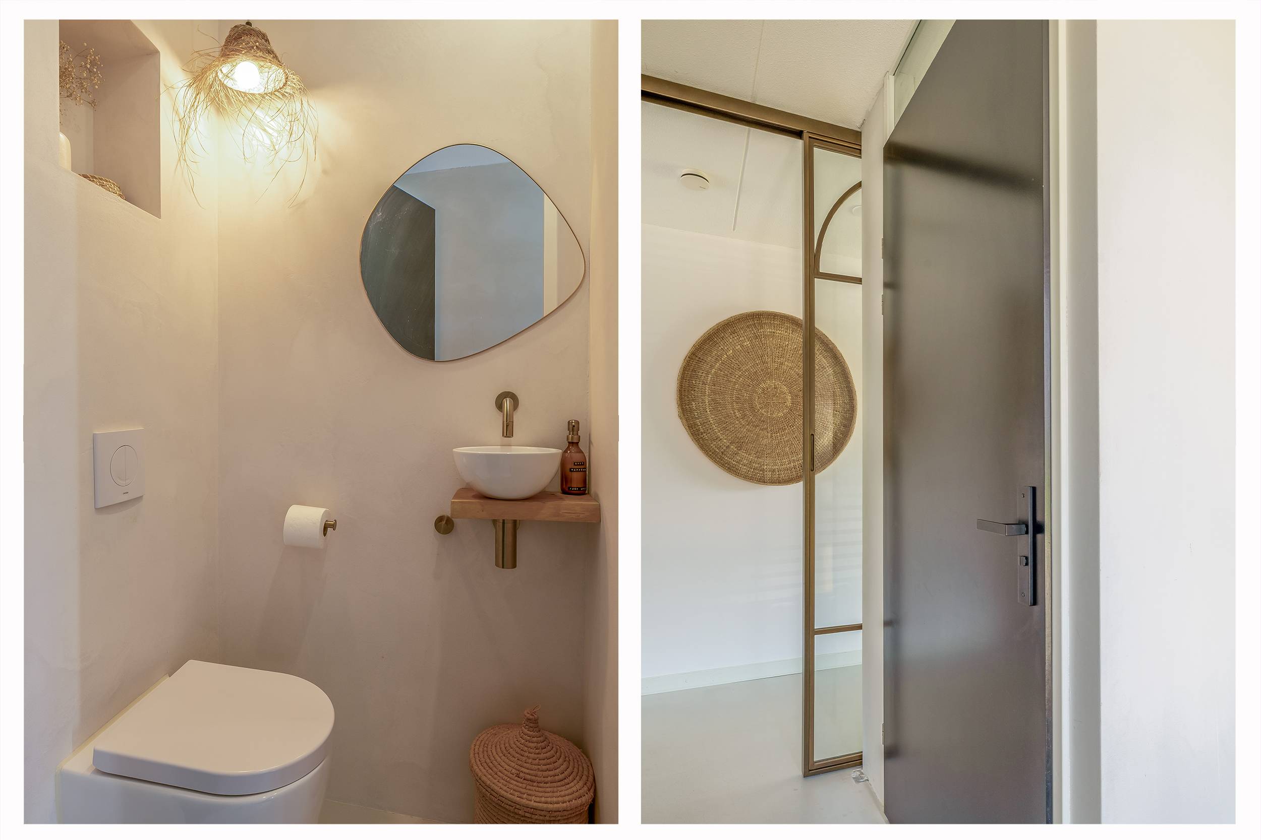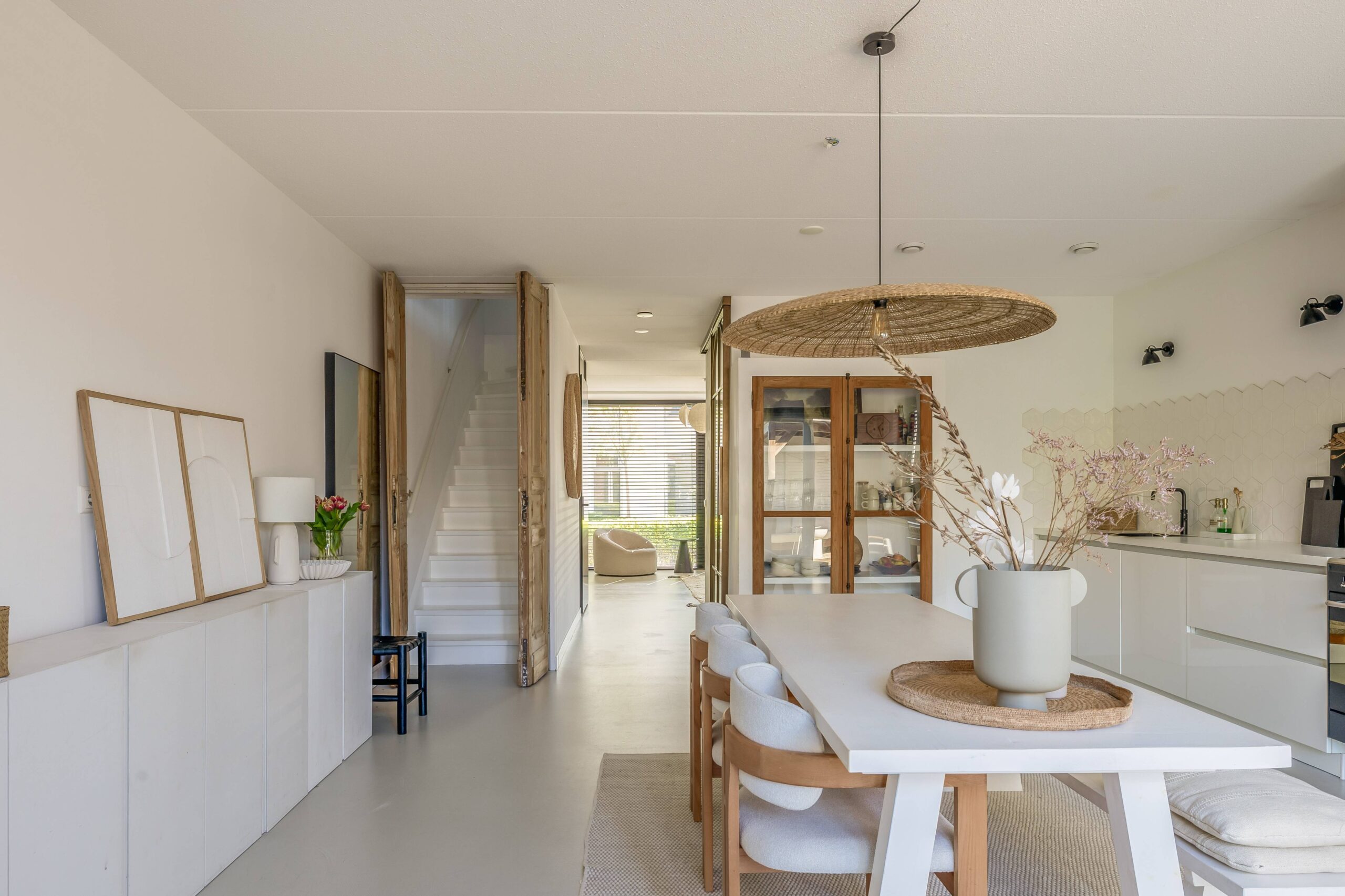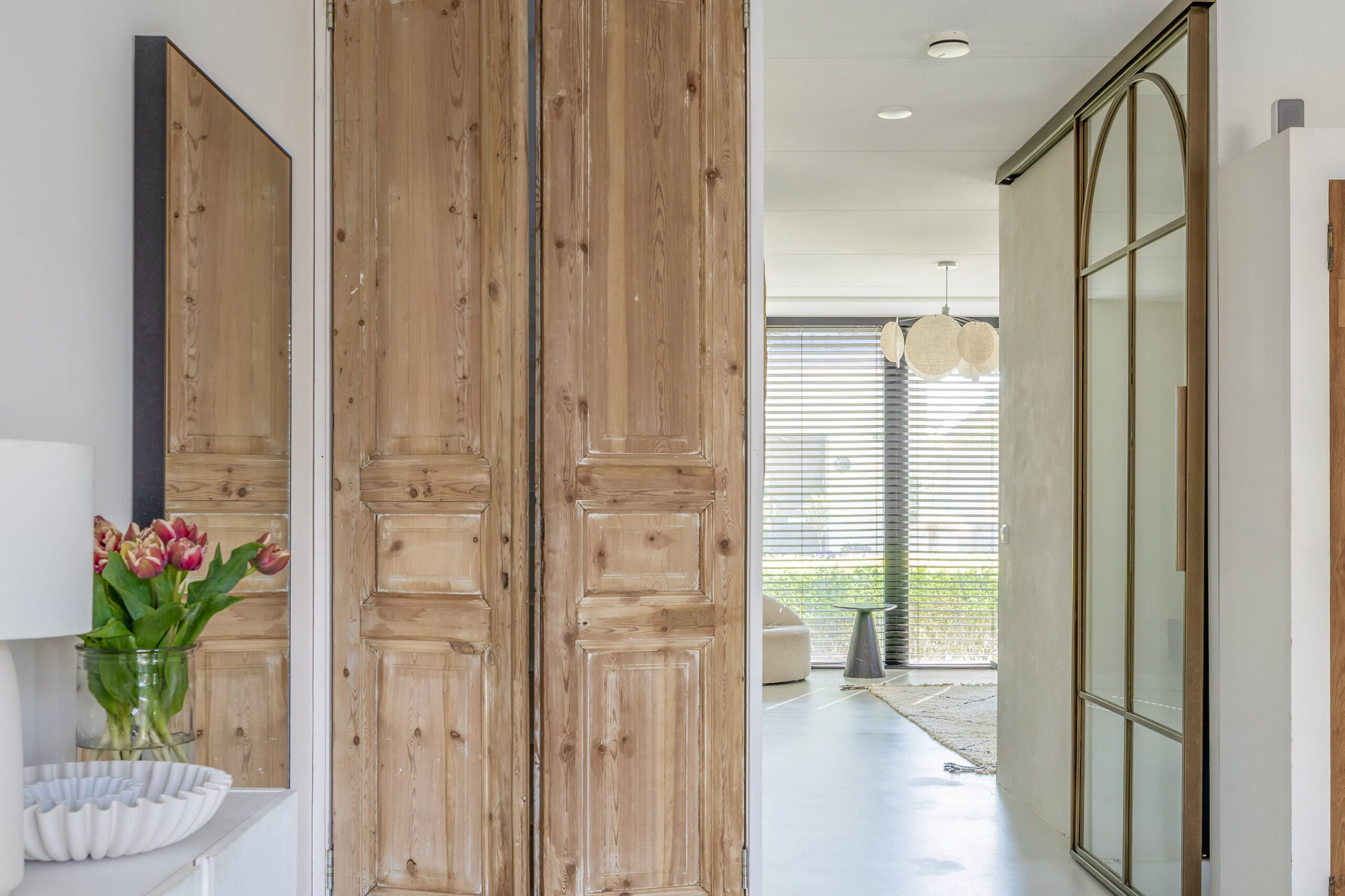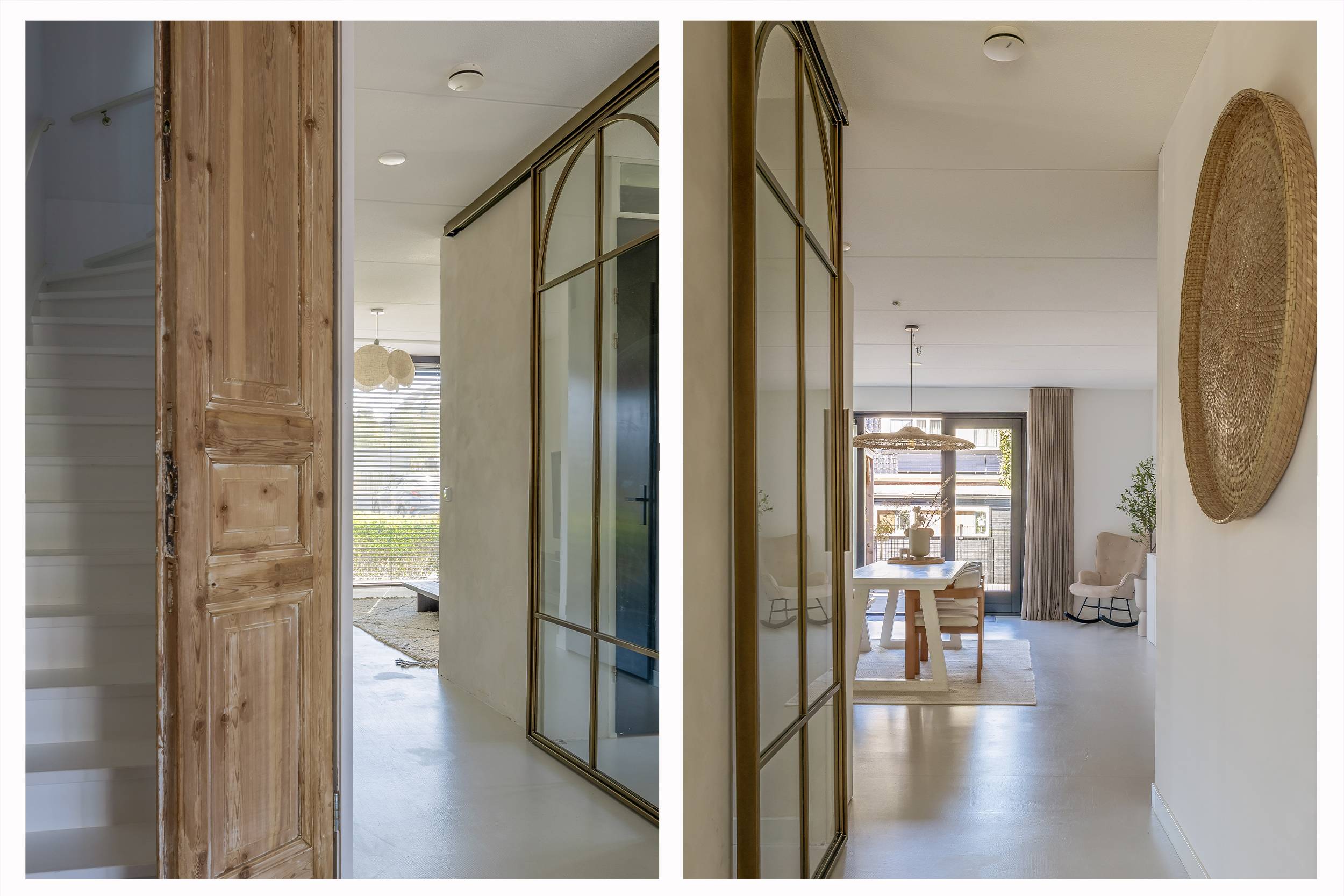 Via de zij-entree betreed je de woning. De hal biedt toegang tot een modern toilet met fonteintje en betonciré wanden en leidt via een stijlvolle bronskleurige schuifdeur naar de leefruimte. Aan de voorzijde bevindt zich de woonkamer, terwijl aan de achterzijde de royale eetkeuken is gesitueerd: de plek waar koken, tafelen en samenzijn centraal staan.