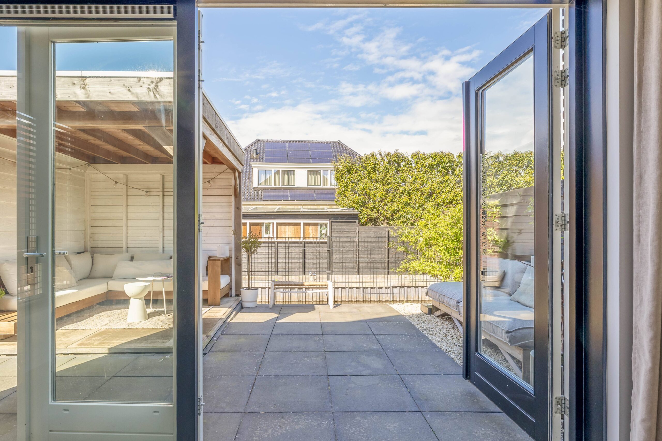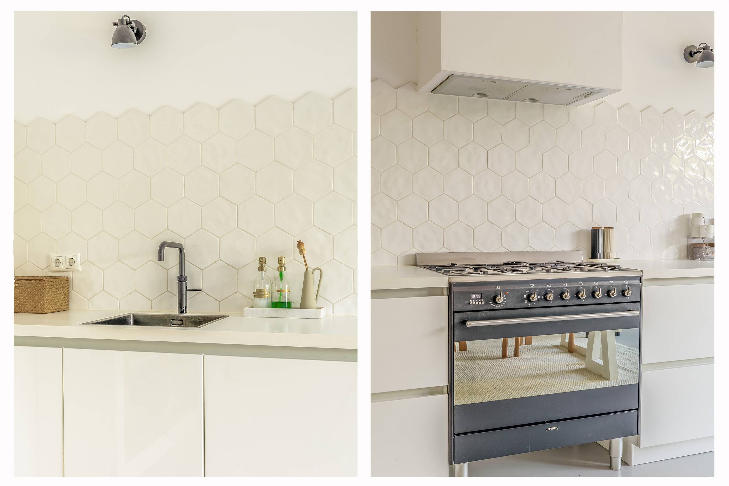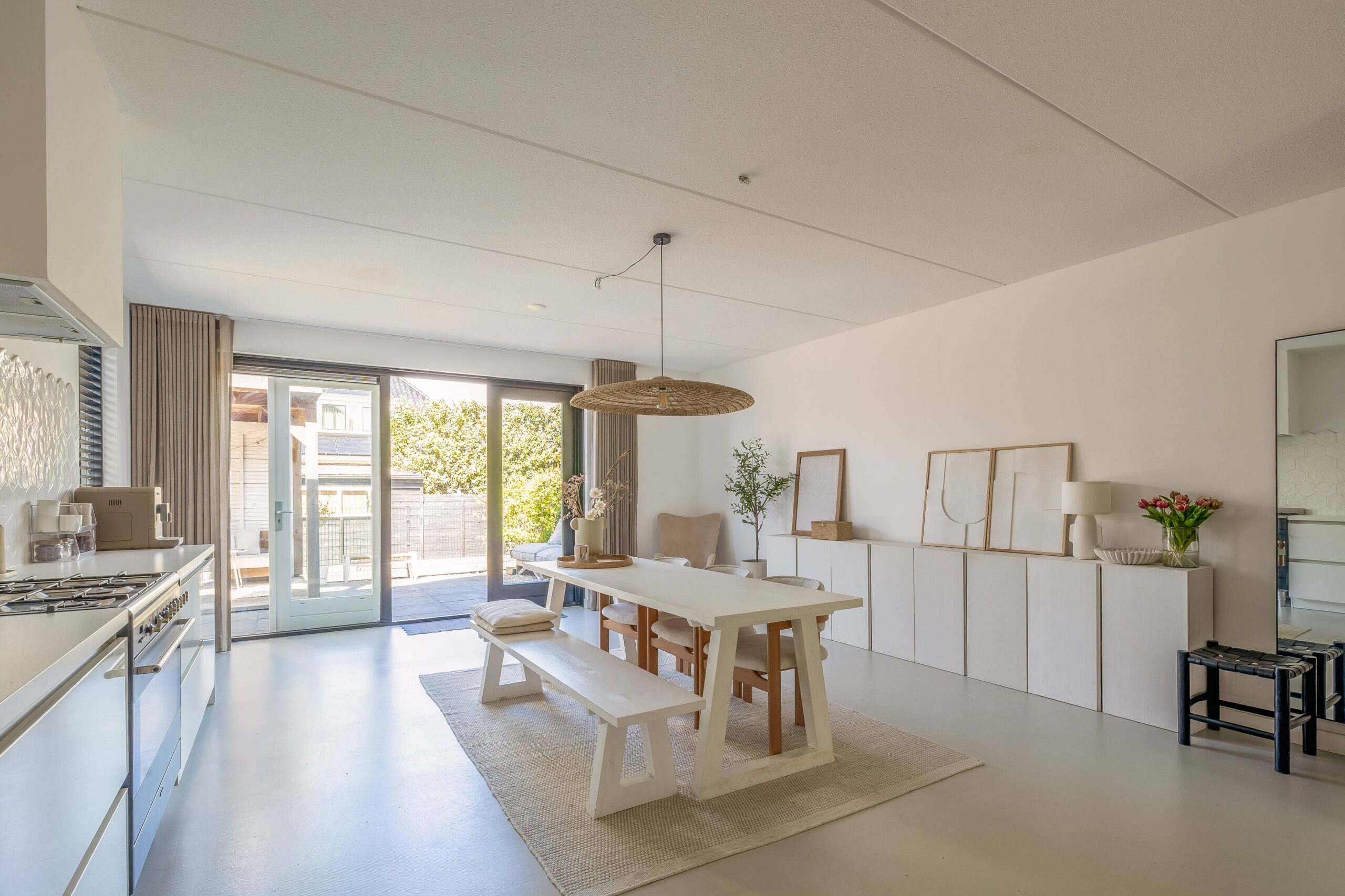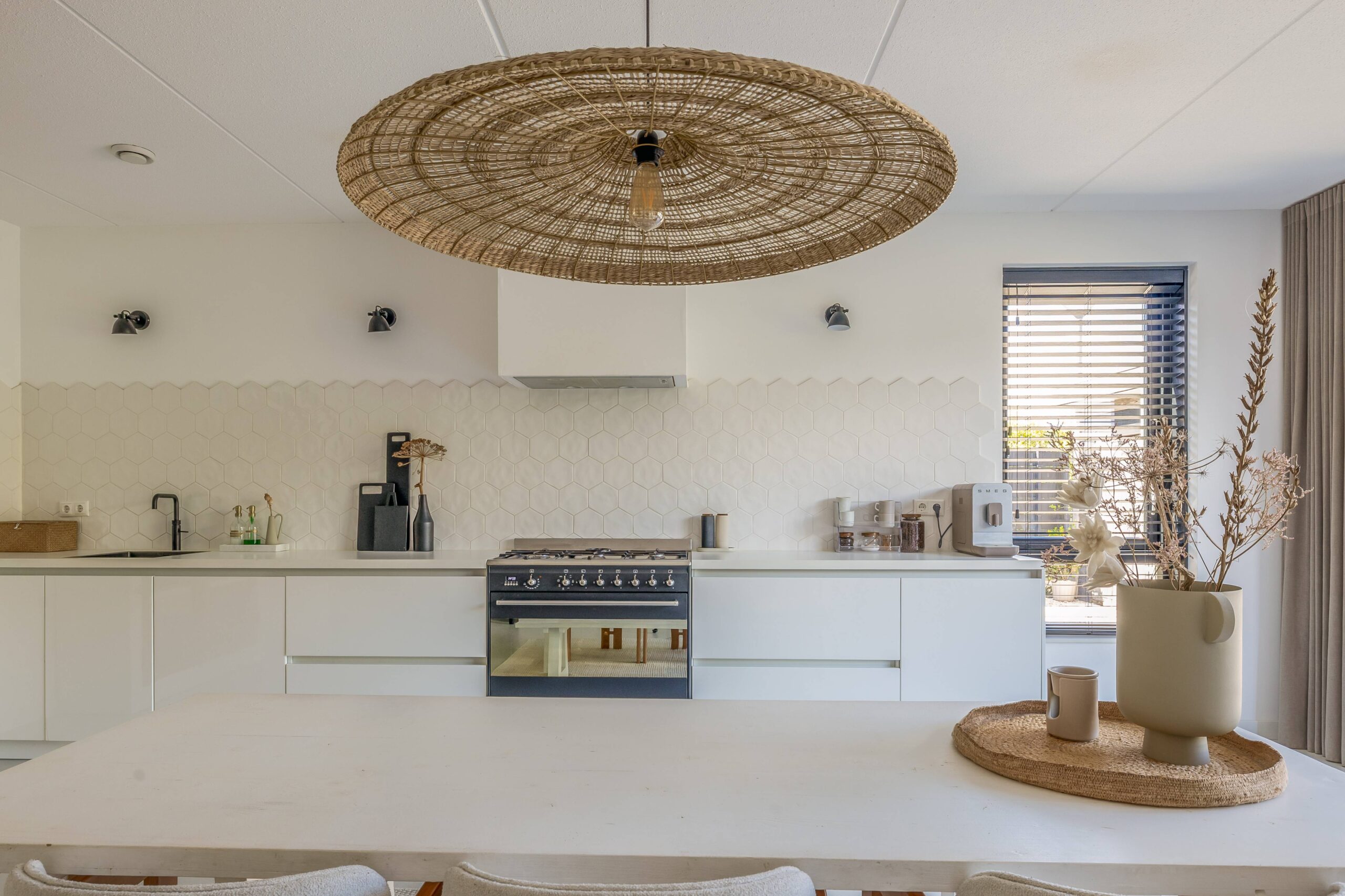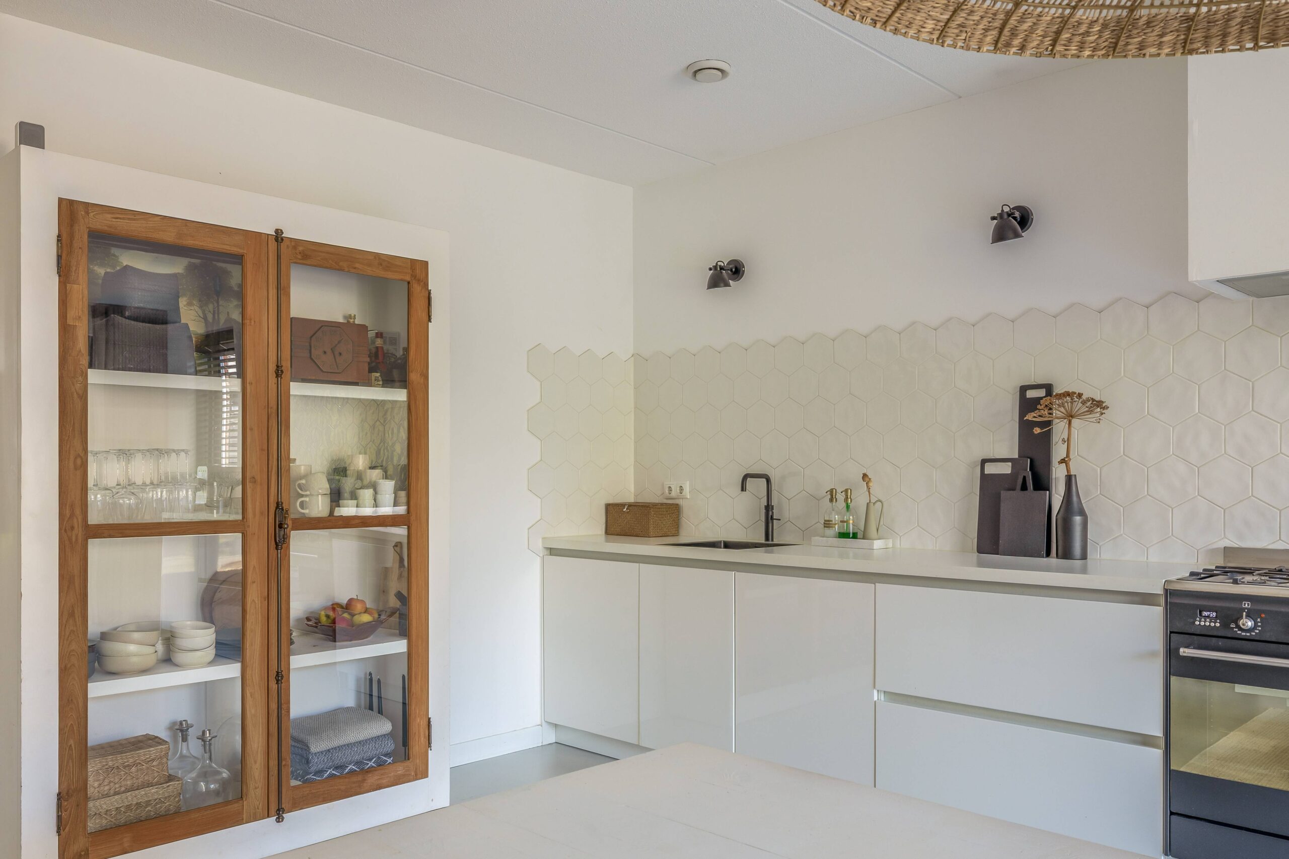 De moderne witte keuken is compleet uitgevoerd met diverse inbouwapparatuur, waaronder een gasfornuis met oven, afzuigkap, Quooker, vaatwasser, koelkast en vriezer. Dankzij de openslaande deuren loopt de binnenruimte naadloos over in de fraai aangelegde achtertuin.
