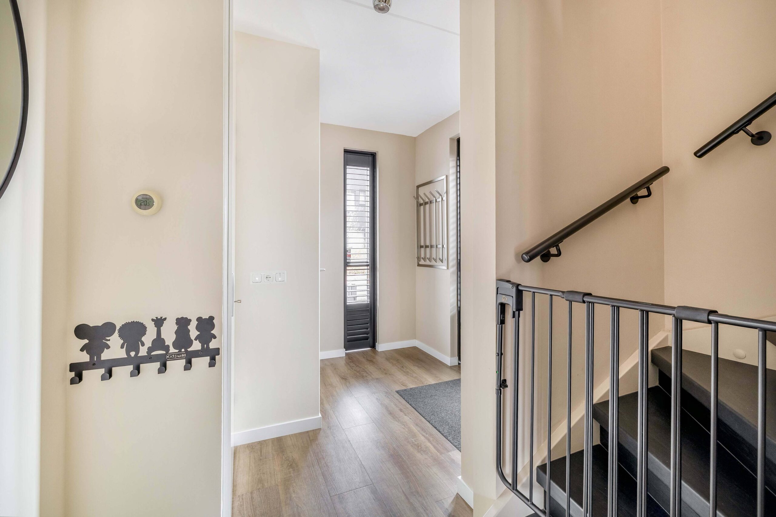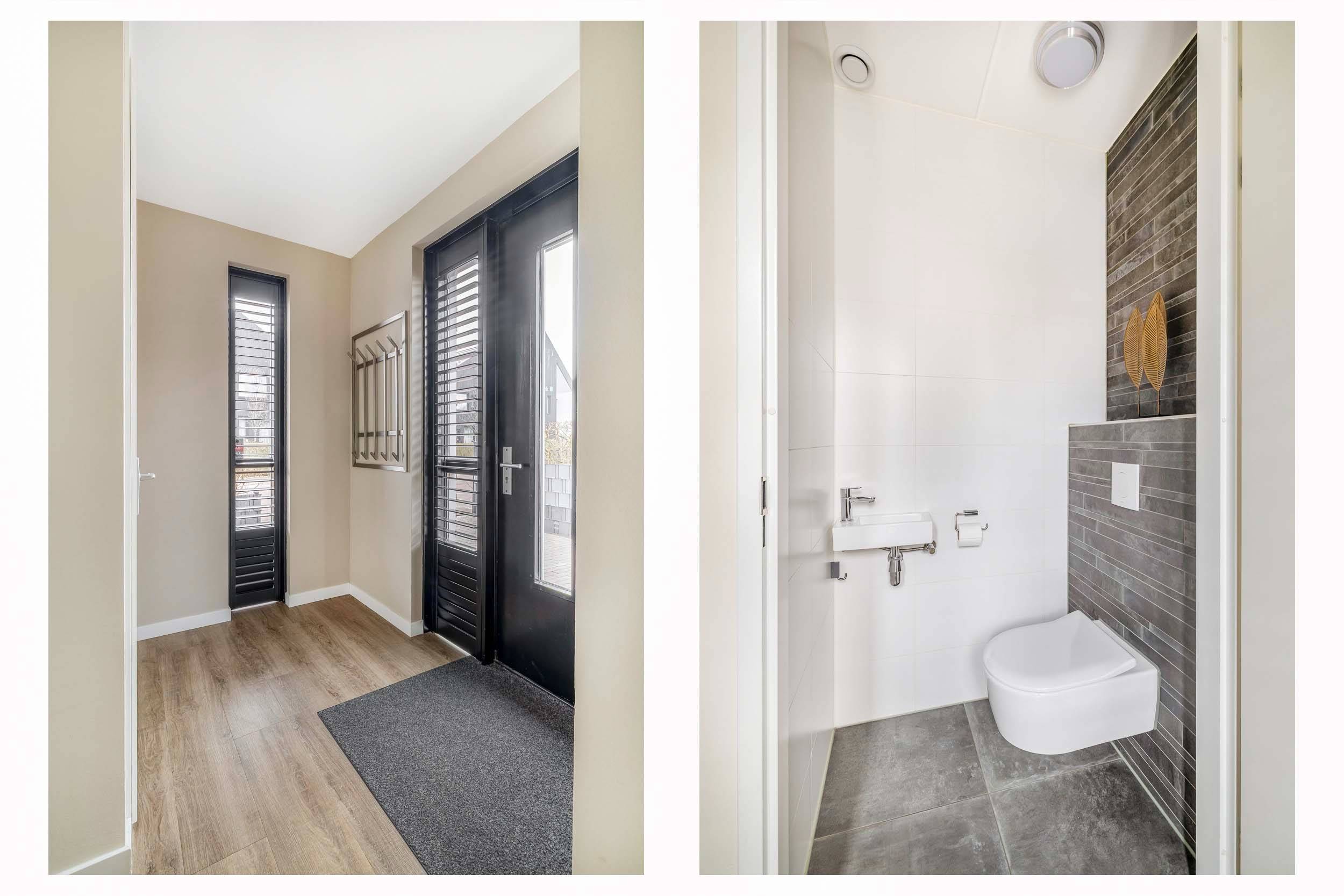 De entree is aan de zijkant gelegen. Je komt binnen in een ruime hal met zwarte shutters voor de ramen.