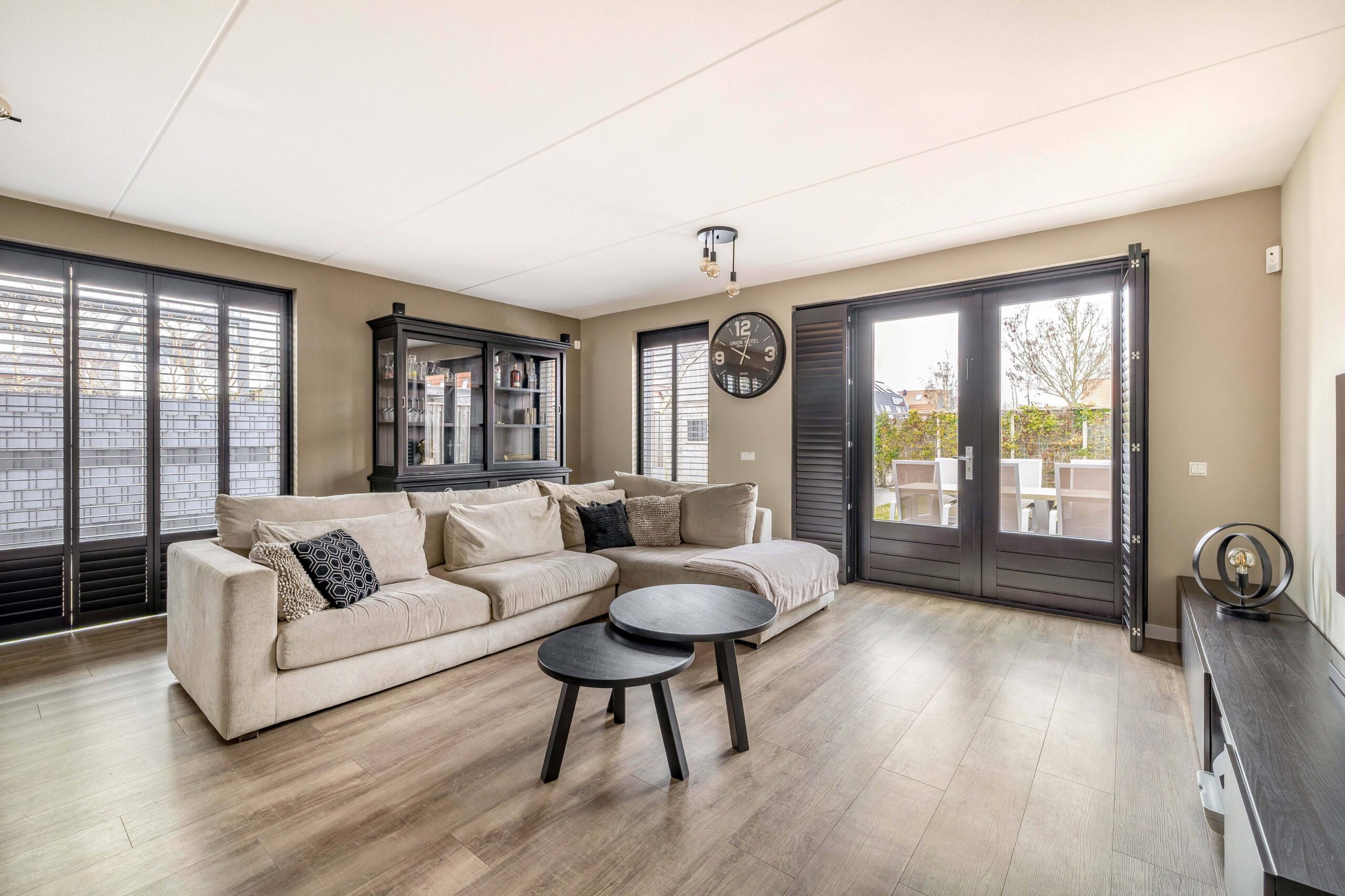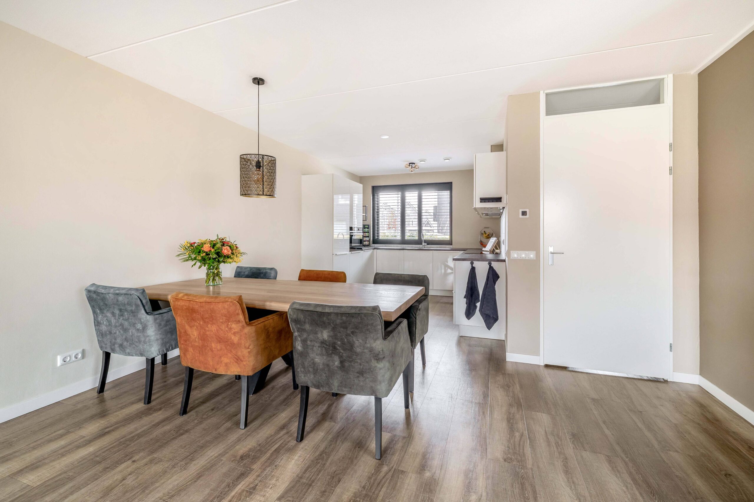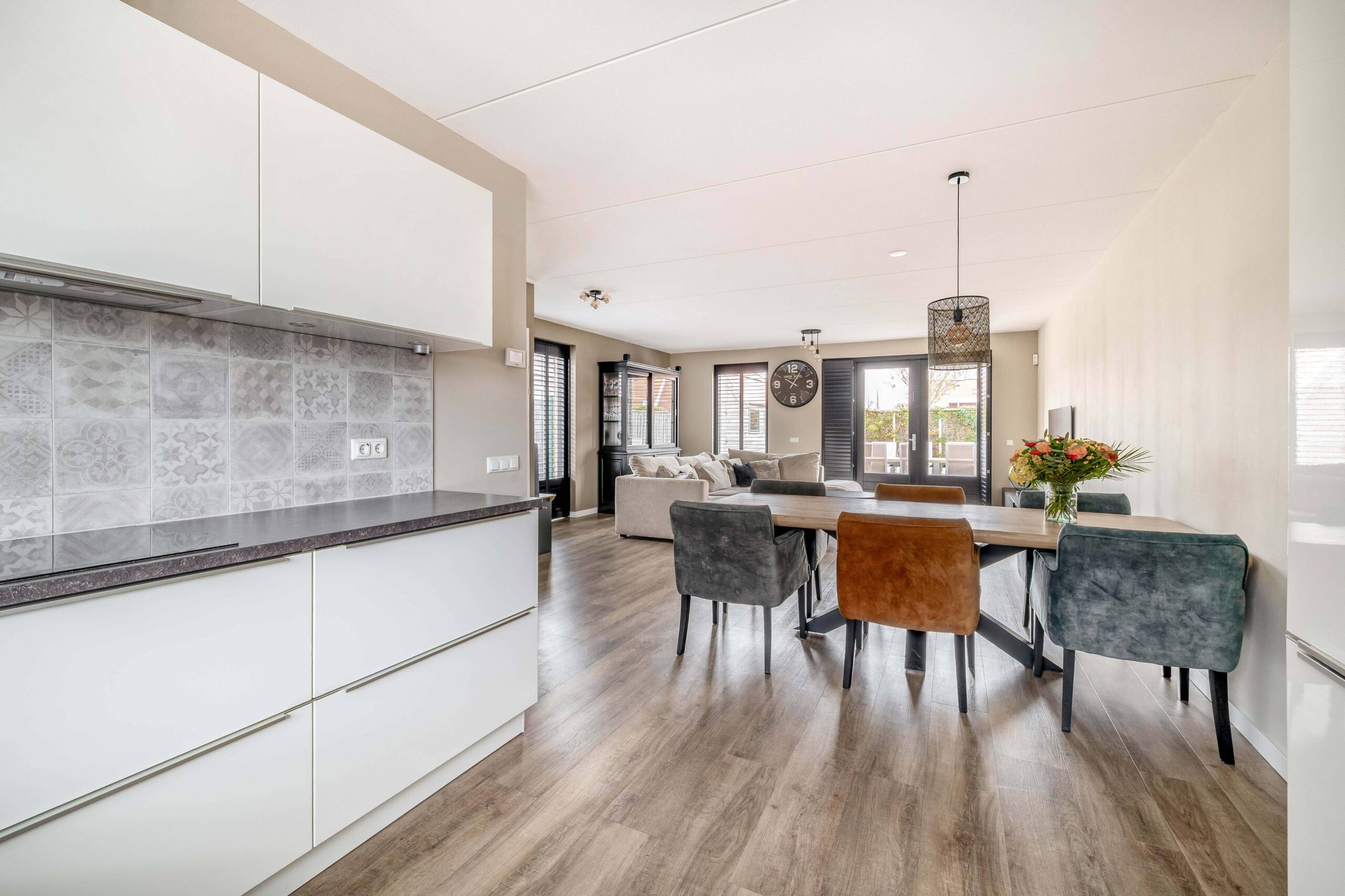 De woonkamer is heerlijk ruim en licht door het extra zijraam. Ramen tot de grond en openslaande tuindeuren aan de achterzijde. Op de vloer een mooie pvc vloer. Aan de voorzijde de open keuken in hoekopstelling met een nieuwe combioven en afzuigkap, een koelkast, vriezer, inductiekookplaat en vaatwasser. De woonkamer heeft ook mooie zwarte shutters. Ruime trapkast ideaal voor de voorraad en stofzuiger etc.