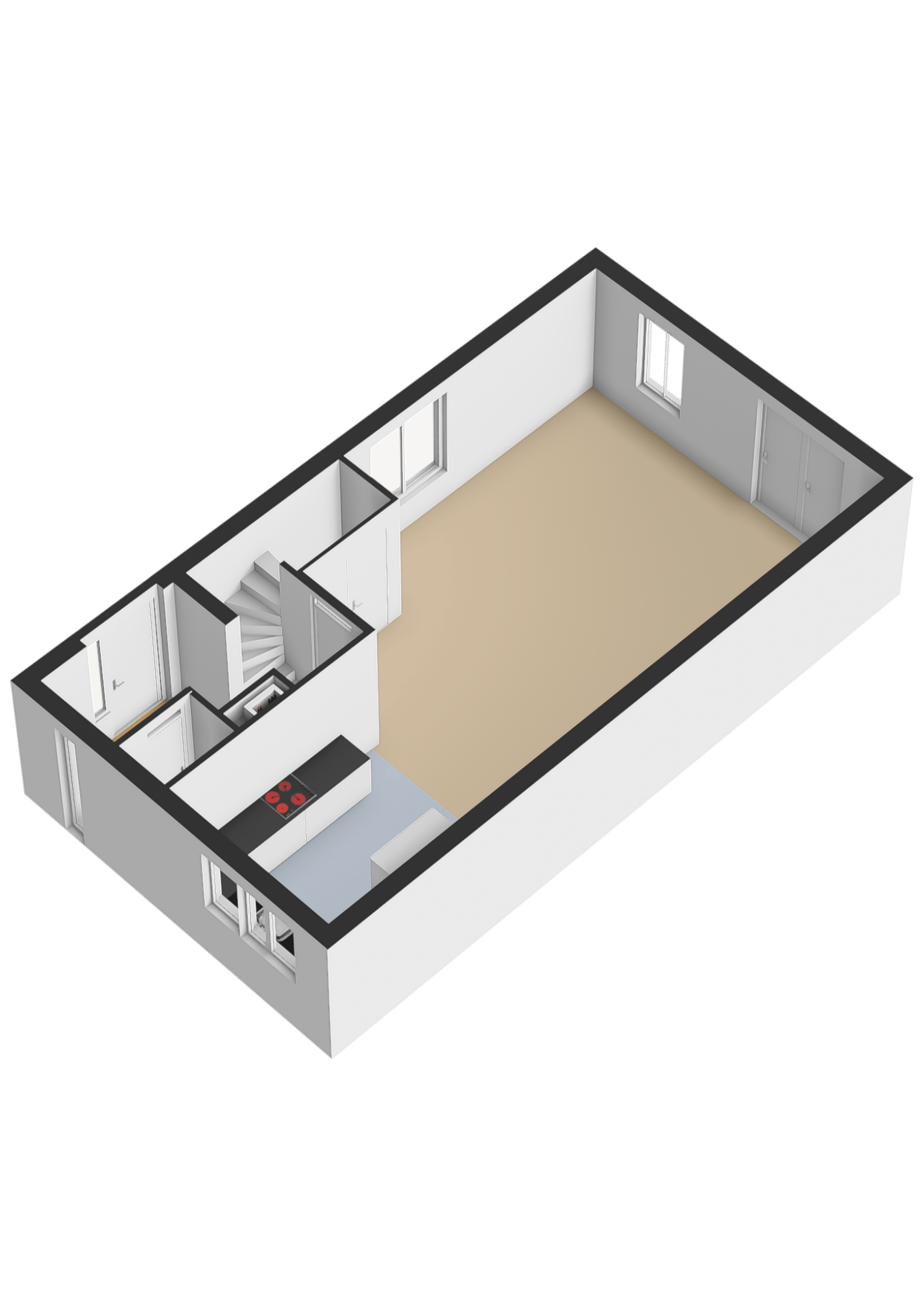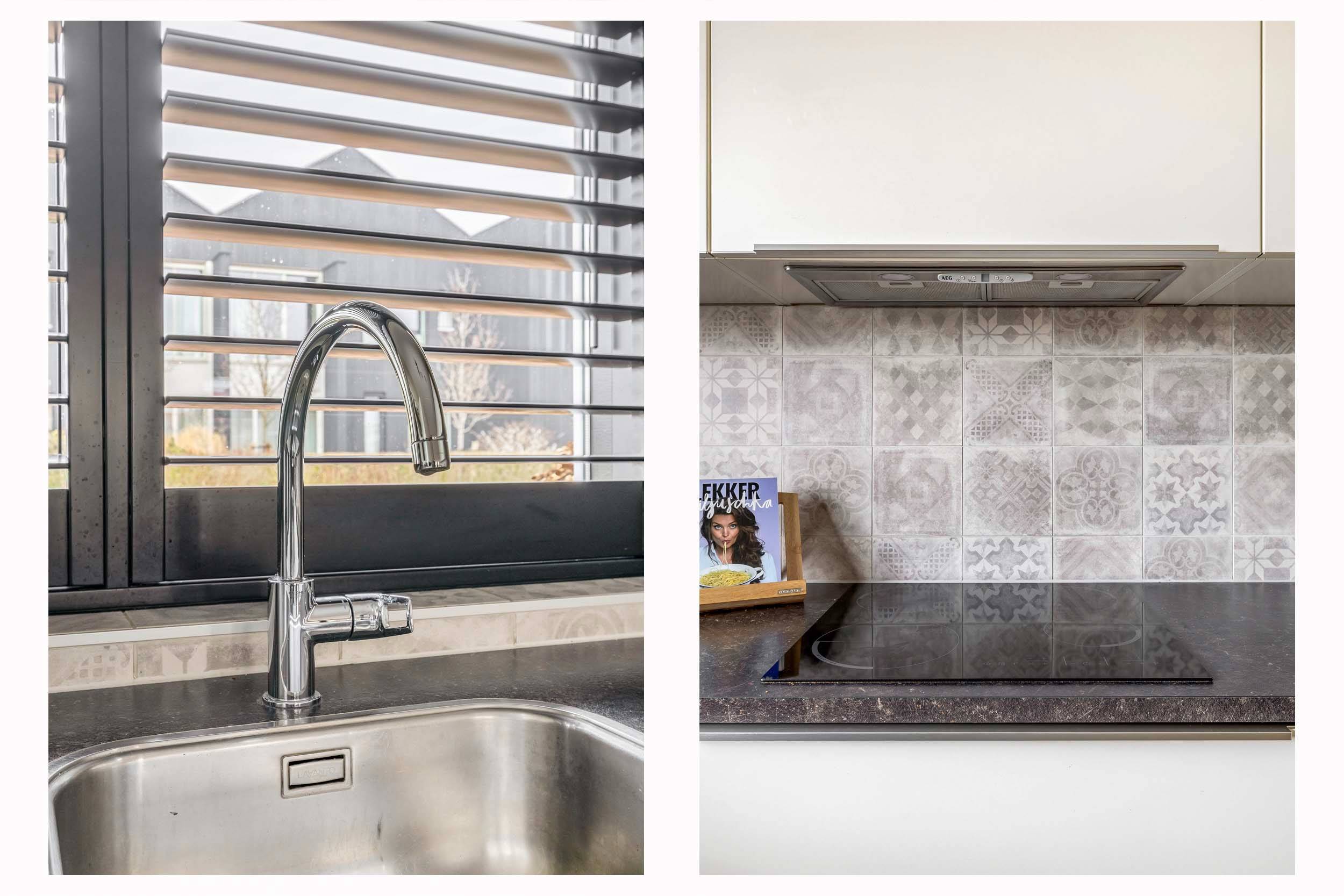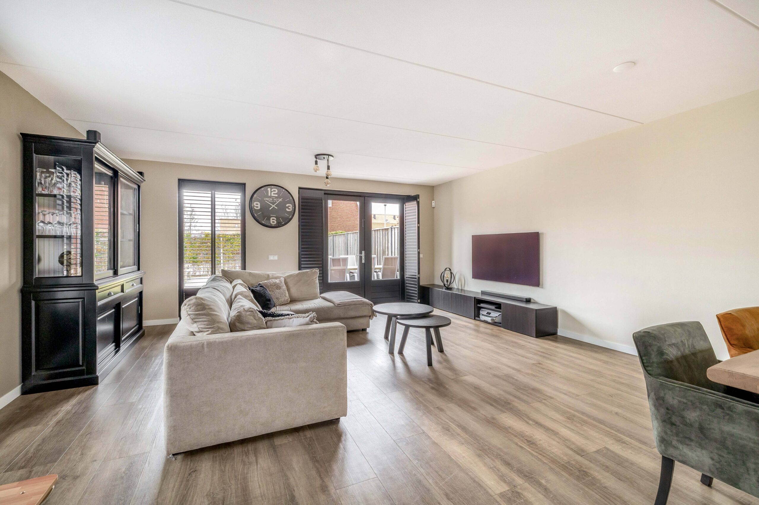 De woonkamer is heerlijk ruim en licht door het extra zijraam. Ramen tot de grond en openslaande tuindeuren aan de achterzijde. Op de vloer een mooie pvc vloer. Aan de voorzijde de open keuken in hoekopstelling met een nieuwe combioven en afzuigkap, een koelkast, vriezer, inductiekookplaat en vaatwasser. De woonkamer heeft ook mooie zwarte shutters. Ruime trapkast ideaal voor de voorraad en stofzuiger etc.