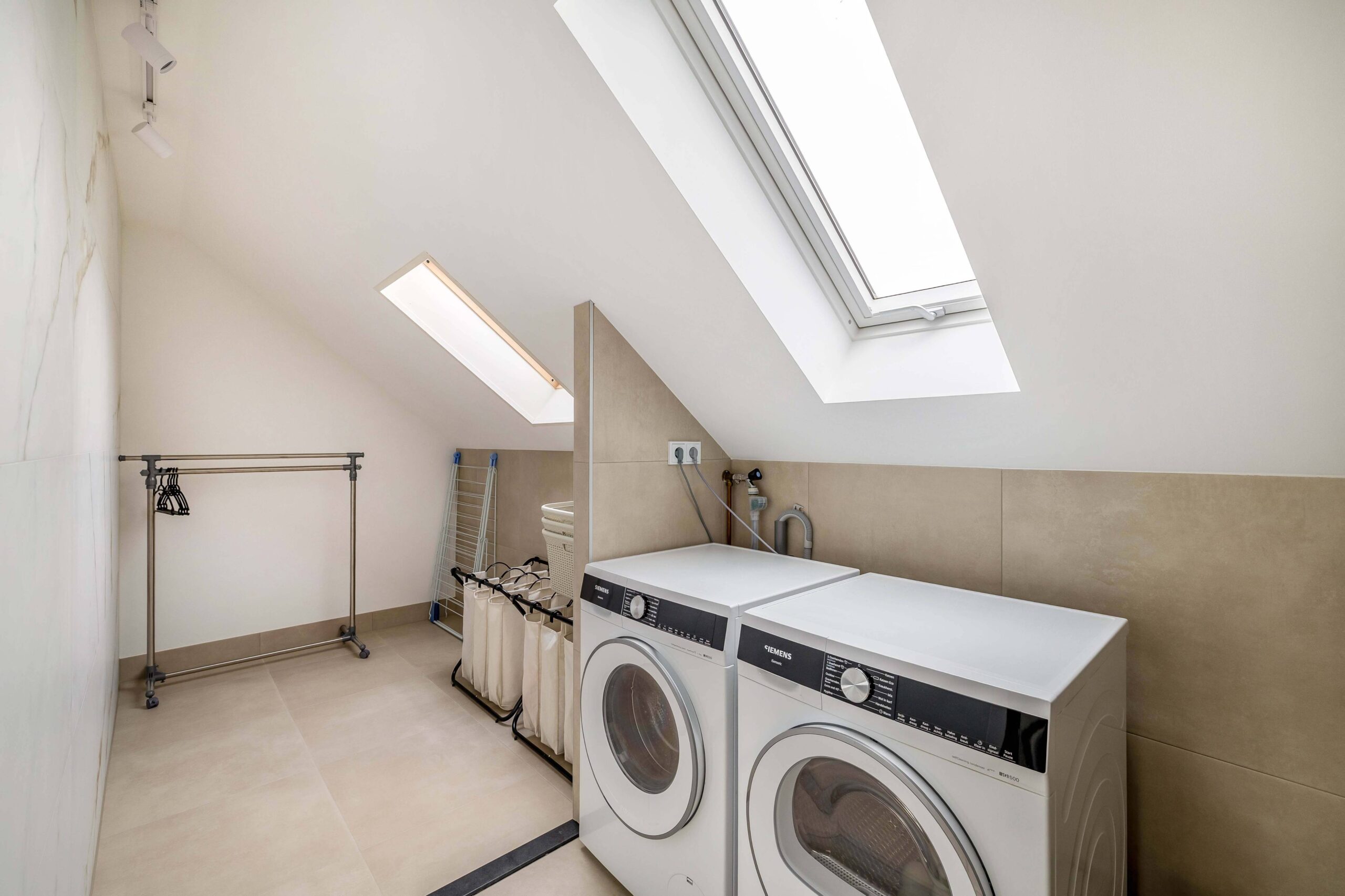 Een heerlijk betegelde waskamer of bergruimte aan de voorzijde. Hier is naast het bestaande dakraam, nog een dakraam geplaatst voor extra licht. Tevens is hier de opstelling van de CV ketel (’16) en de ventilatiebox. De geheel woning heeft vloerverwarming welke te regelen is per ruimte.