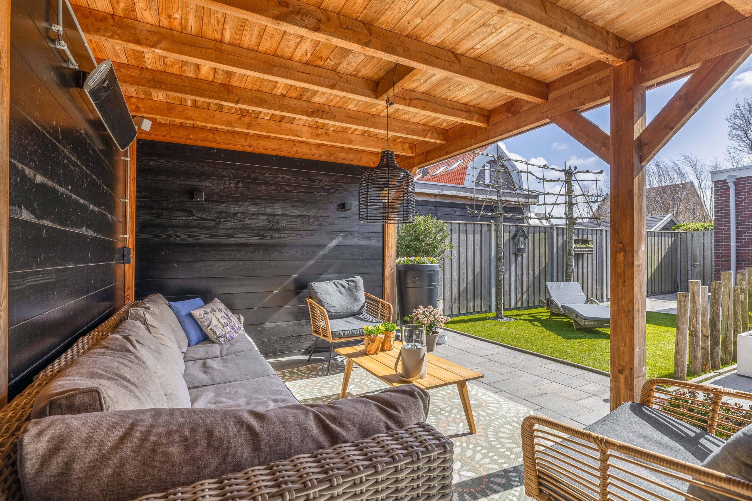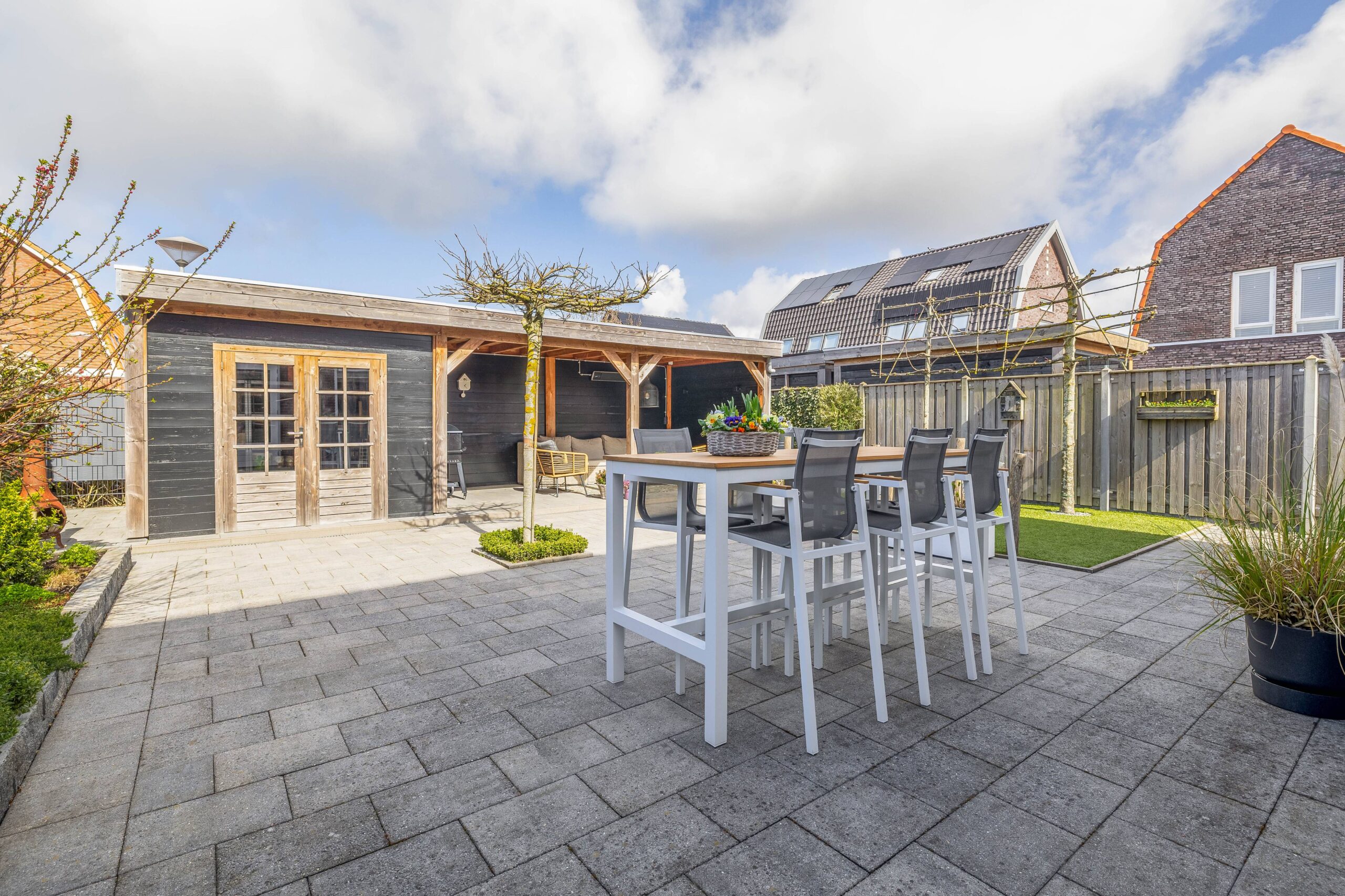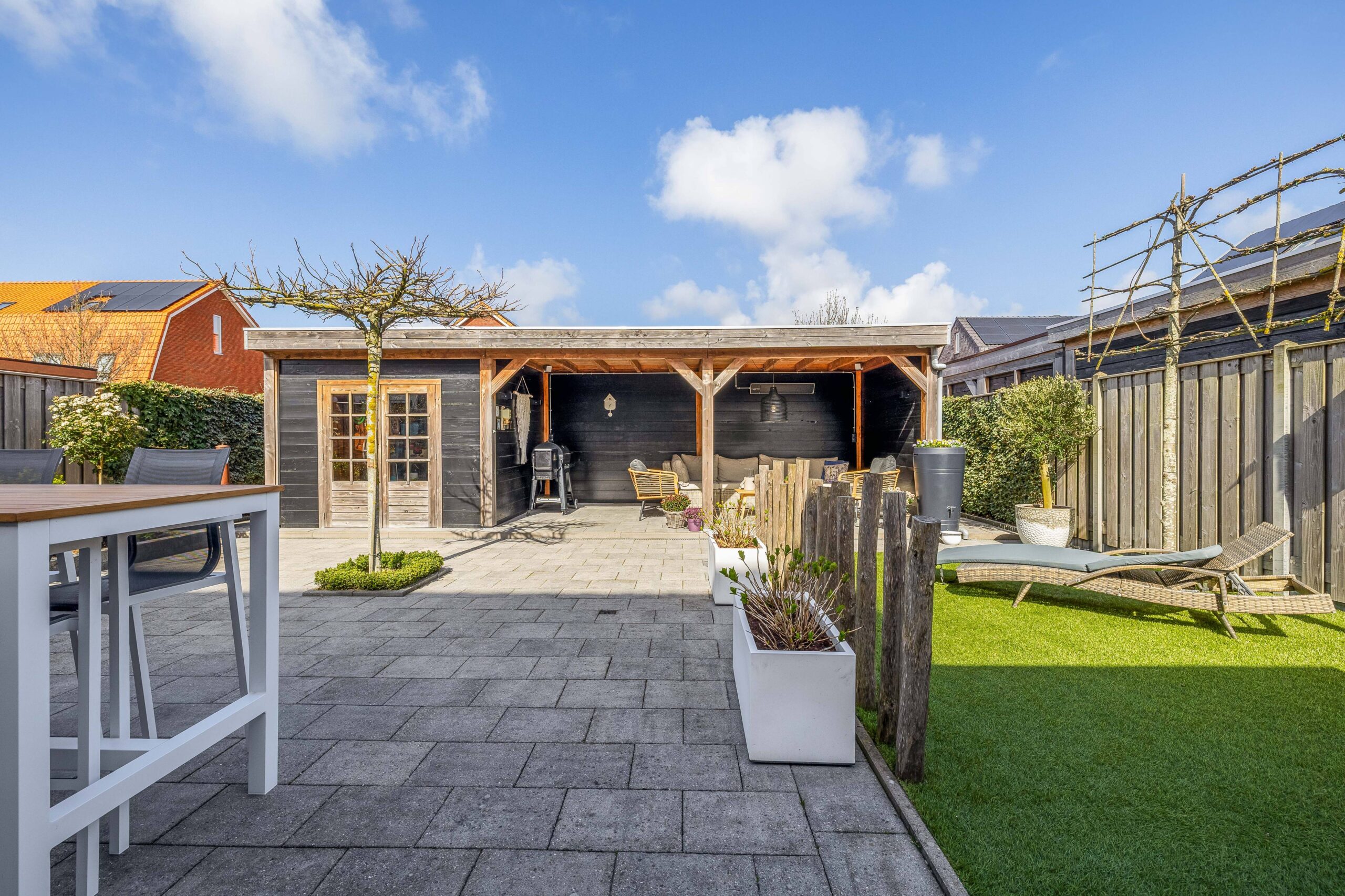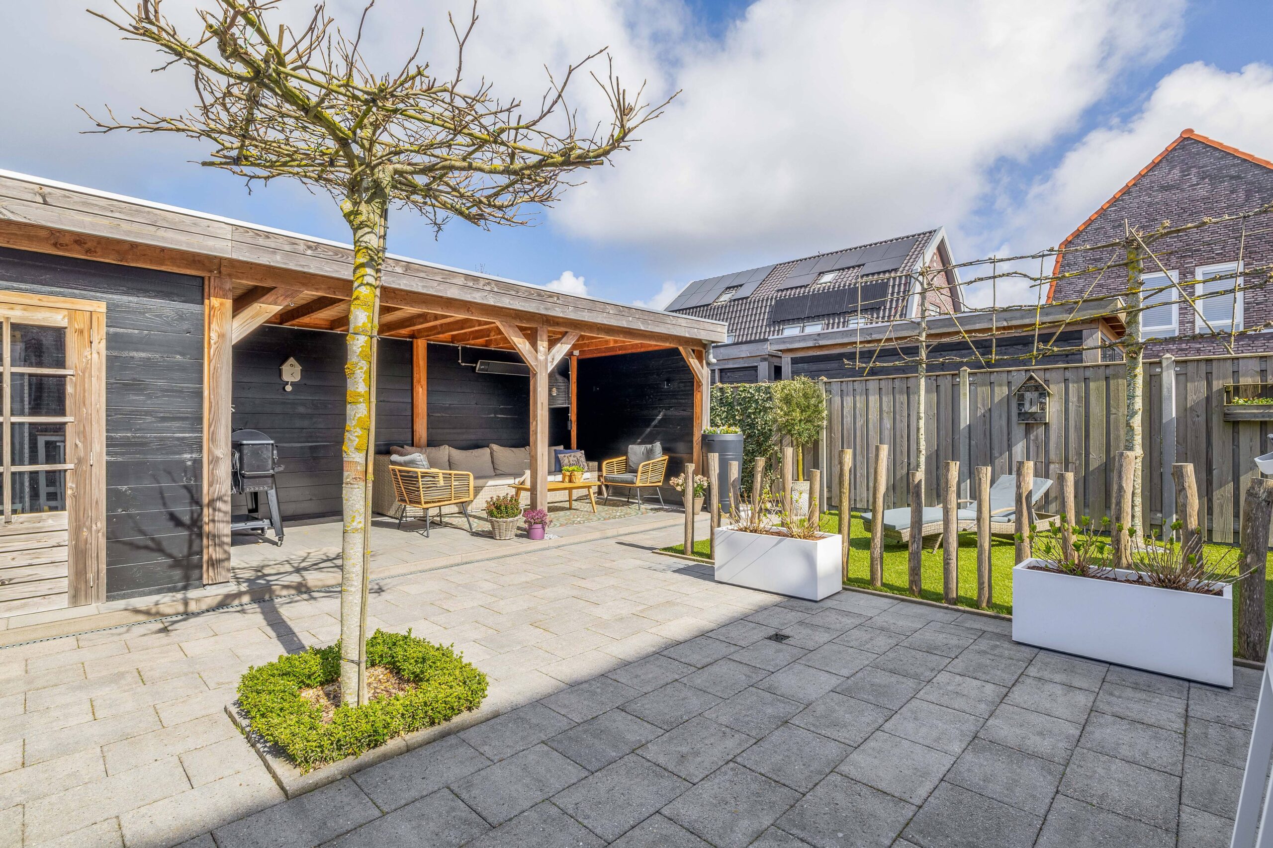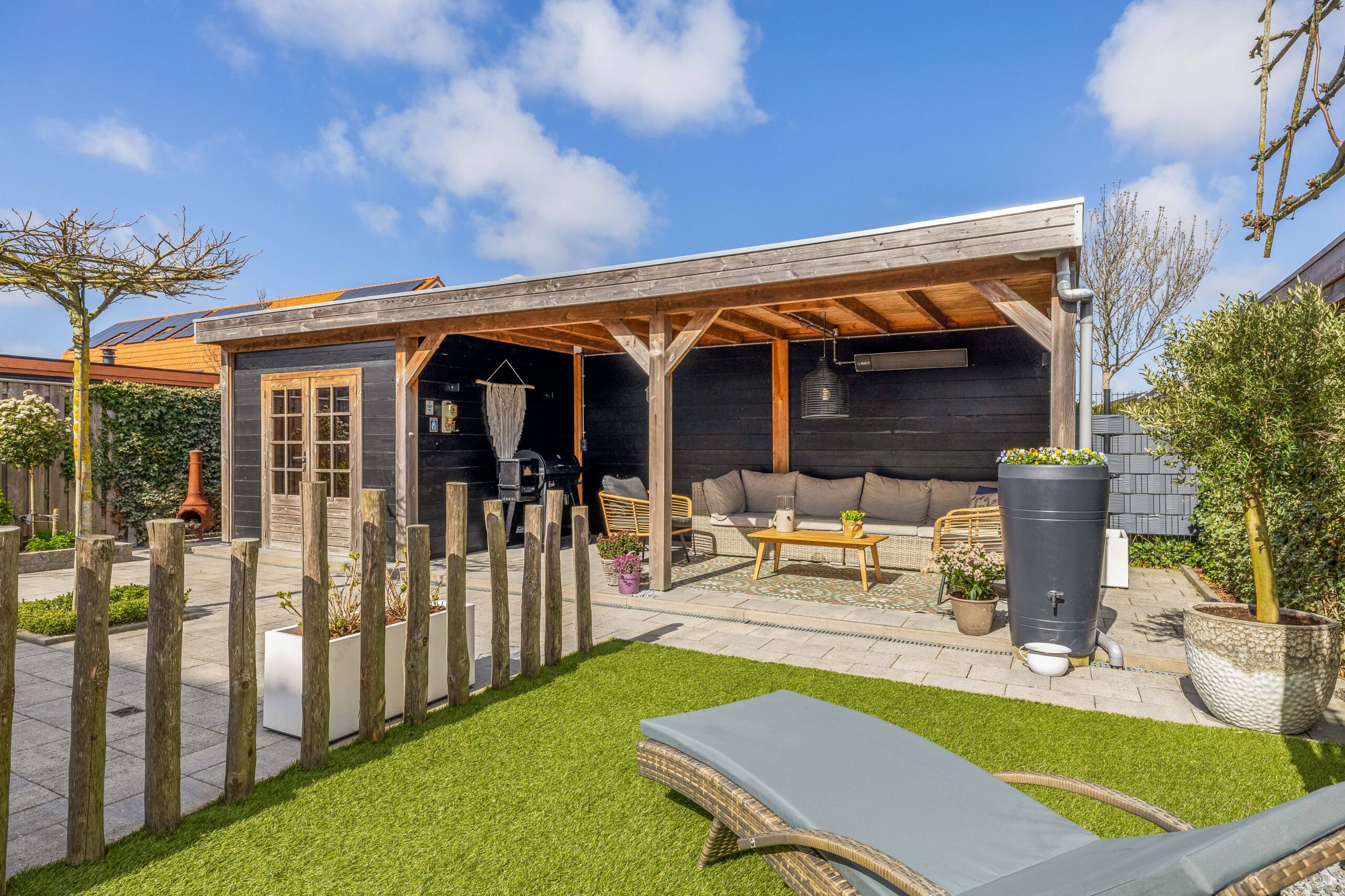 Een achtertuin waar je heerlijk van de zon kunt genieten maar ook kunt genieten onder de mooie grote overkapping. Als extra is er in het verlengde van de overkapping een ruime berging. Zonnepanelen doen met het aantal van 8 stuks op de overkapping ook goed hun werk. De woning zelf telt ook nog 5 zonnepanelen.