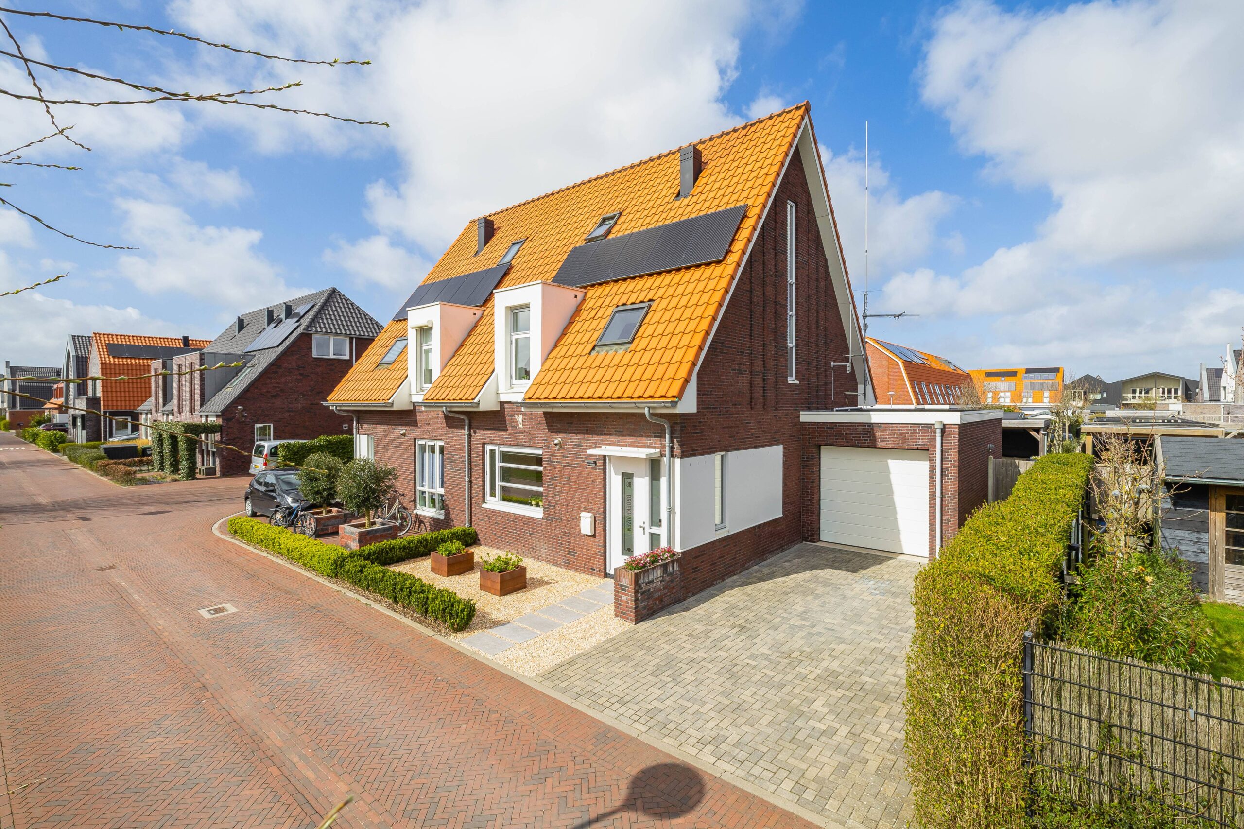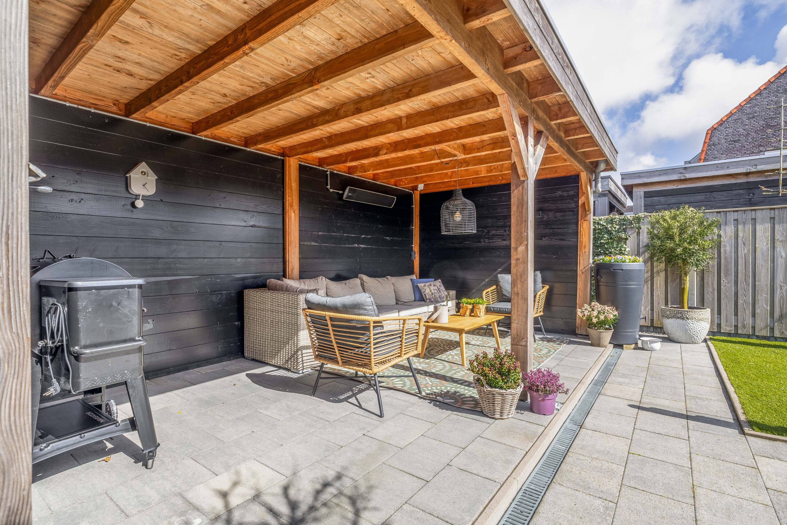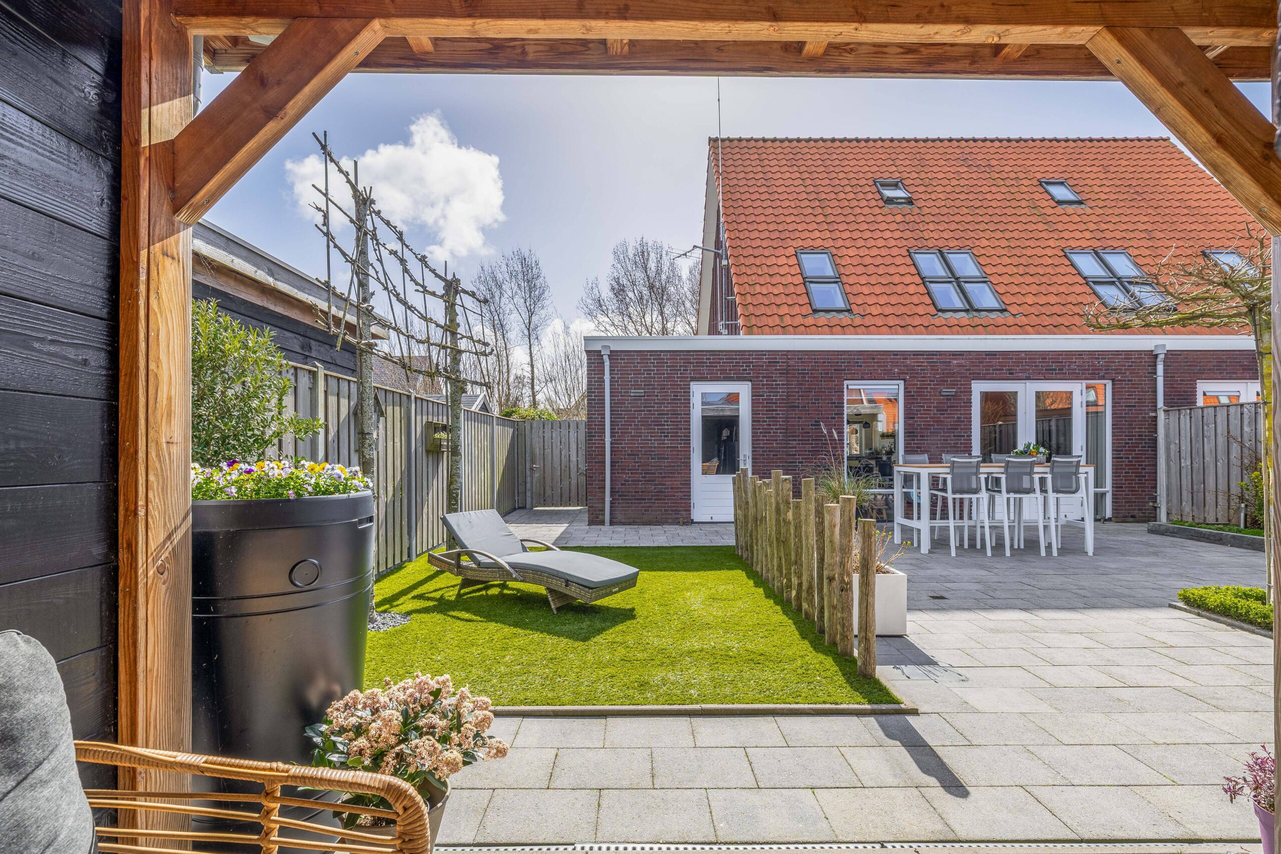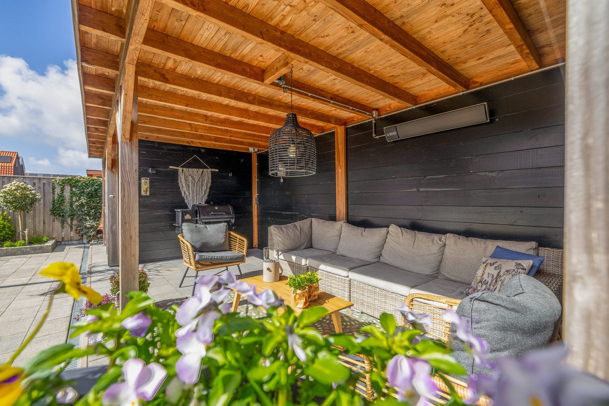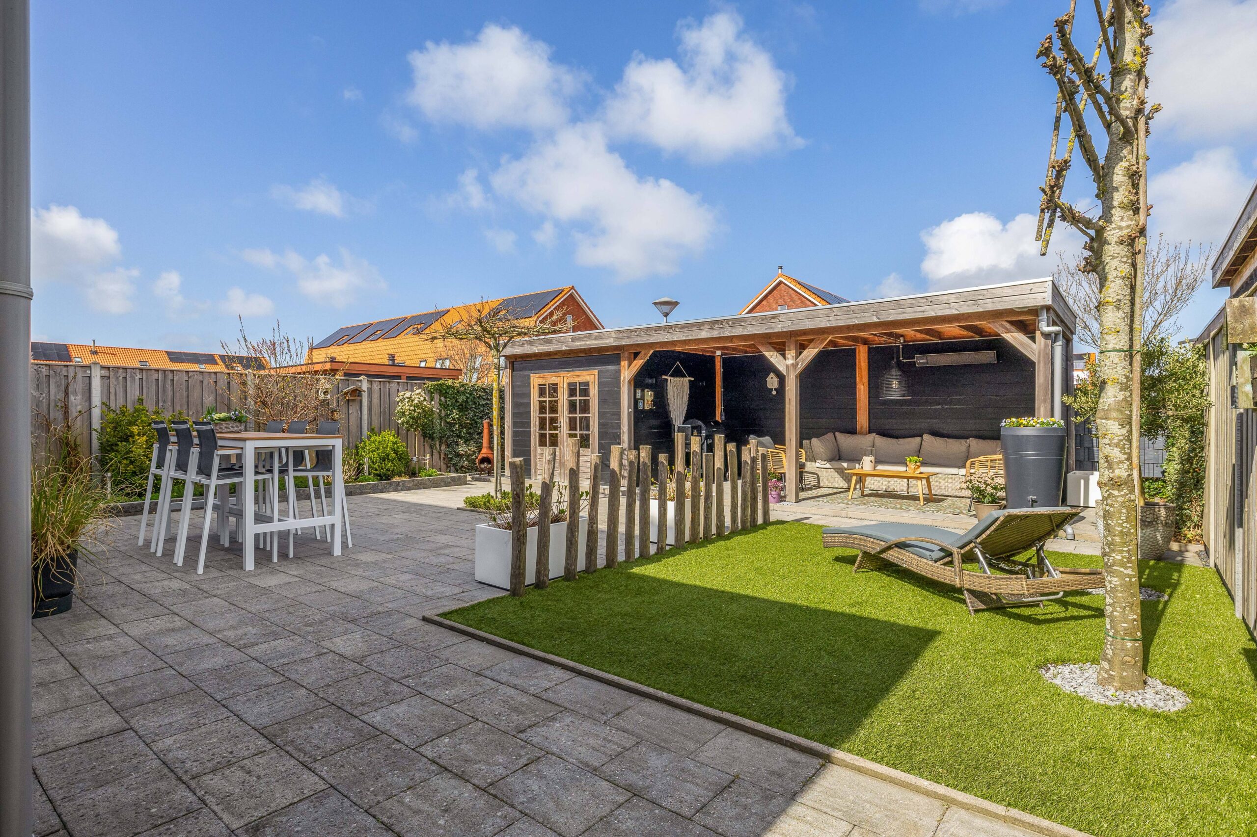 Een achtertuin waar je heerlijk van de zon kunt genieten maar ook kunt genieten onder de mooie grote overkapping. Als extra is er in het verlengde van de overkapping een ruime berging. Zonnepanelen doen met het aantal van 8 stuks op de overkapping ook goed hun werk. De woning zelf telt ook nog 5 zonnepanelen.