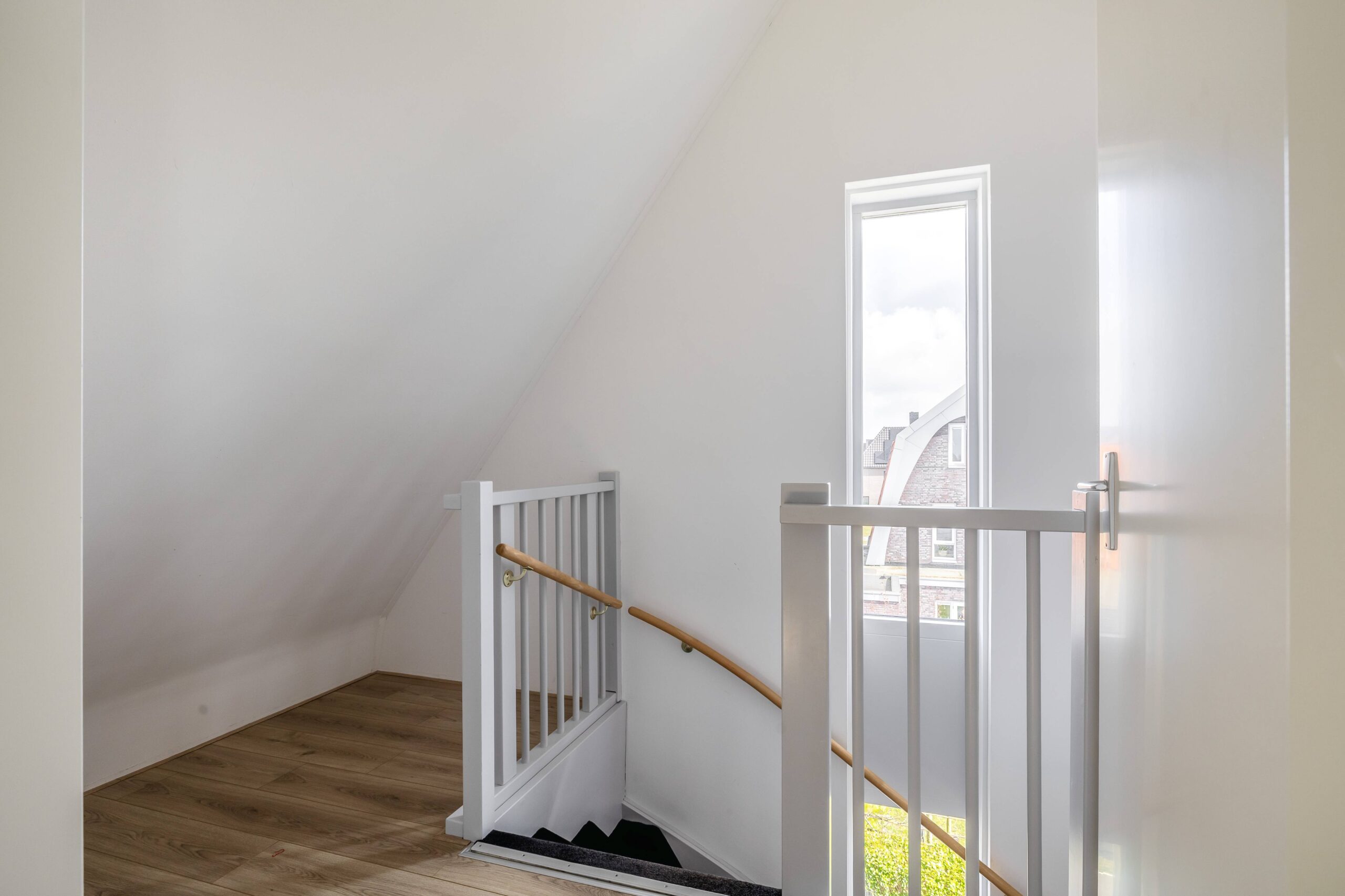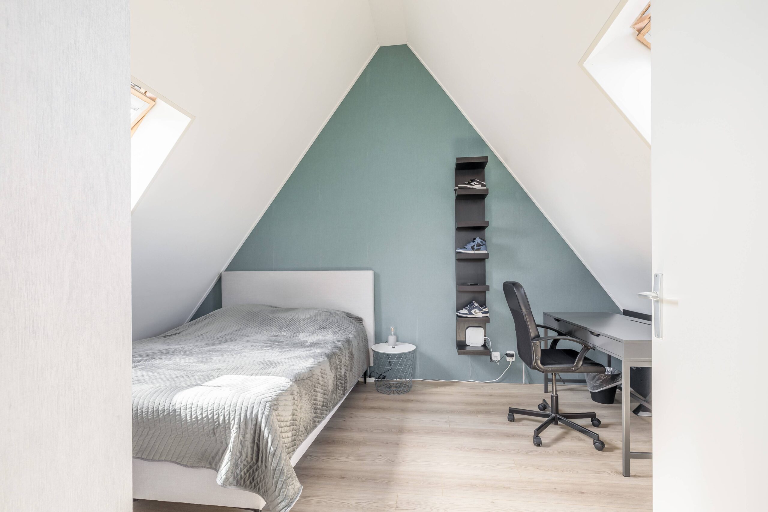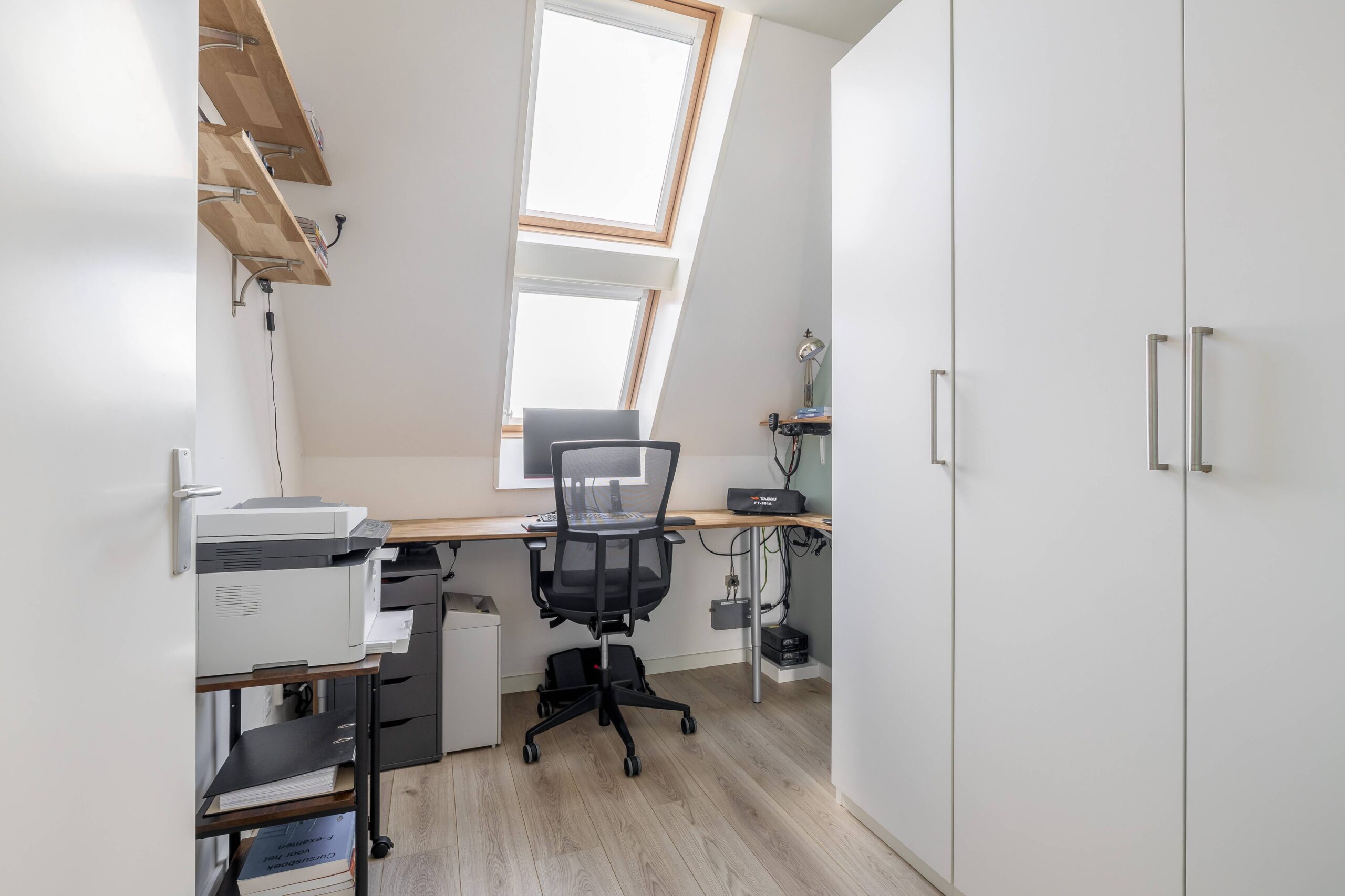 Vaste trap naar de zolderverdieping. Overloop met lekker veel licht door het zijraam en een wasruimte en de opstelling van de technische apparatuur. Vierde slaapkamer met aan beide kanten een dakraam.