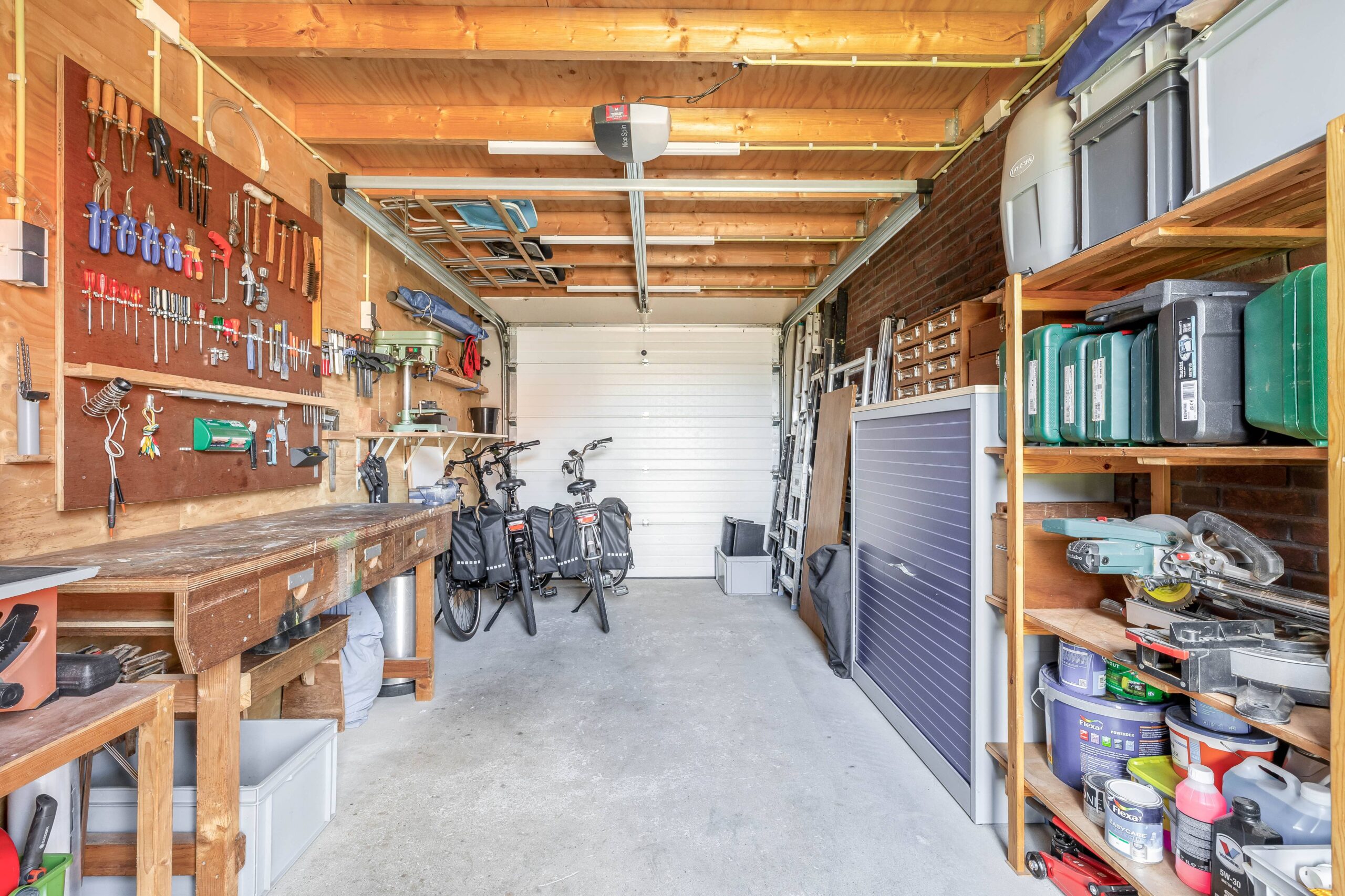 De aangebouwde stenen garage is geïsoleerd en voorzien van een elektrische deur.