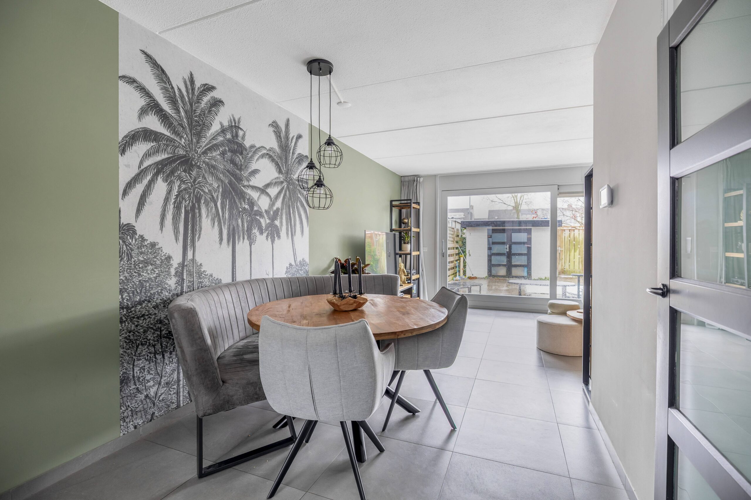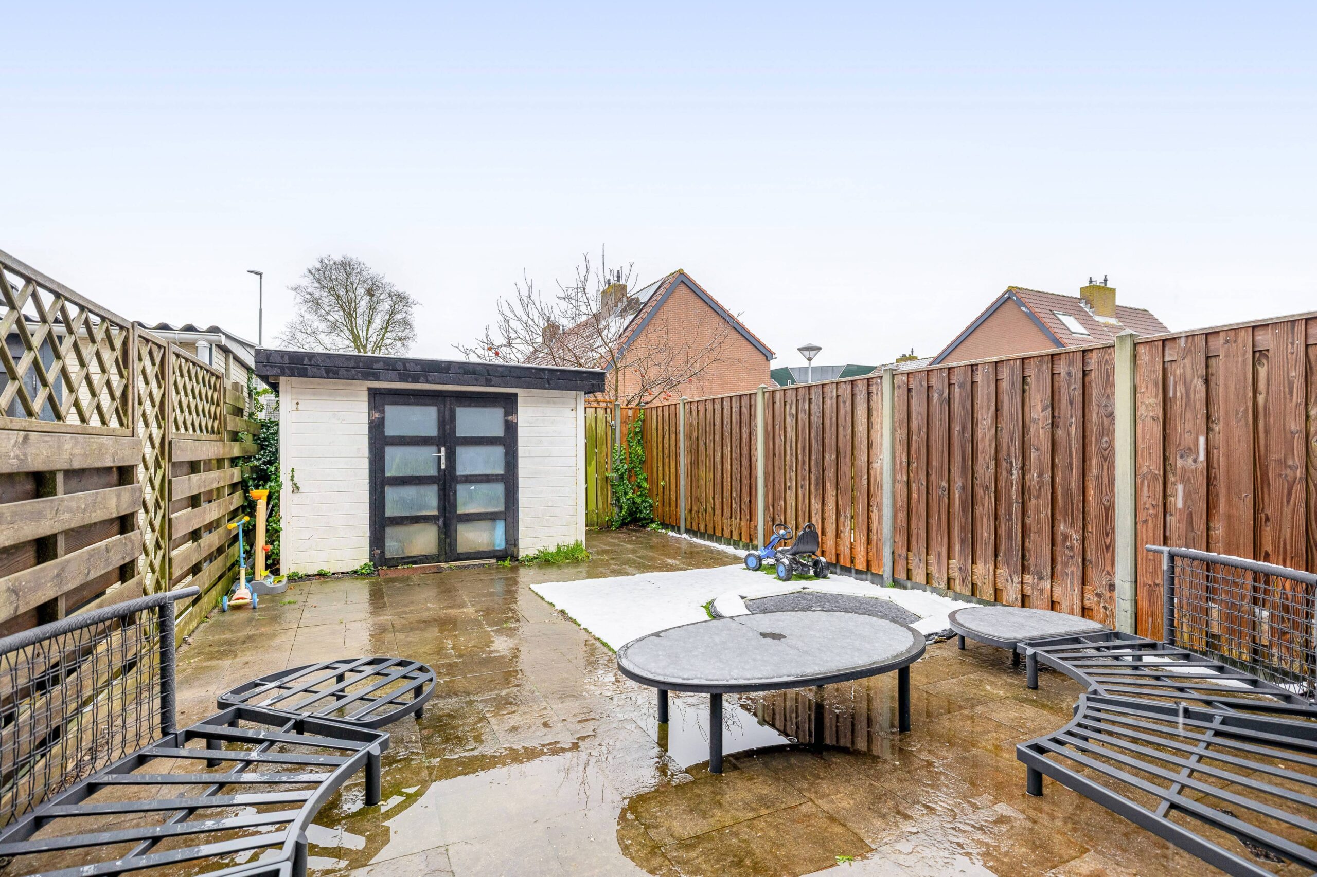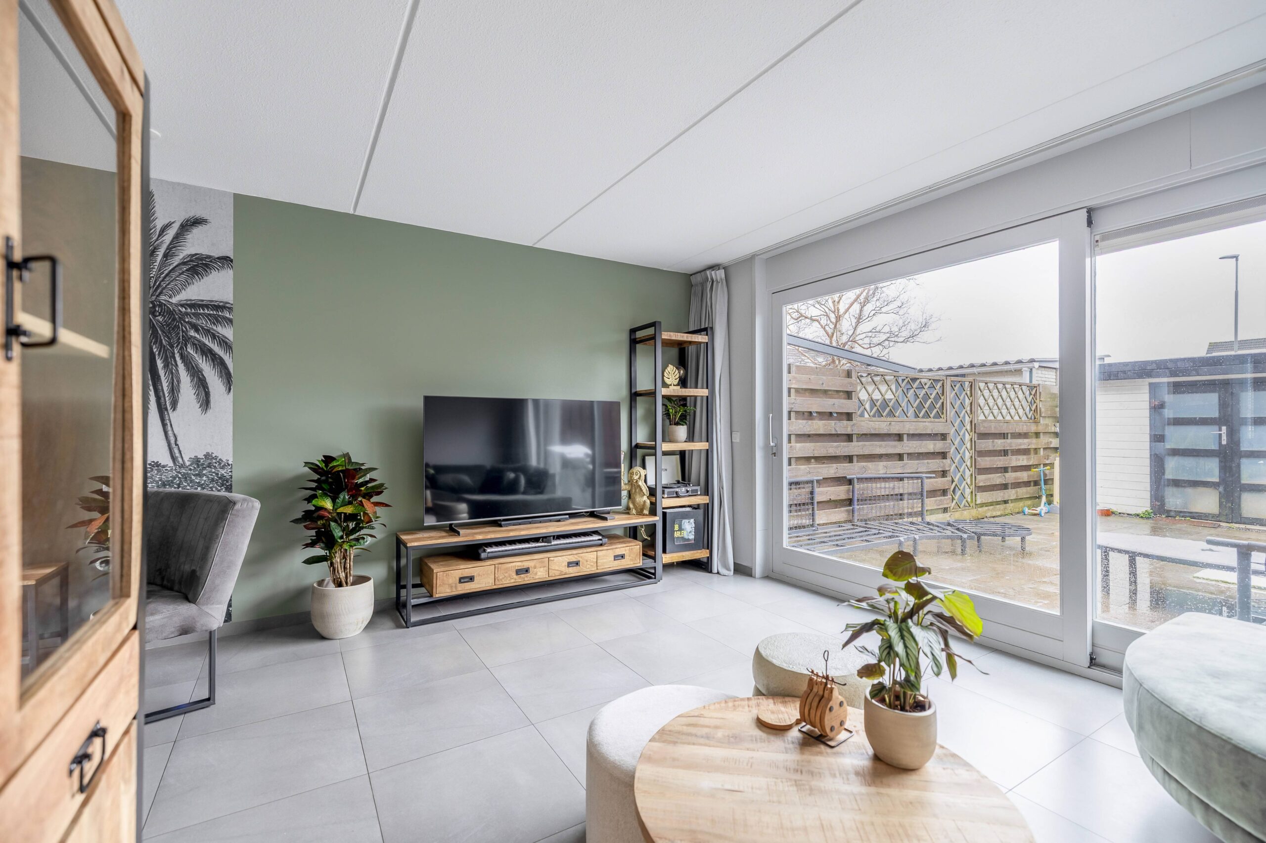 De tuingerichte woonkamer is heerlijk licht dankzij de grote raampartijen. Via de schuifpui stap je zo de verzorgd aangelegde achtertuin in, gelegen op het zonnige zuiden. Hier vind je een vrijstaande houten berging met dubbele deuren en een achterom. Aan de achtergevel is in 2025 een elektrisch bedienbaar zonnescherm geplaatst, ideaal om op warme dagen een fijne schaduwplek te creëren.