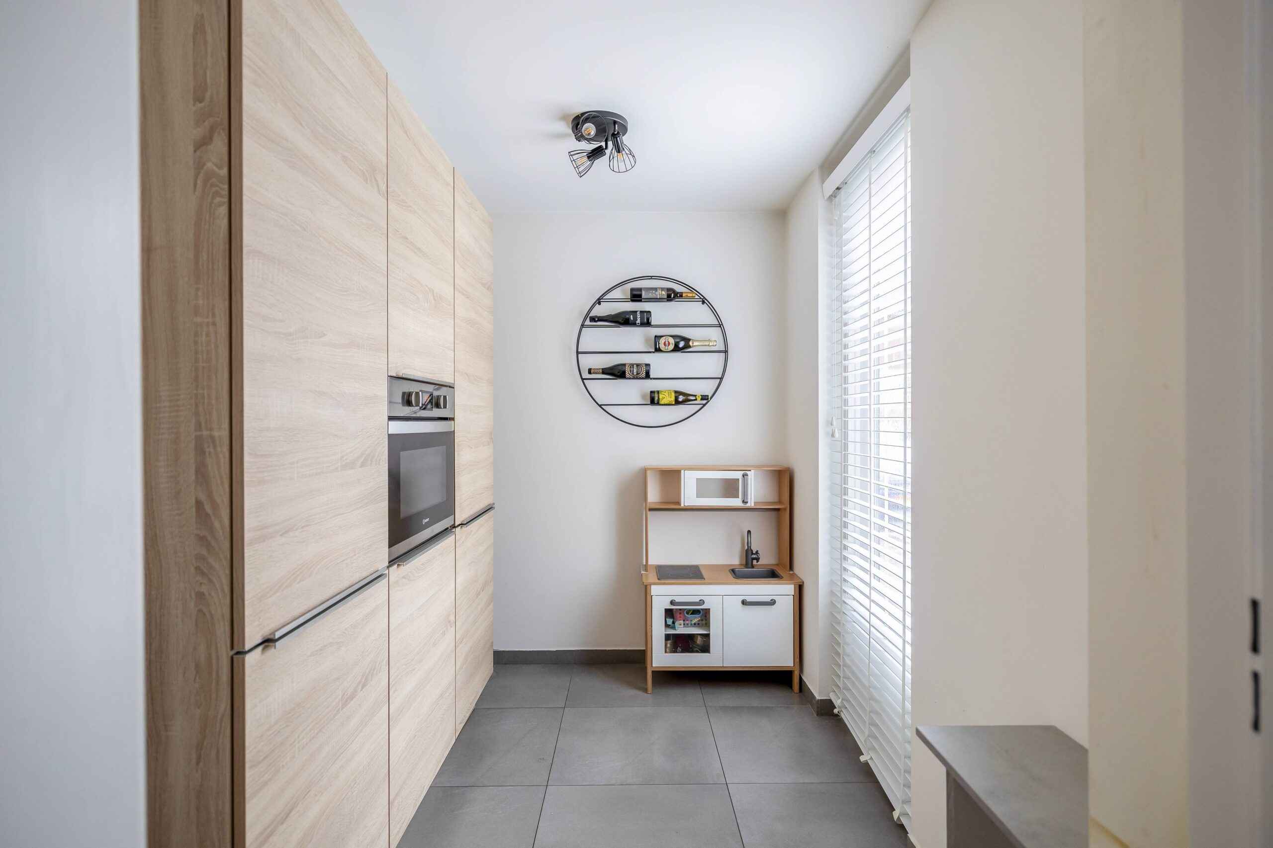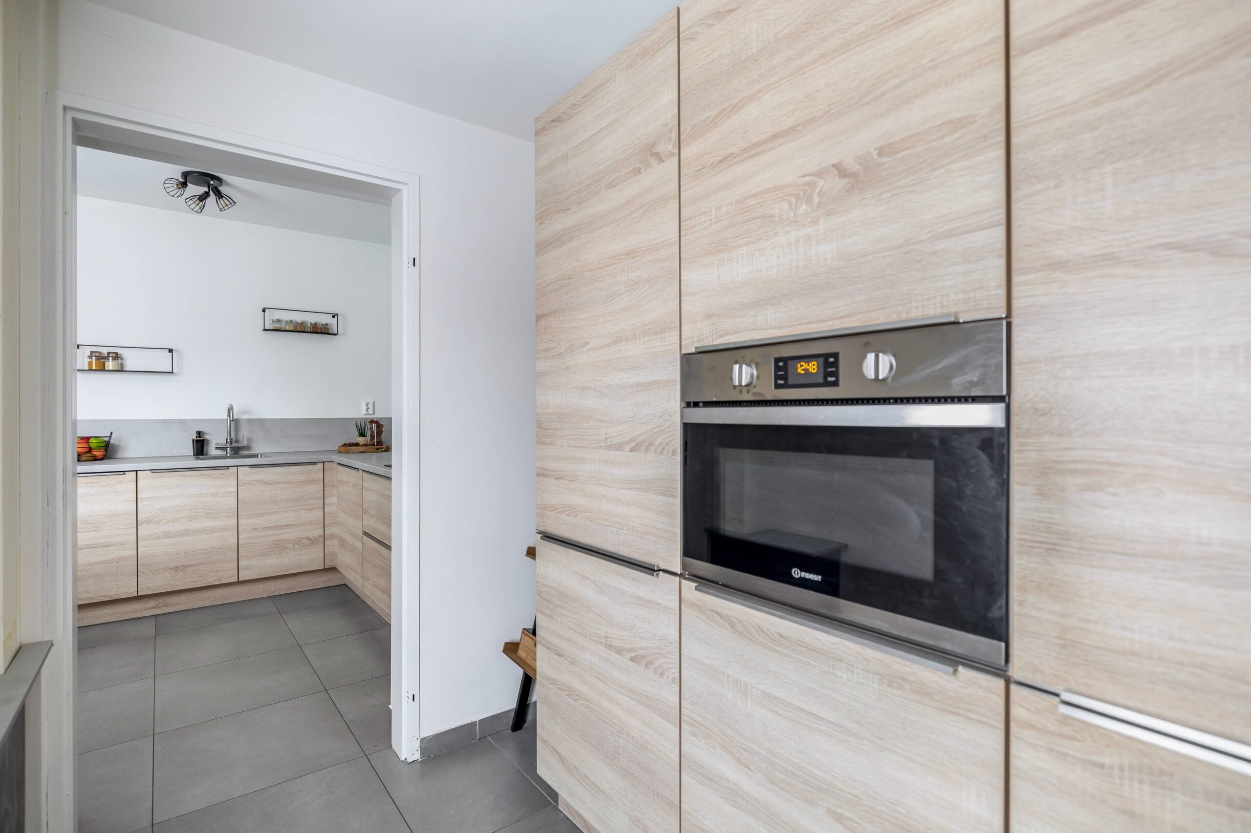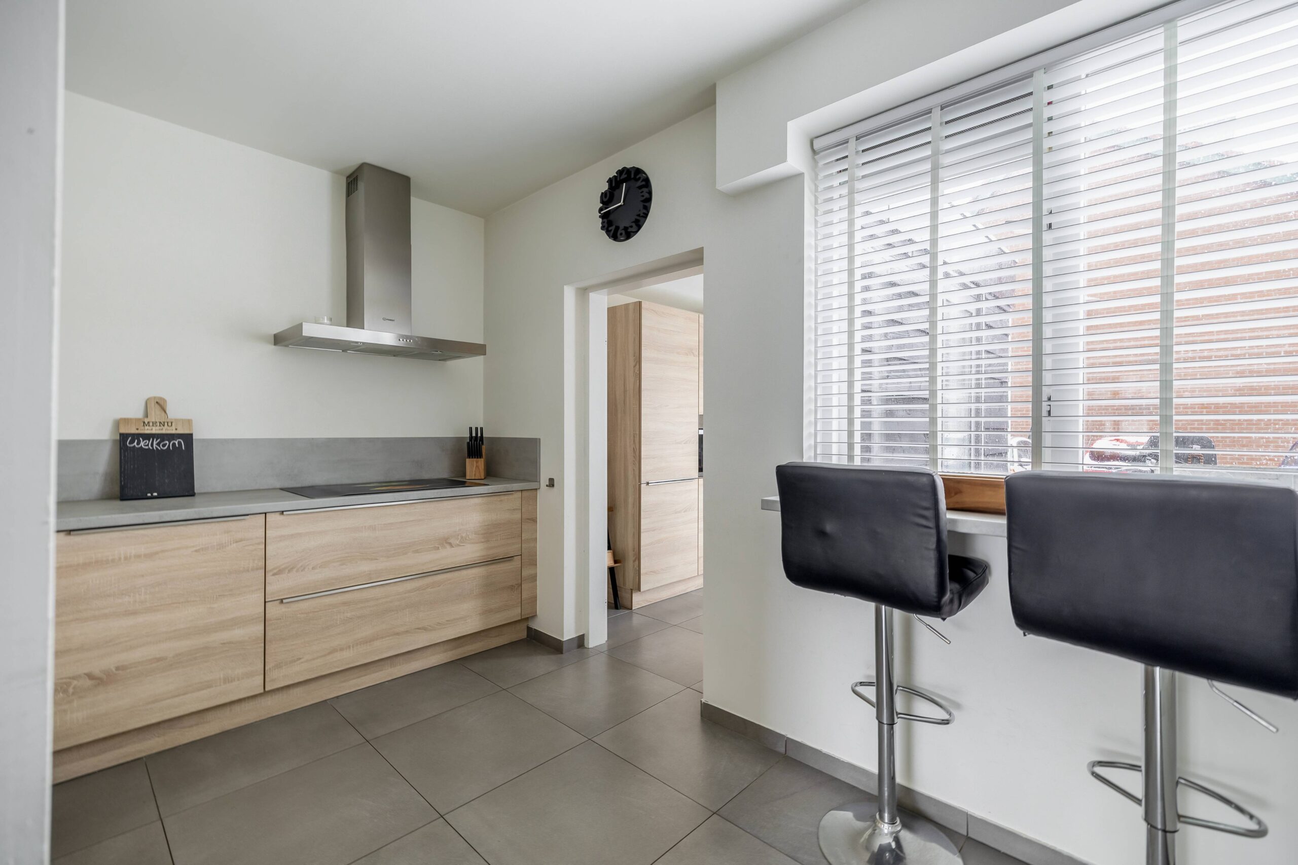 Aan de voorzijde bevindt zich de moderne keuken (2020), uitgerust met een inductiekookplaat, afzuigkap, koel-vriescombinatie, combimagnetron, vaatwasser en een kokend water kraan. Aansluitend ligt de geïsoleerde bijkeuken, die bij de keuken is betrokken en zorgt voor extra ruimte en comfort.