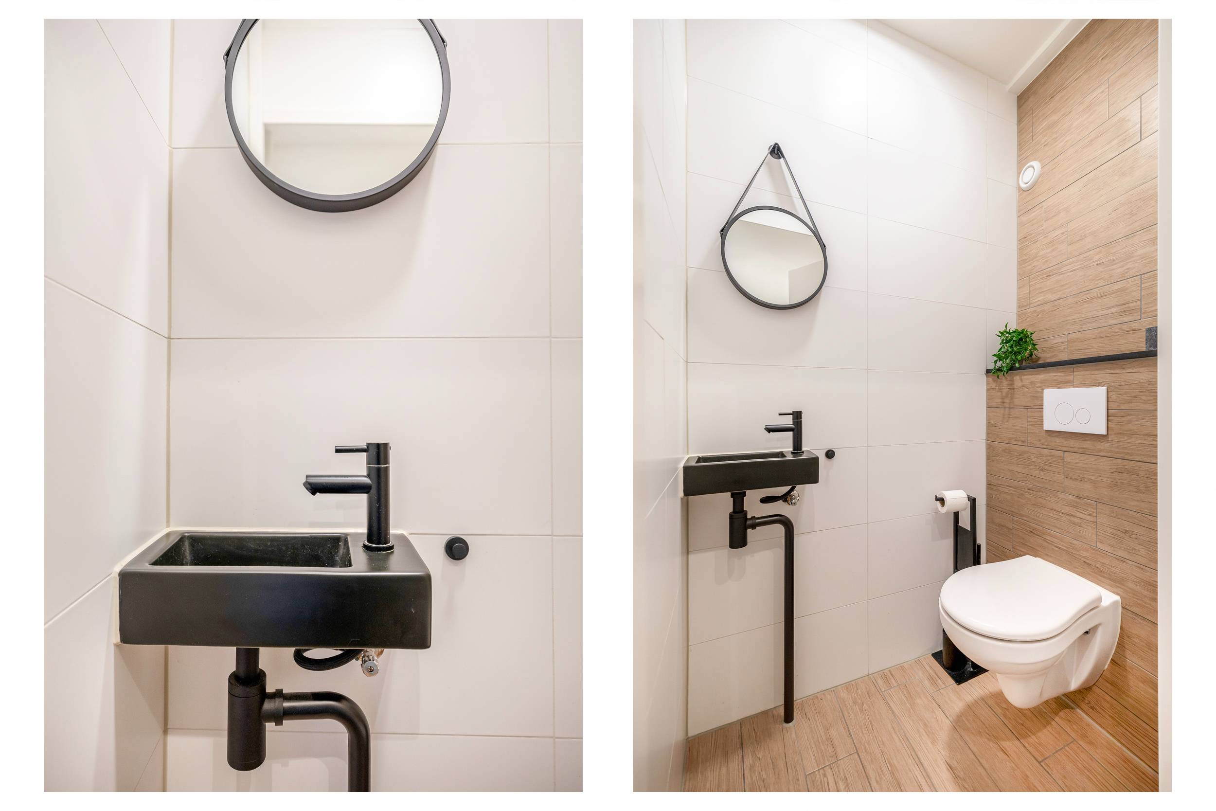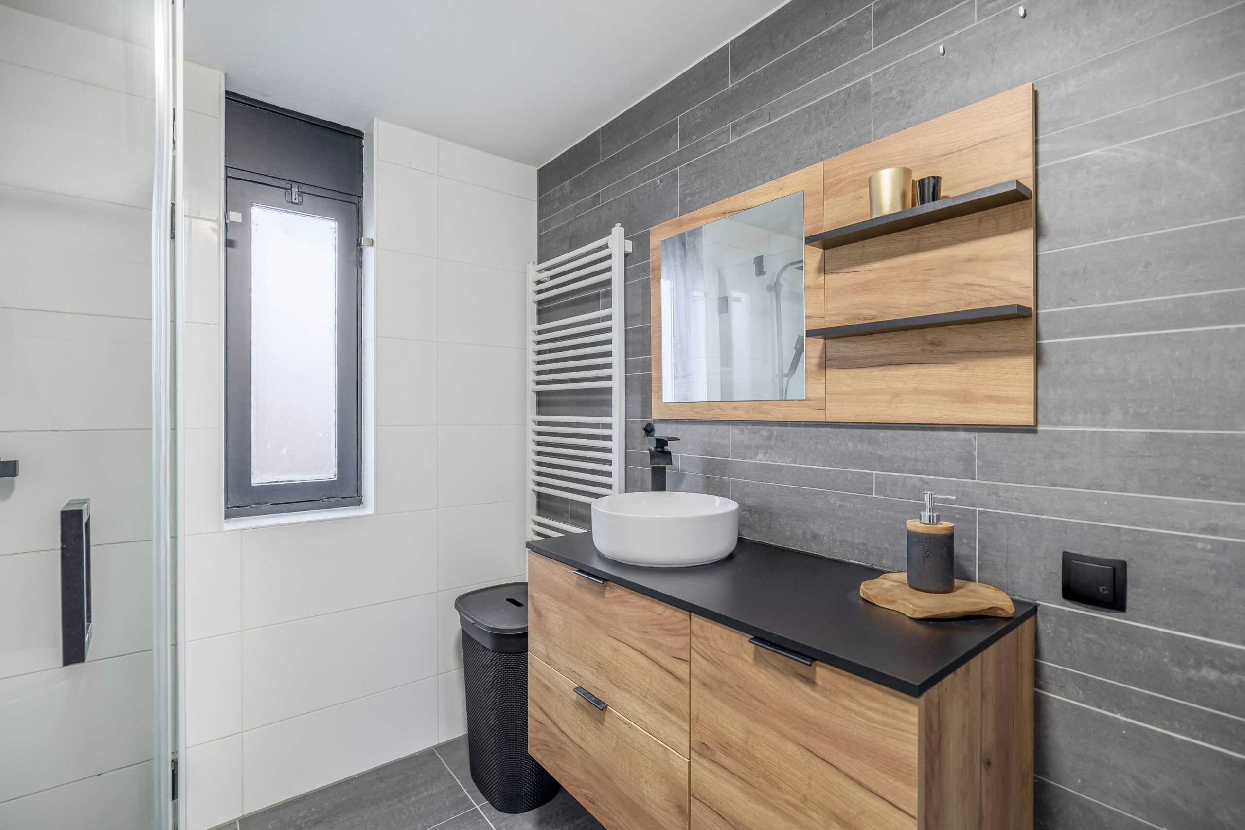 Op de eerste verdieping bevinden zich drie slaapkamers en de moderne badkamer (2023). Deze is voorzien van een wastafelmeubel met waskom, een inloopdouche, een tweede vrijdragend toilet, een handdoekradiator en elektrische vloerverwarming.