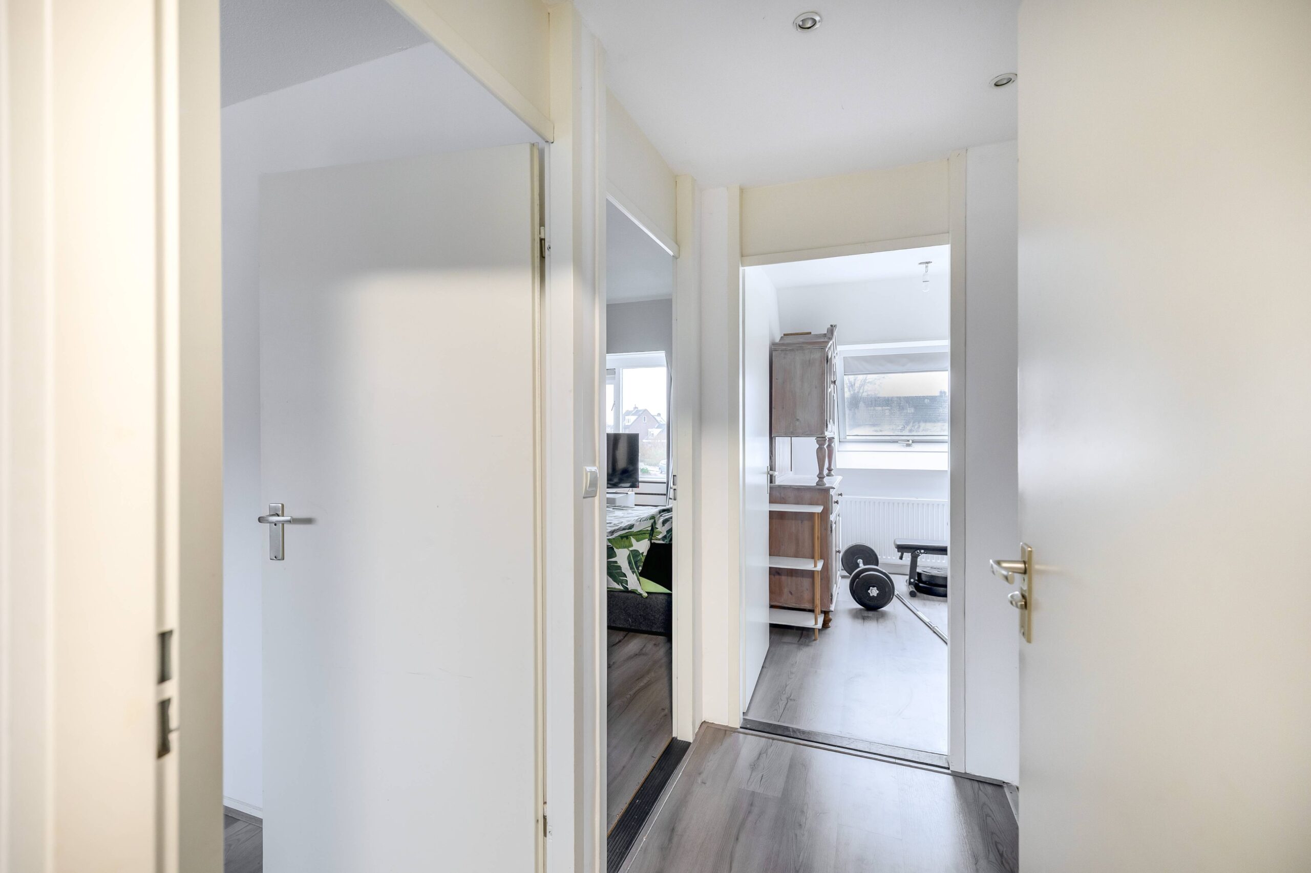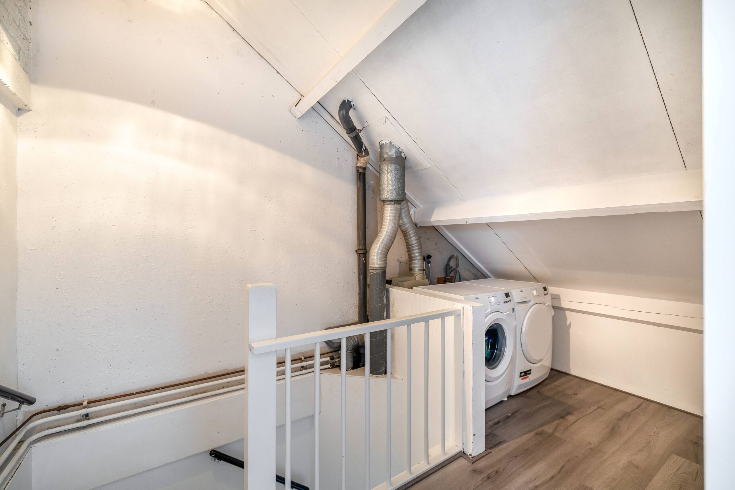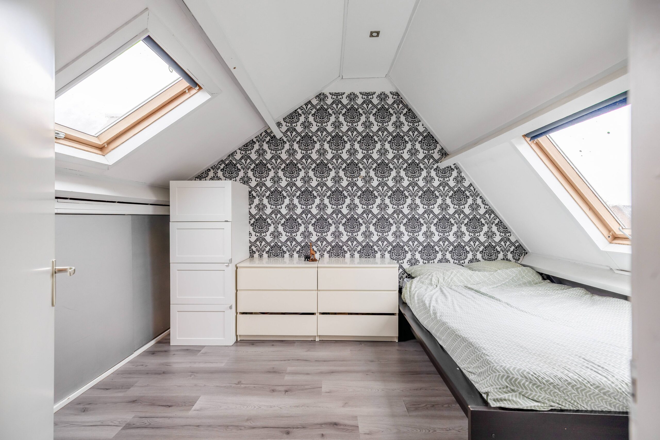 Via een vaste trap bereik je de zolderverdieping. Op de voorzolder zijn de cv-ketel, mechanische ventilatiebox en aansluitingen voor het witgoed geplaatst. Aansluitend ligt een ruime vierde slaapkamer met praktische knieschotten en twee dakvensters.