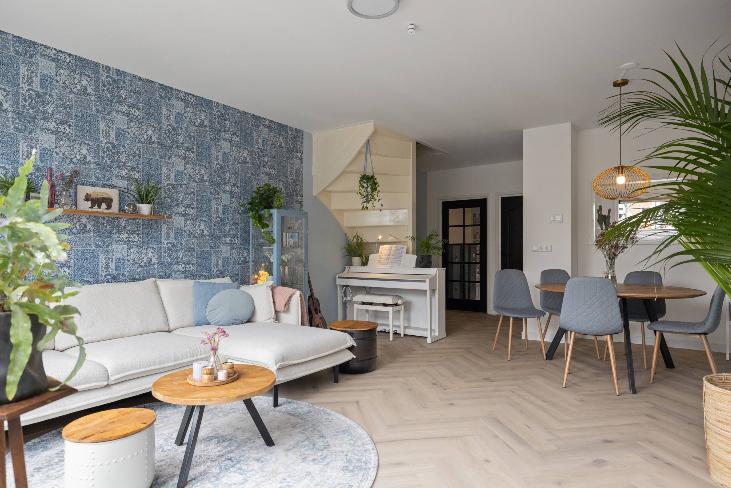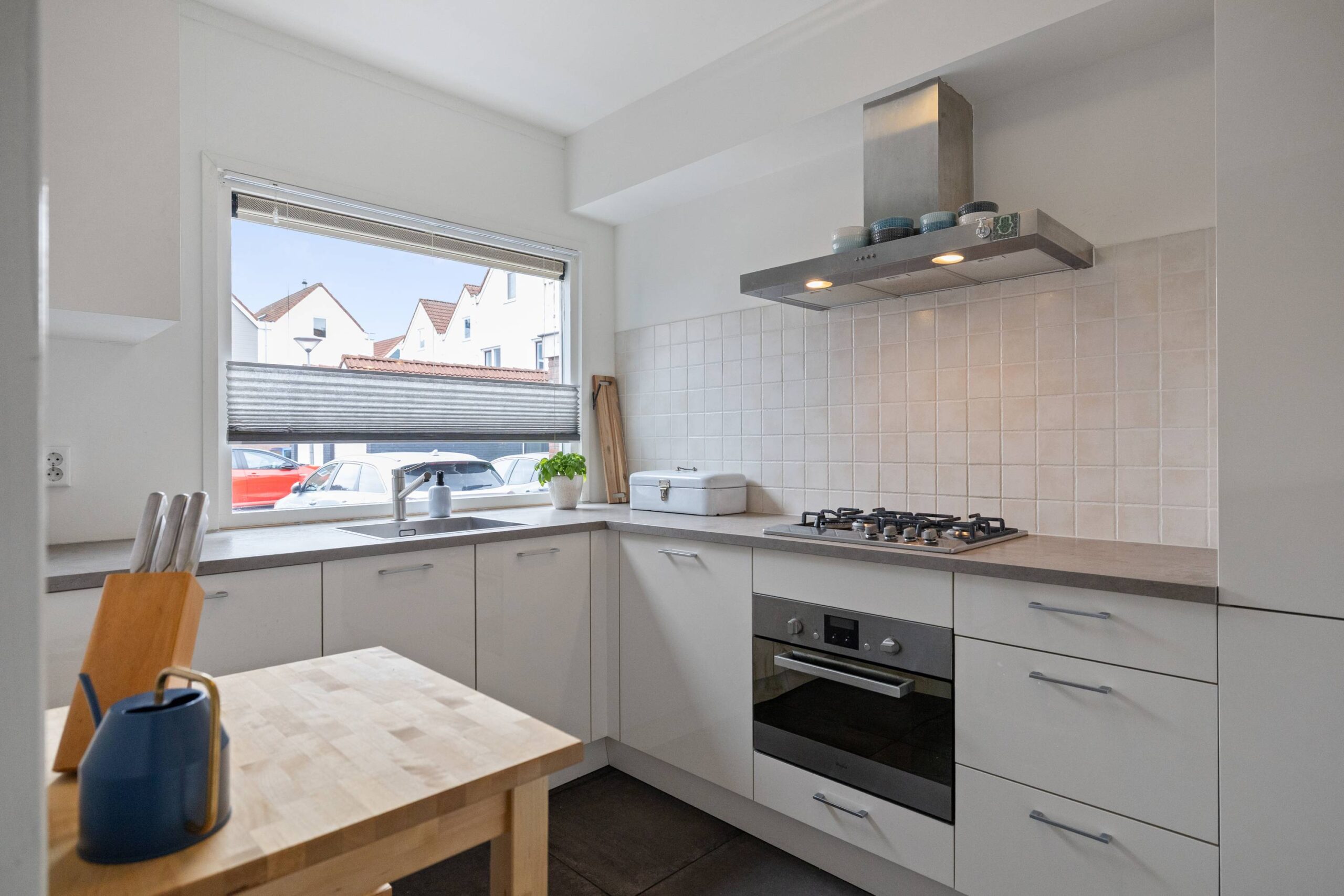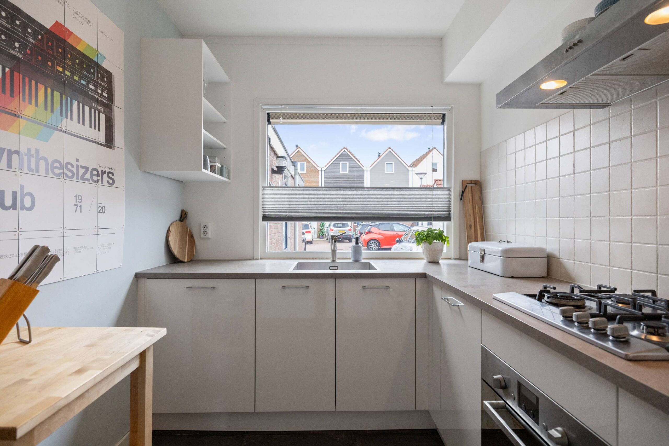 De woonkamer is erg licht dankzij de grote raampartijen en openslaande deuren naar de achtertuin. Op de vloer ligt een moderne pvc-vloer (2023 en topkwaliteit) in visgraat met daaronder vloerverwarming. Aan de voorzijde van de woning tref je de halfopen keuken. Deze is in hoekopstelling geplaatst en ingericht met een 4-pits gaskookplaat, afzuigkap, koel-vriescombinatie, vaatwasser en combimagnetron.