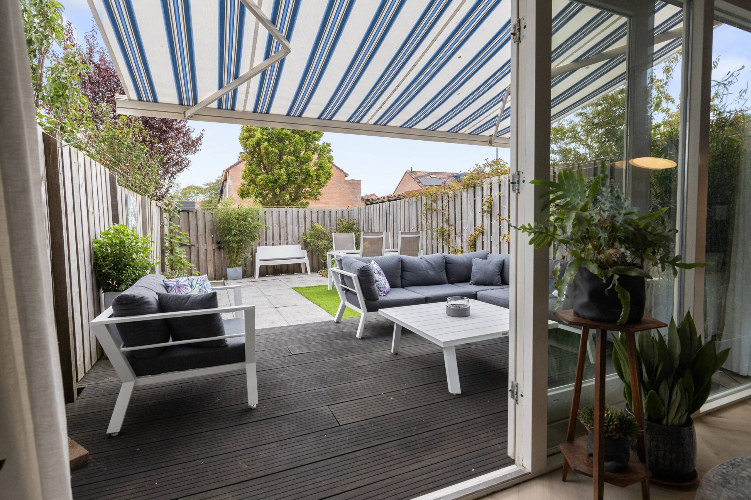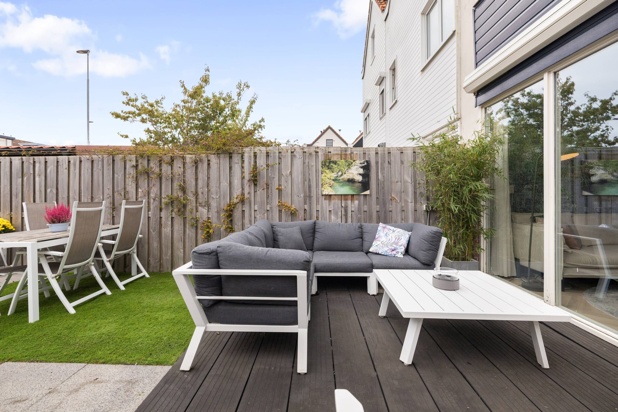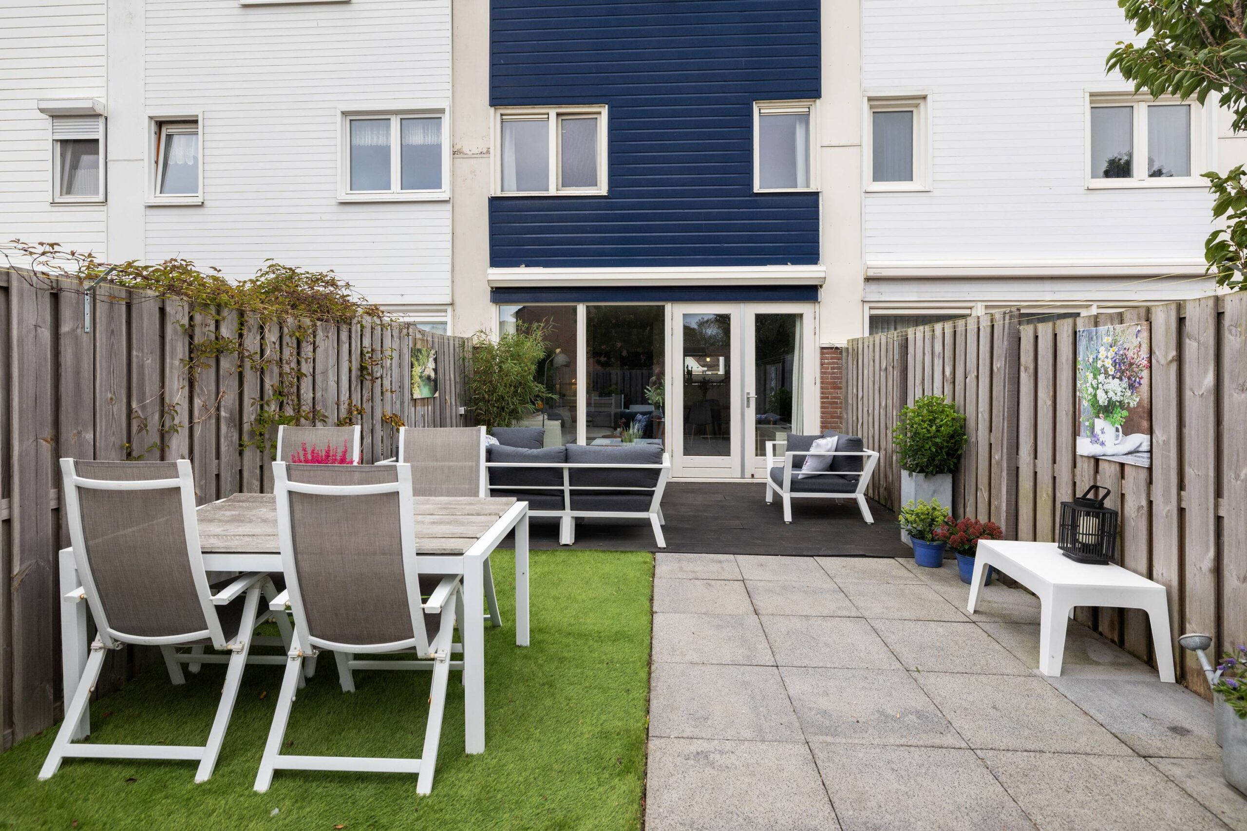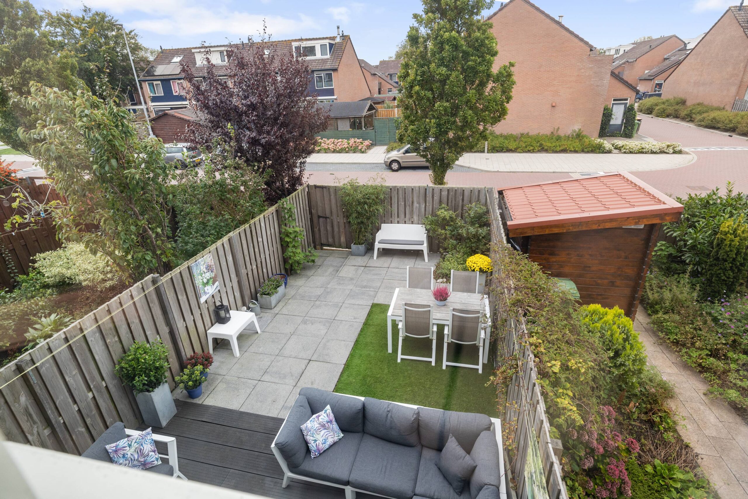 De achtertuin is op het zonnige westen gelegen en voorzien van een kunststof vlonderterras, bestrating en kunstgras. De tuin biedt veel privacy en voldoende ruimte om van de zon te genieten. Dankzij het elektrische zonnescherm is het ook mogelijk om een plek in de schaduw te creëren. Er is een achterom aanwezig.