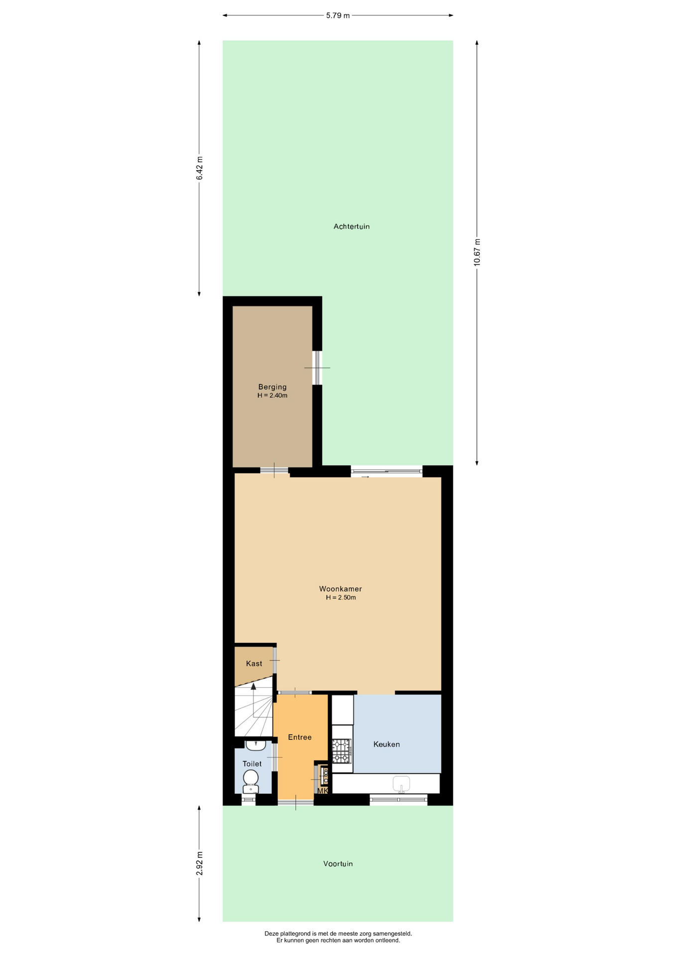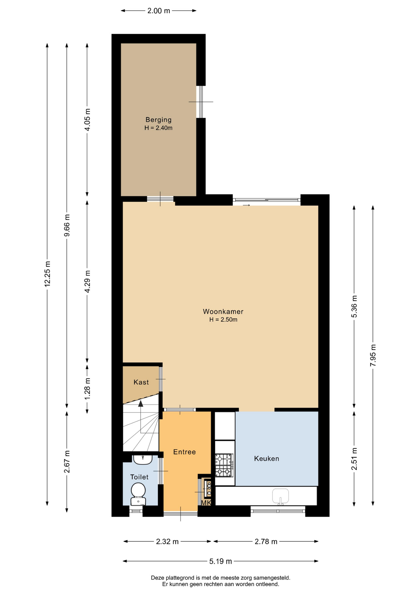Via de voortuin kom je bij de entree. Hal met meterkast en het toilet. De meterkast is al vernieuwd en voorbereid op elektrisch koken. De woonkamer is voorzien van gesausde wanden en een praktische trapkast. Open keuken aan de voorzijde met een hoekopgestelde inbouwkeuken ingericht met een gaskookplaat, afzuigkap, koel-/vrieskast en vaatwasser. Aansluitend de berging met toegang tot de tuin. In de zomer kan de schuifpui lekker open naar de achtertuin.