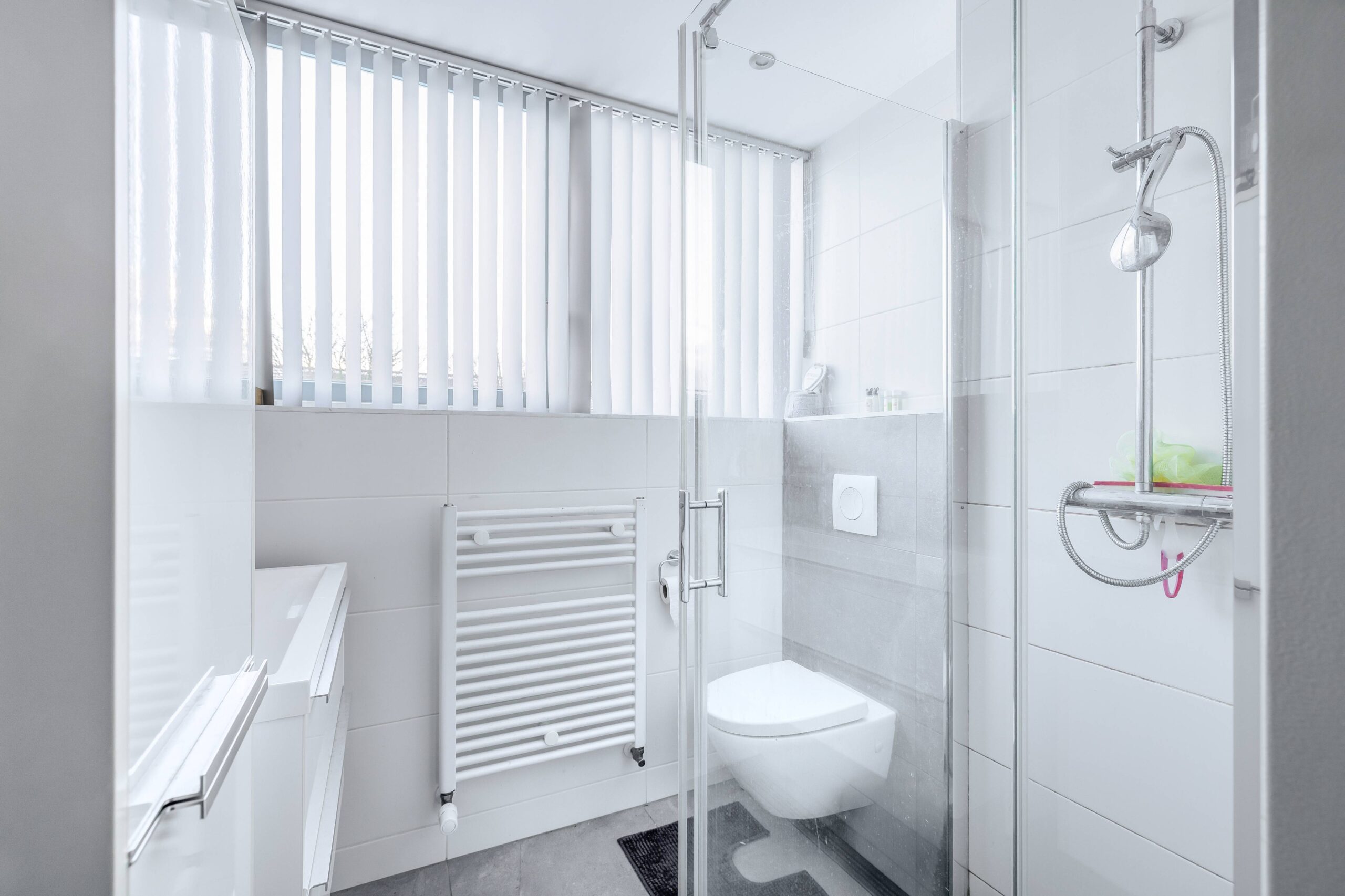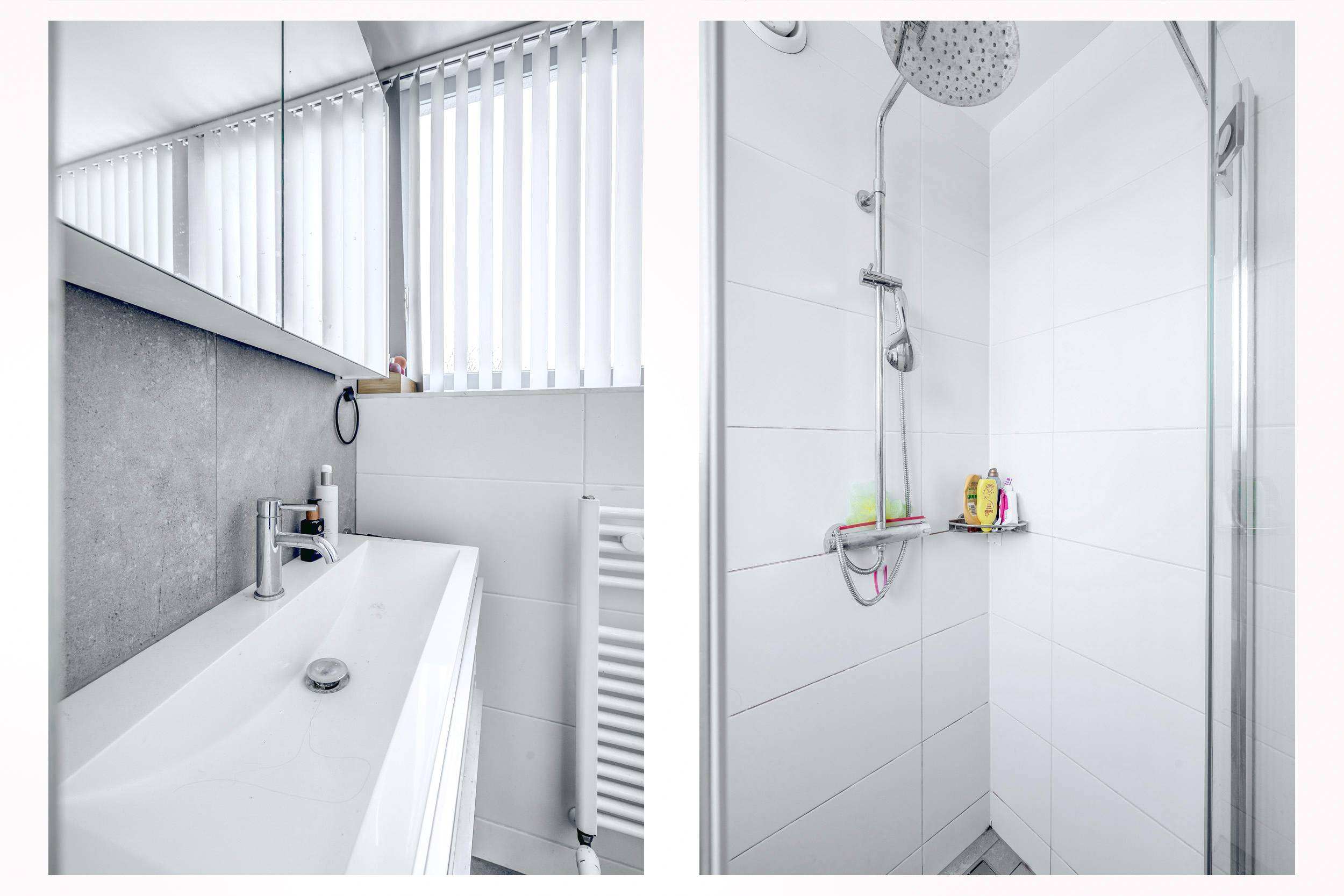 De badkamer is keurig ingericht met een 2e vrijdragend toilet, douchecabine en wastafelmeubel.