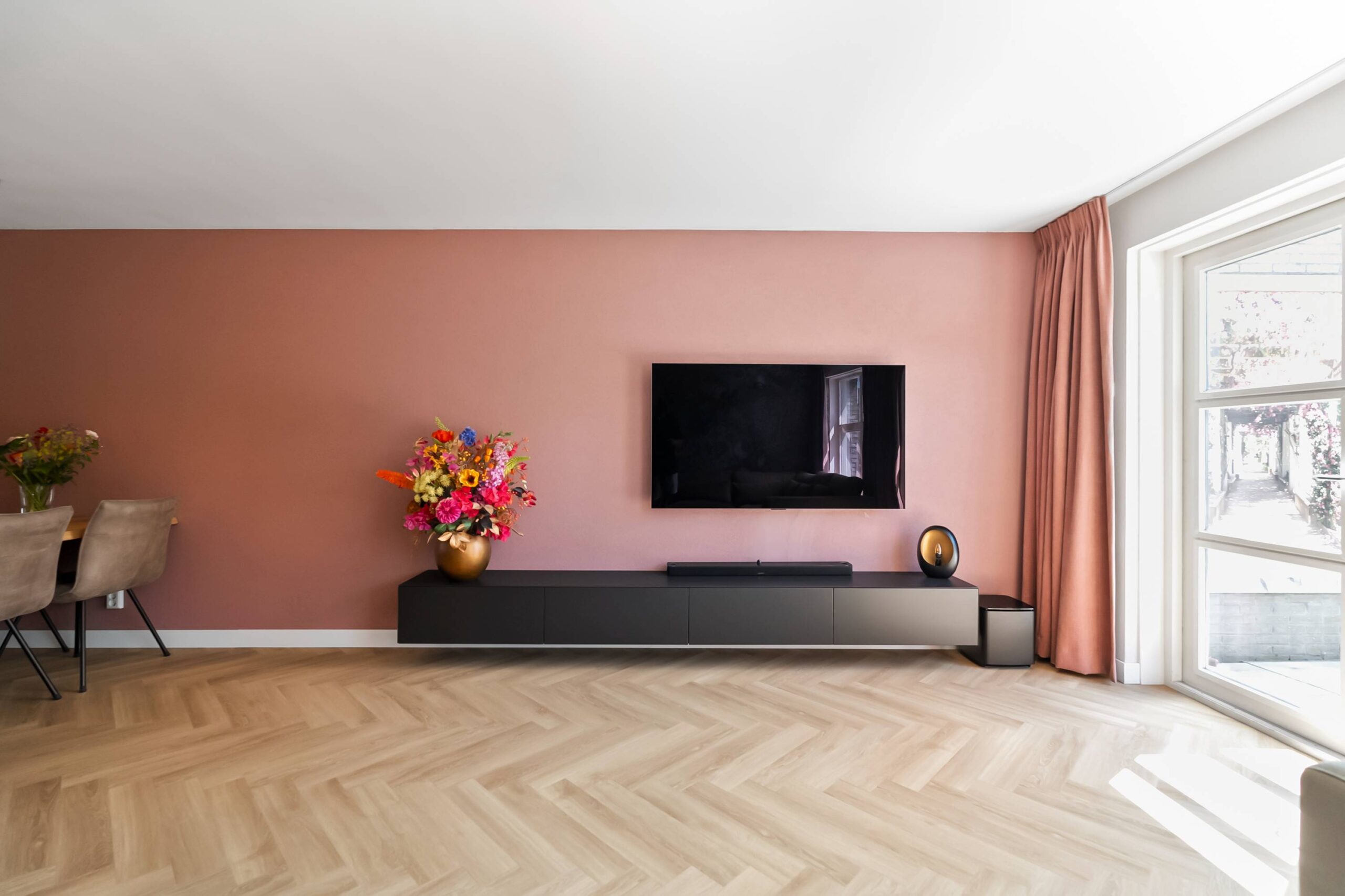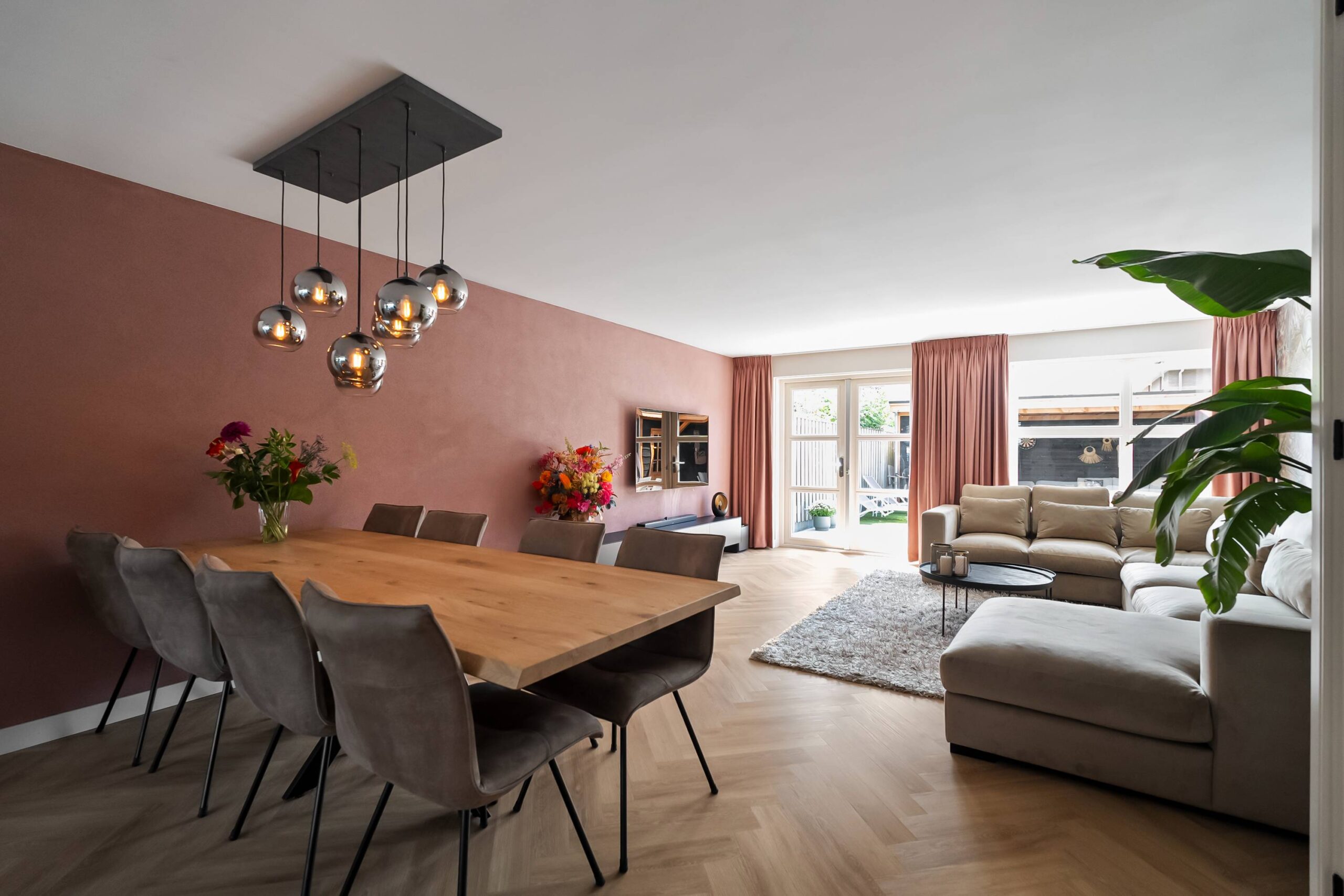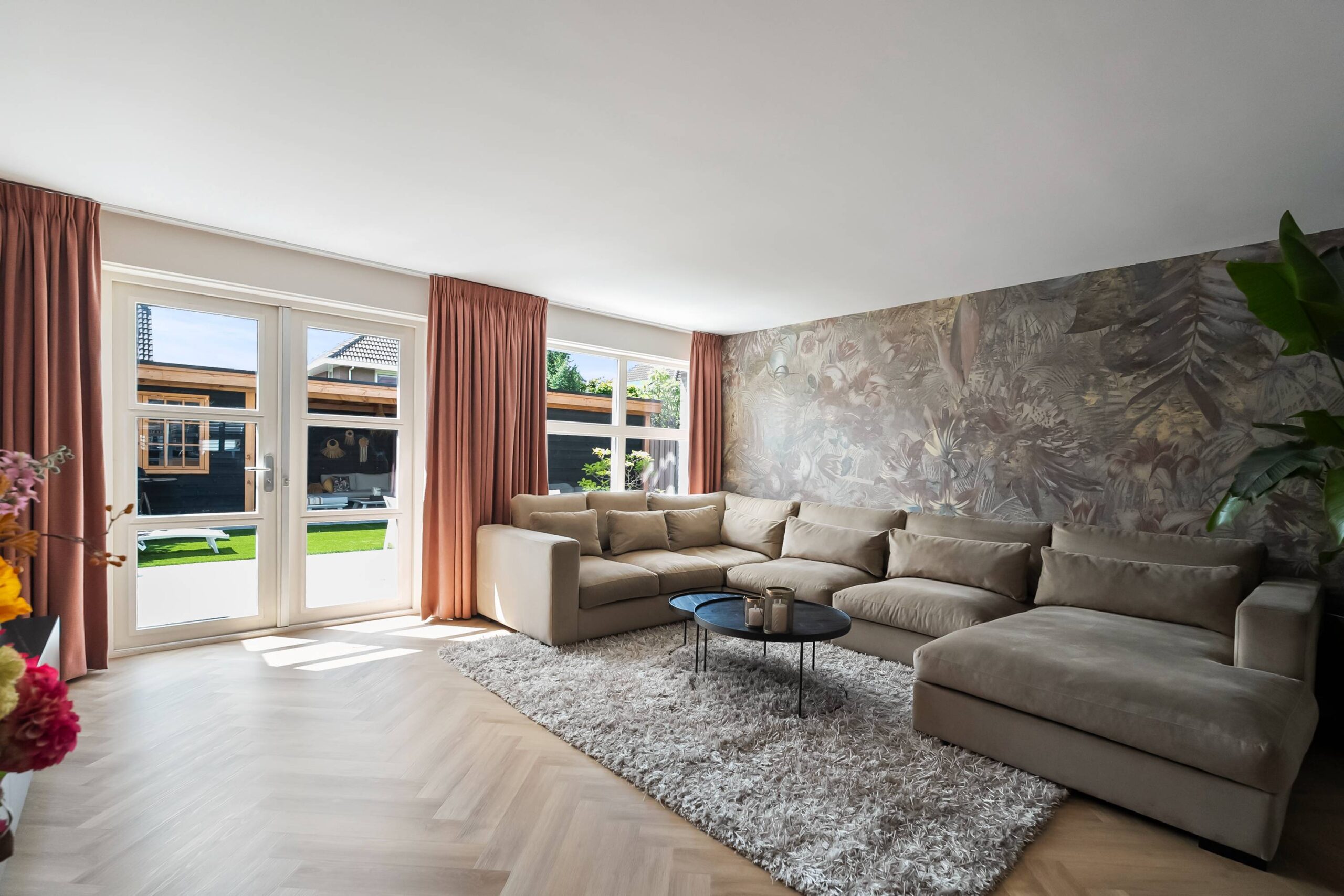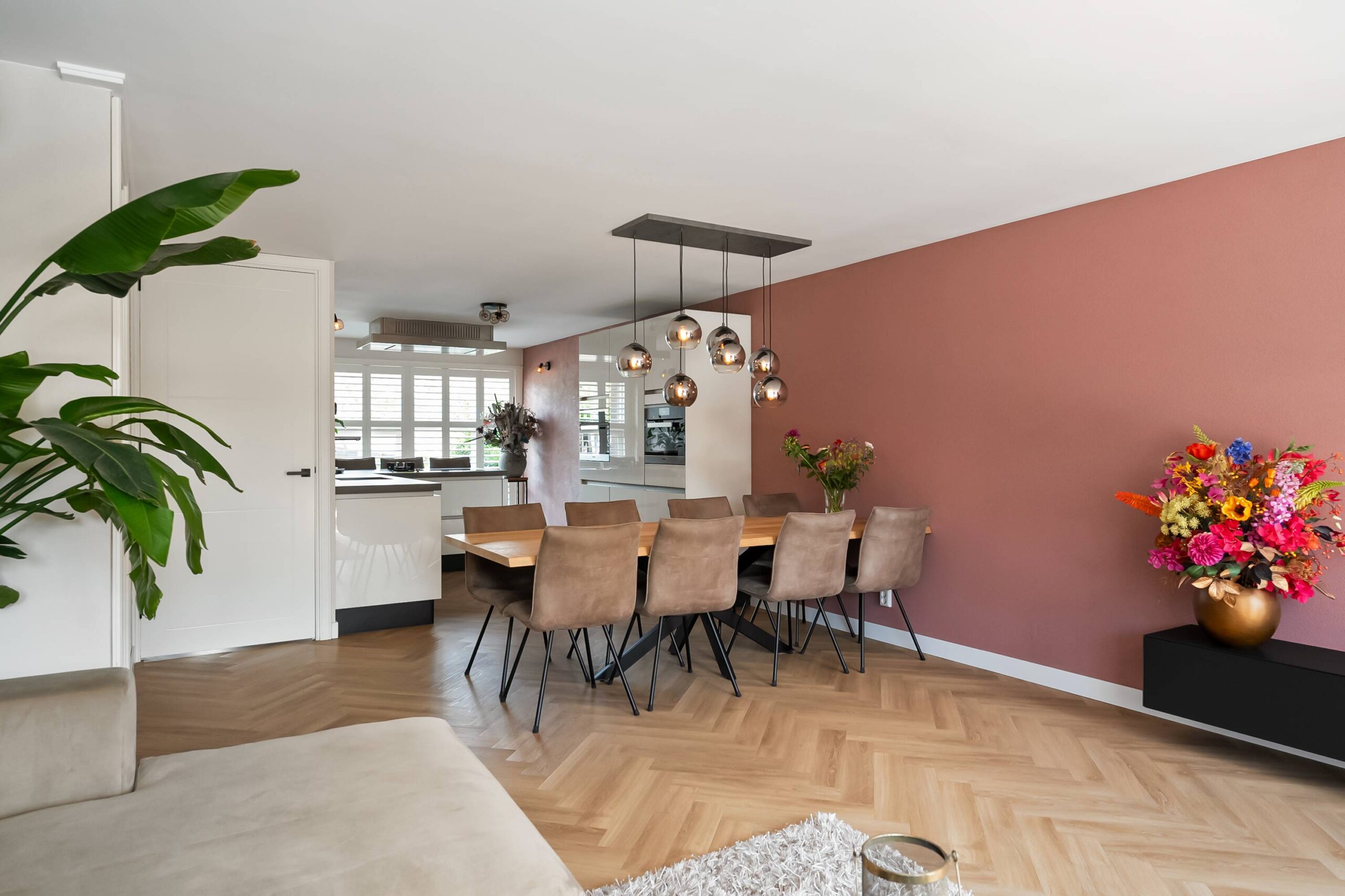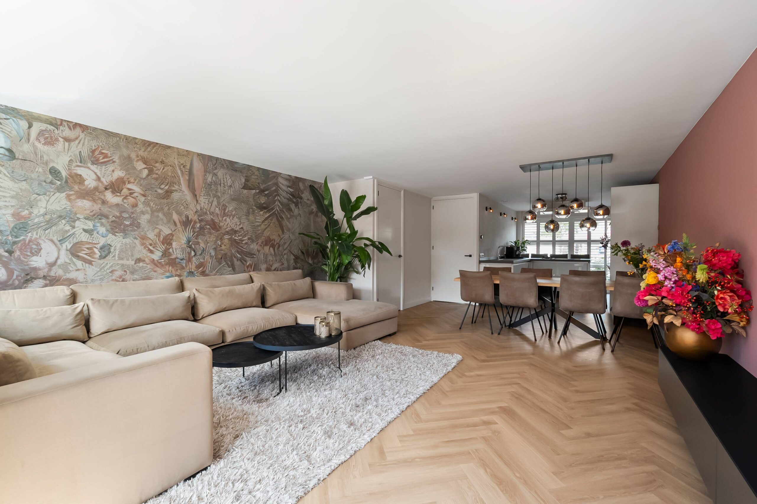 De woonkamer is tuingericht en is voorzien van een mooie visgraat pvc vloer, gestuukte en behangen wanden en een glad gestuukt plafond. Deuren naar de zonnige achtertuin. Verwarming via vloerverwarming. Trapkast met de verdeler.