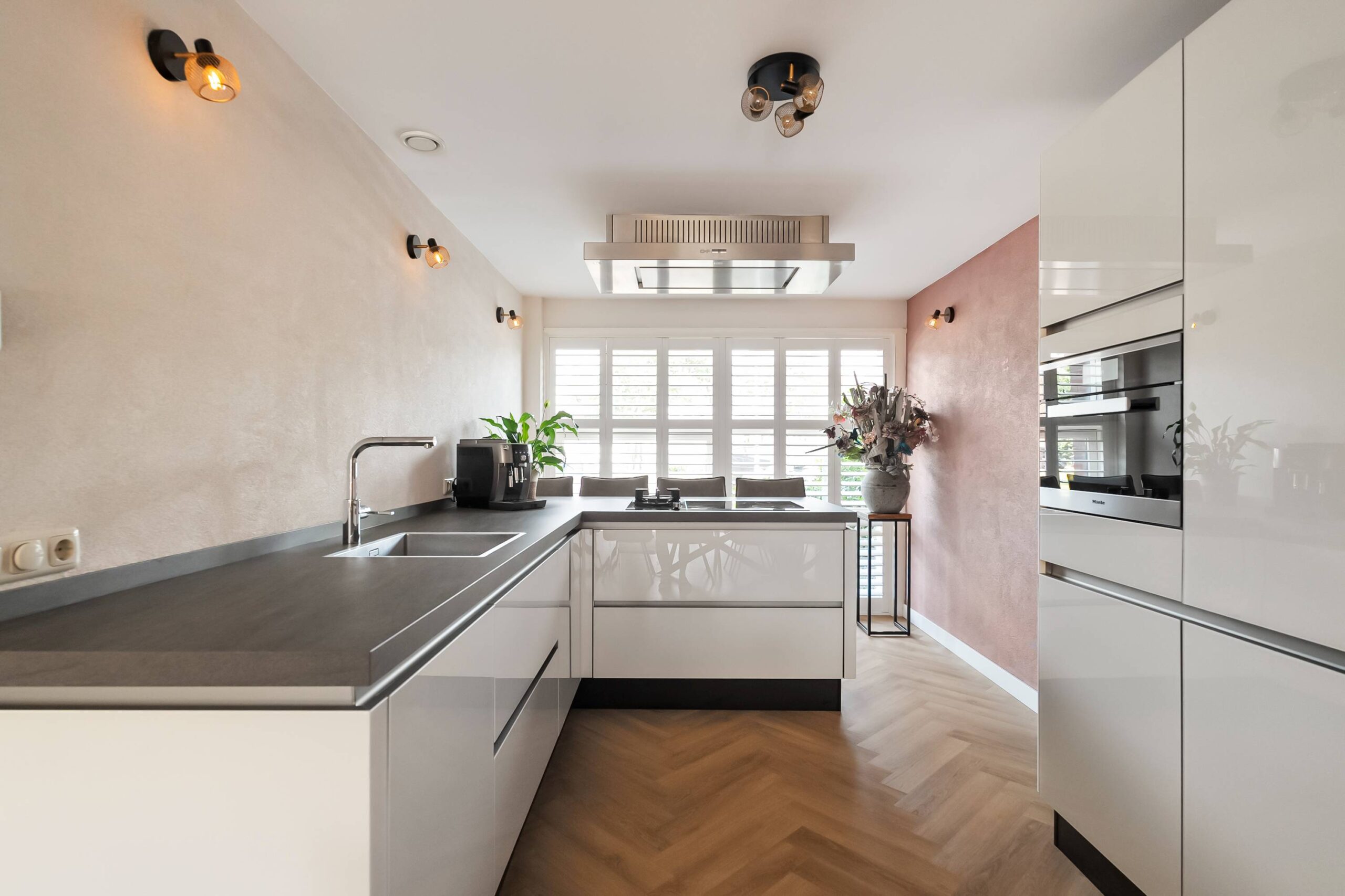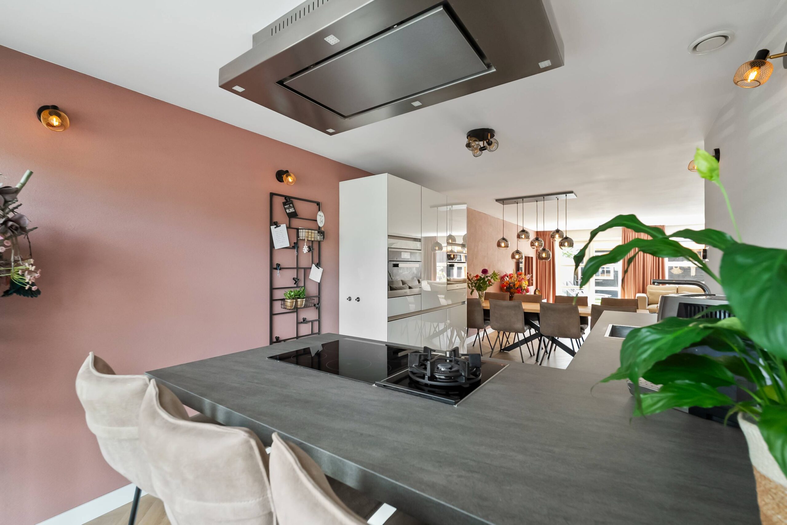 De luxe open keuken is aan de voorzijde van de woning voorzien van veel kastruimte en inbouwapparatuur zoals een combimagnetron, stoomoven, afzuigkap, 5 pits inductiekookplaat met 1 wokbrander (gas), koel-/vrieskast en vaatwasser.
