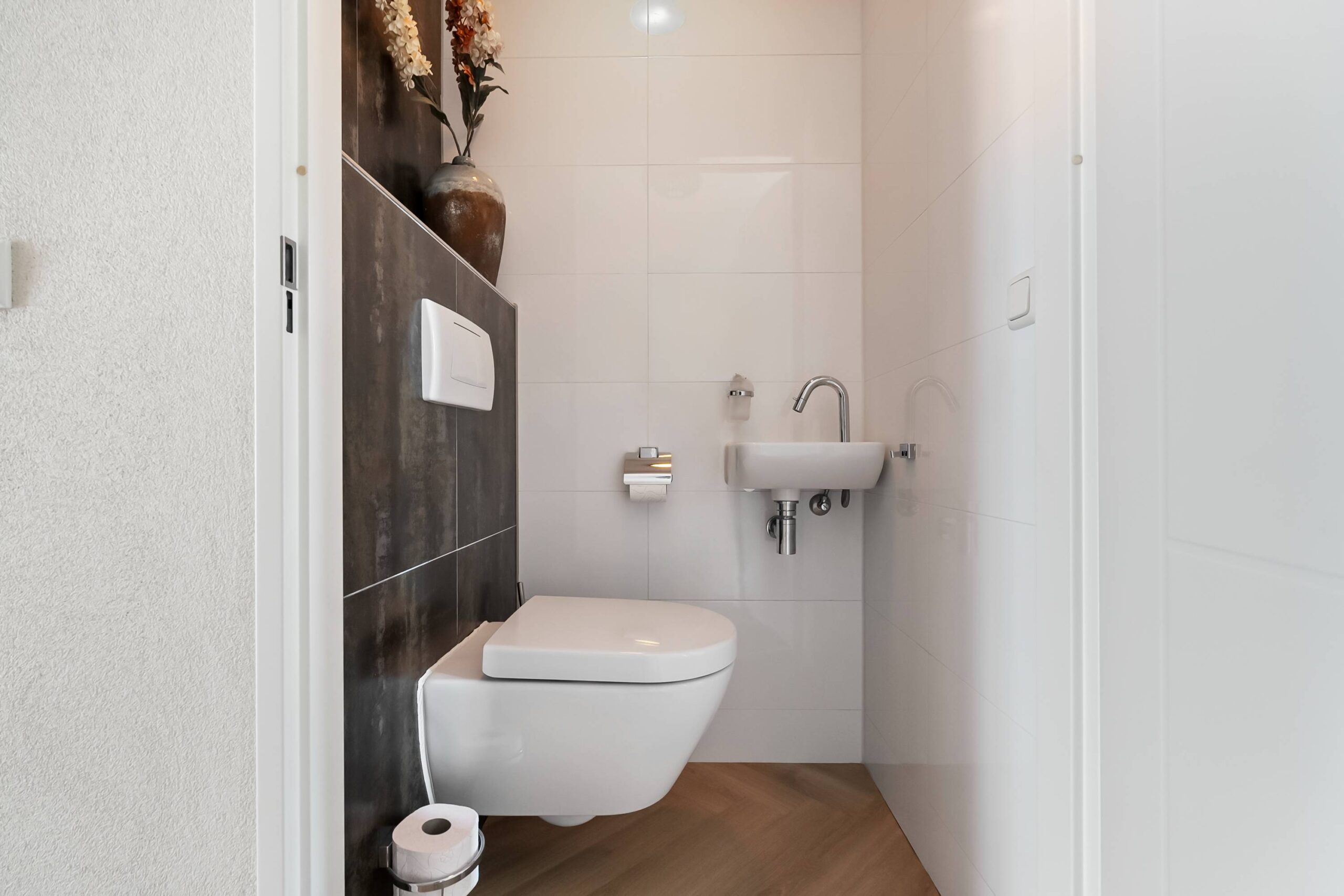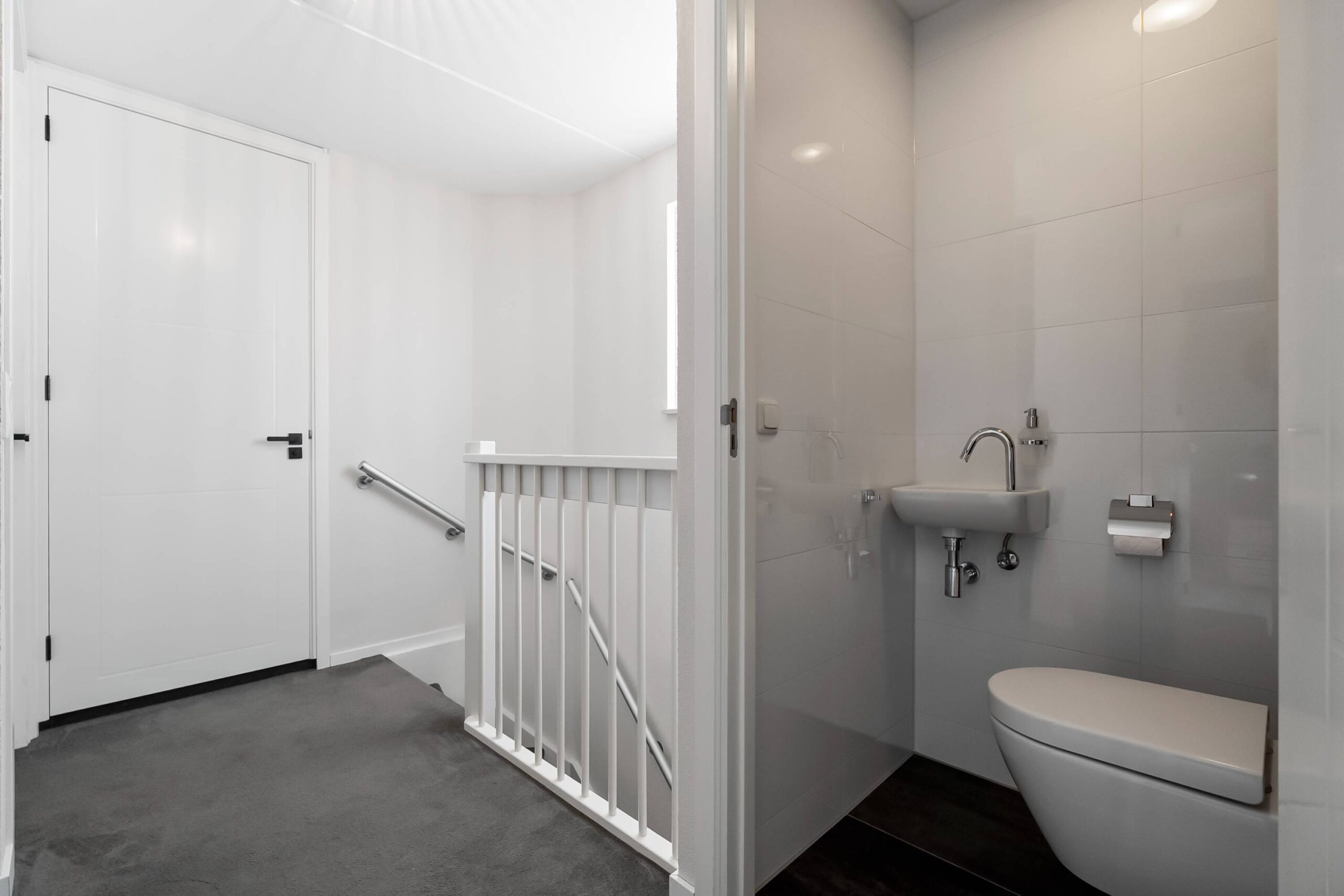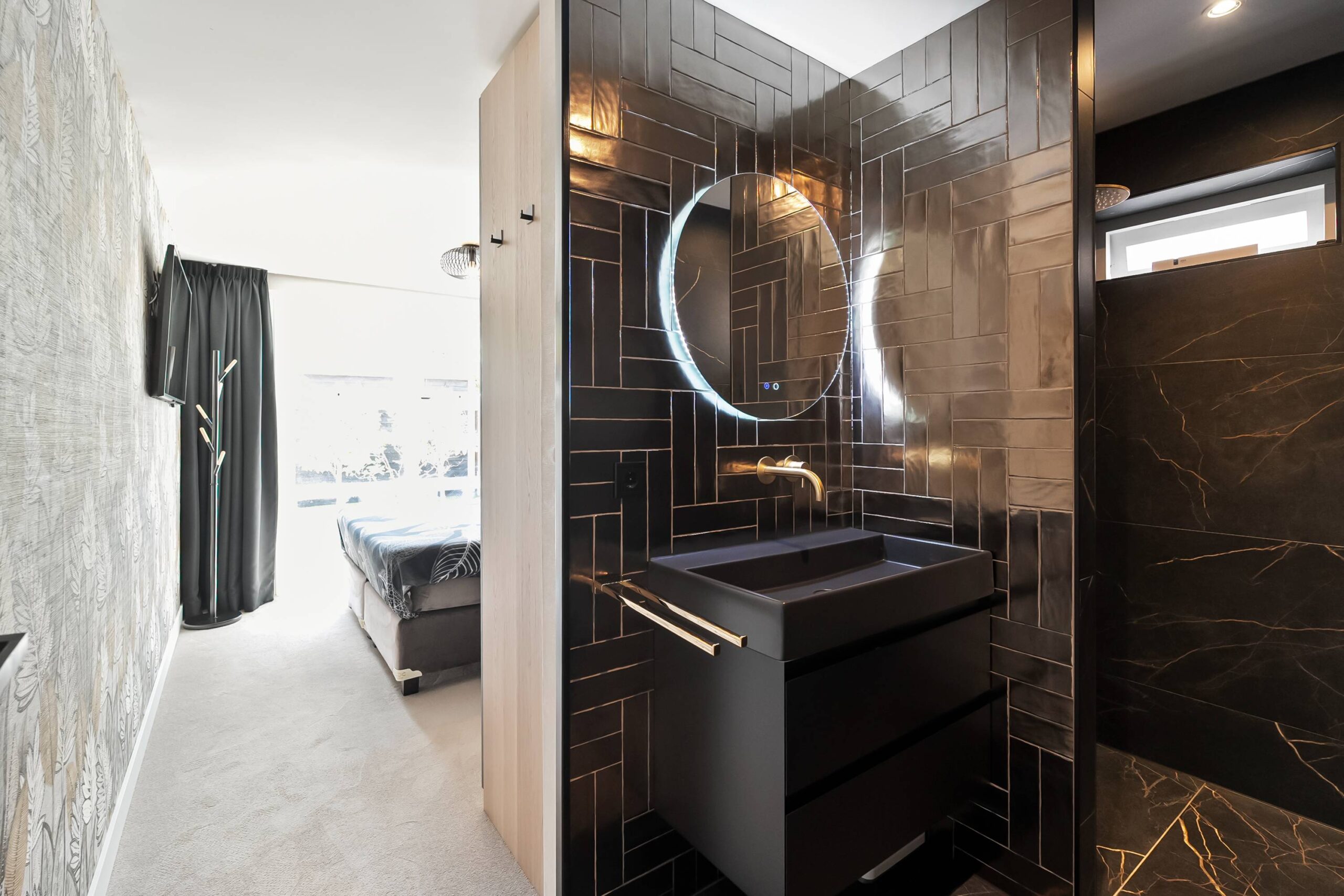 Vanuit de hal bereik je de tussenhal met veel extra ruimte. De slaapkamer op de begane grond heeft een luxe eigen badkamer (2 jaar oud) met een inloopdouche, wastafelmeubel en een zijraam.