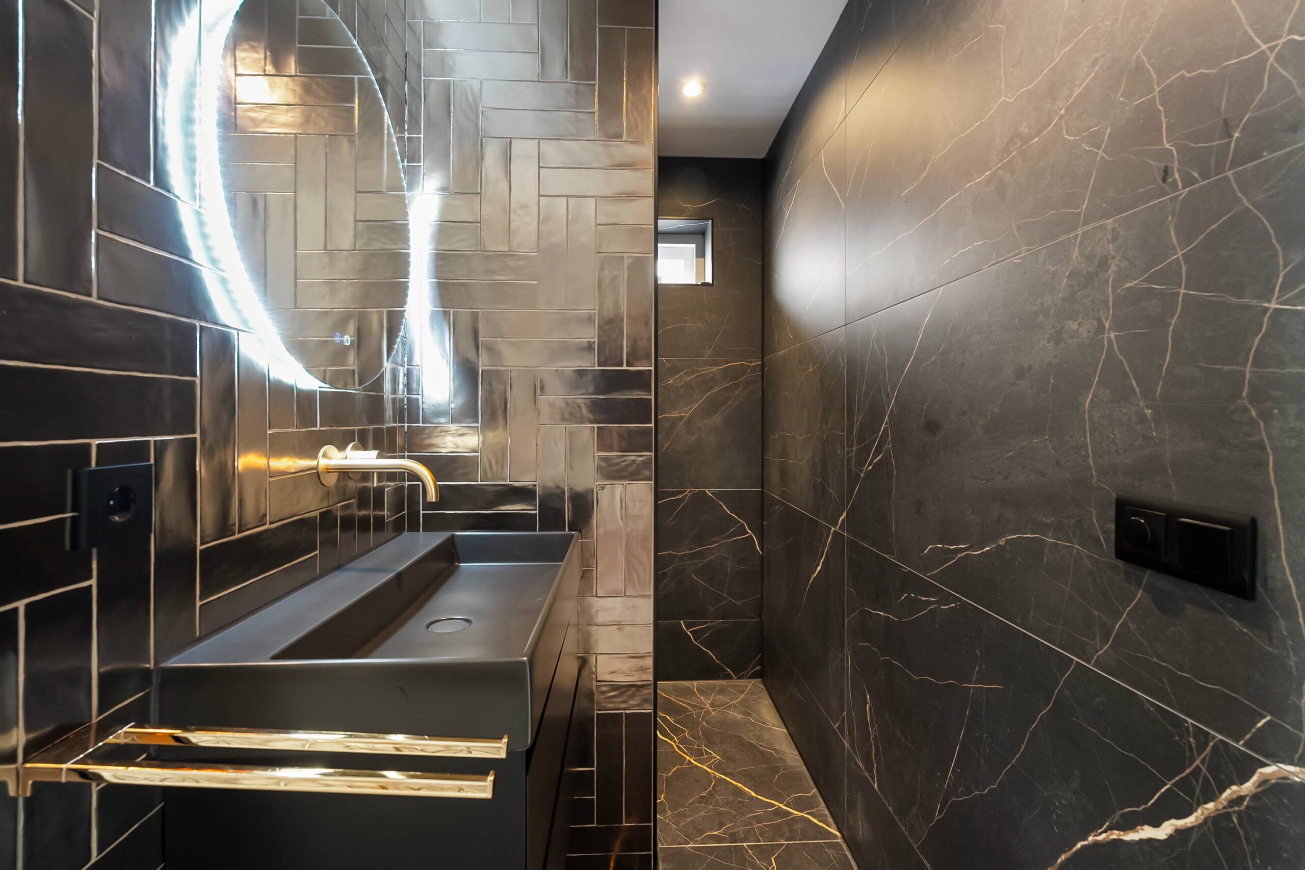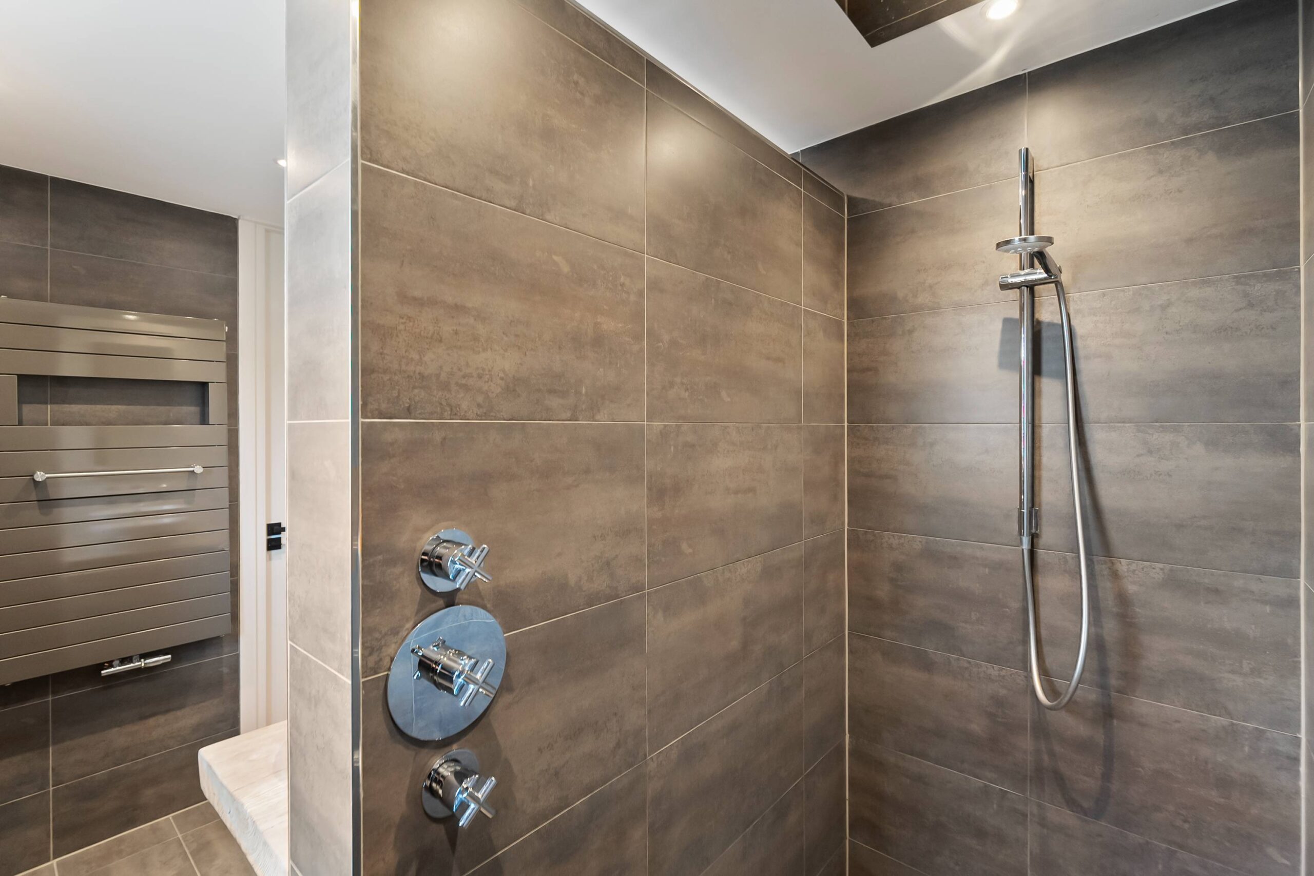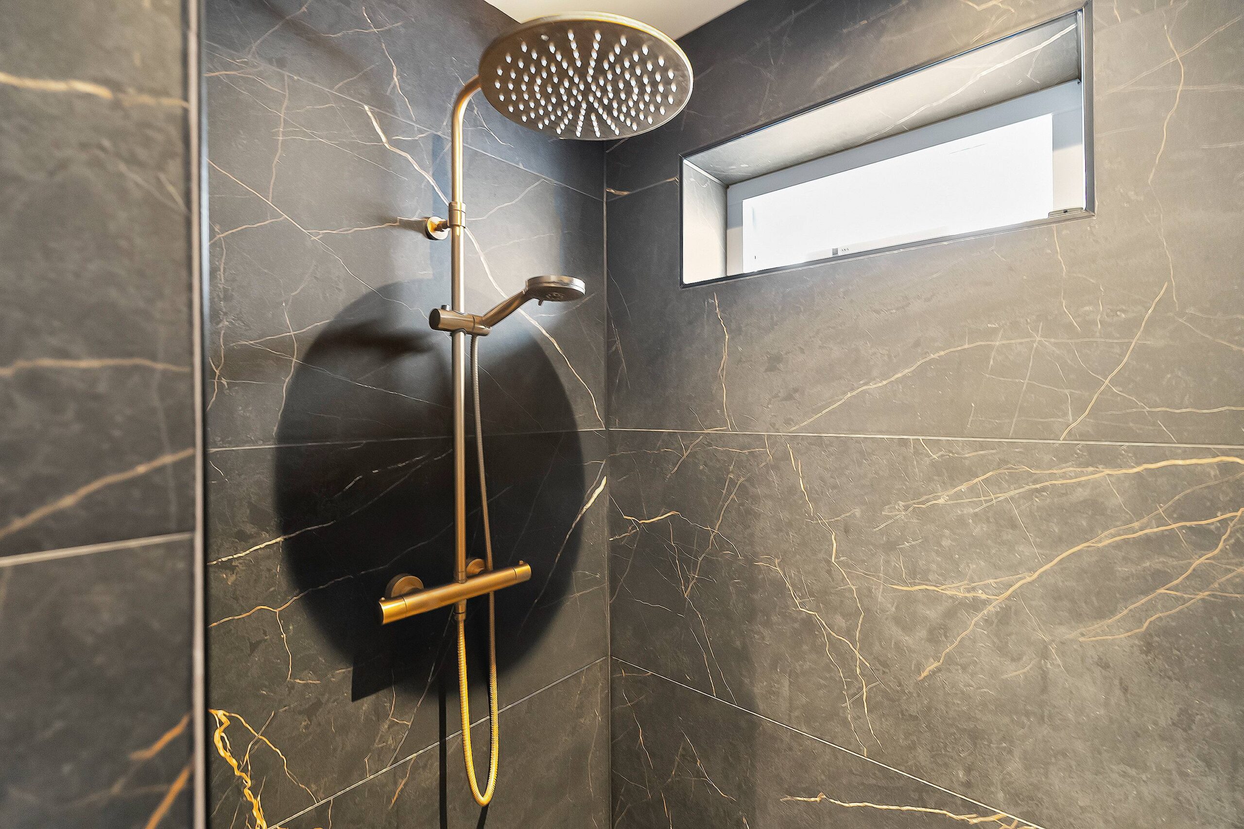 Vanuit de hal bereik je de tussenhal met veel extra ruimte. De slaapkamer op de begane grond heeft een luxe eigen badkamer (2 jaar oud) met een inloopdouche, wastafelmeubel en een zijraam.