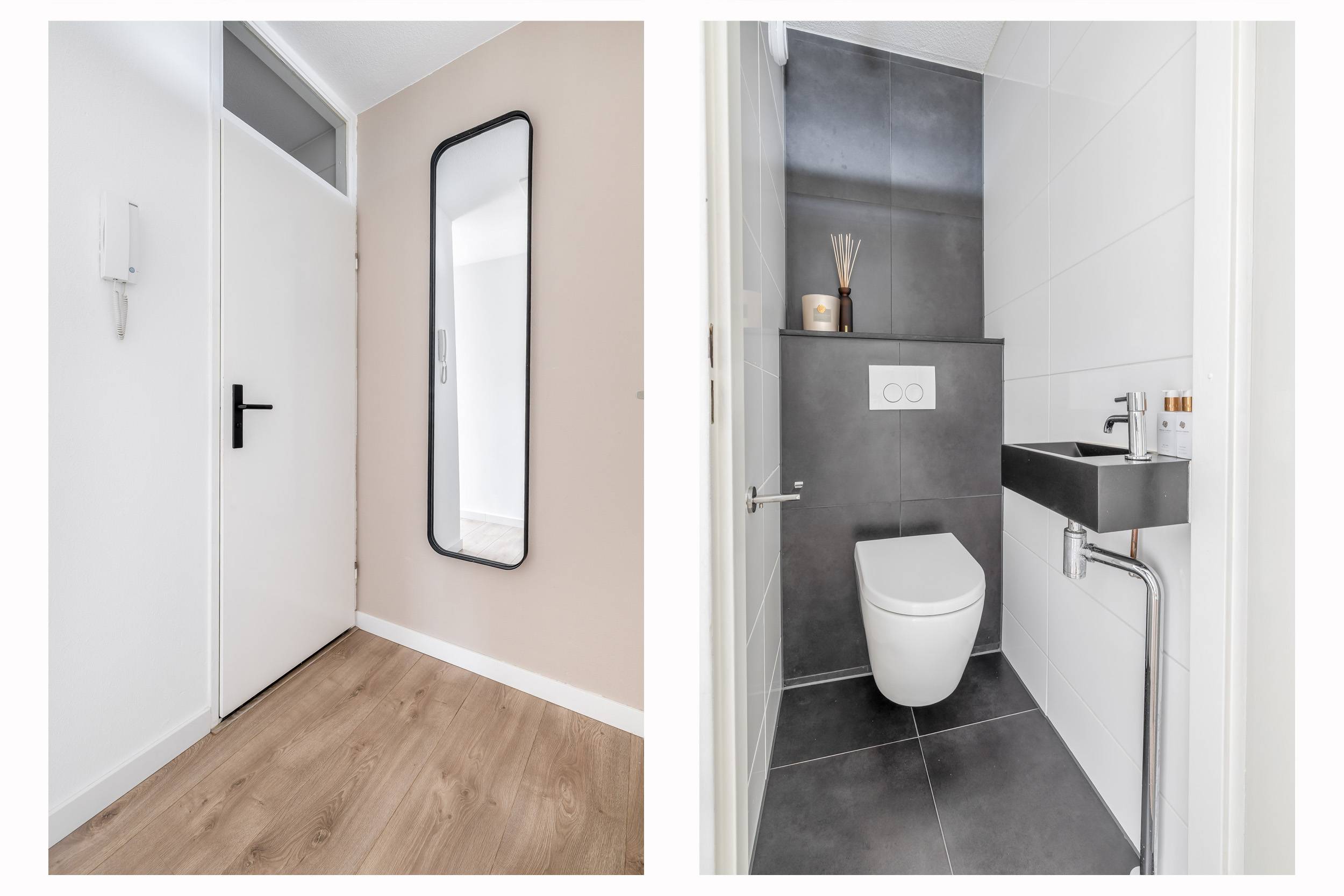 Het appartement beschikt over twee gelijkwaardige slaapkamers. Ook het toilet en de badkamer zijn modern uitgevoerd, eveneens in een rustige, neutrale stijl. De aansluiting voor de wasmachine en wasdroger bevindt zich in de badkamer.
