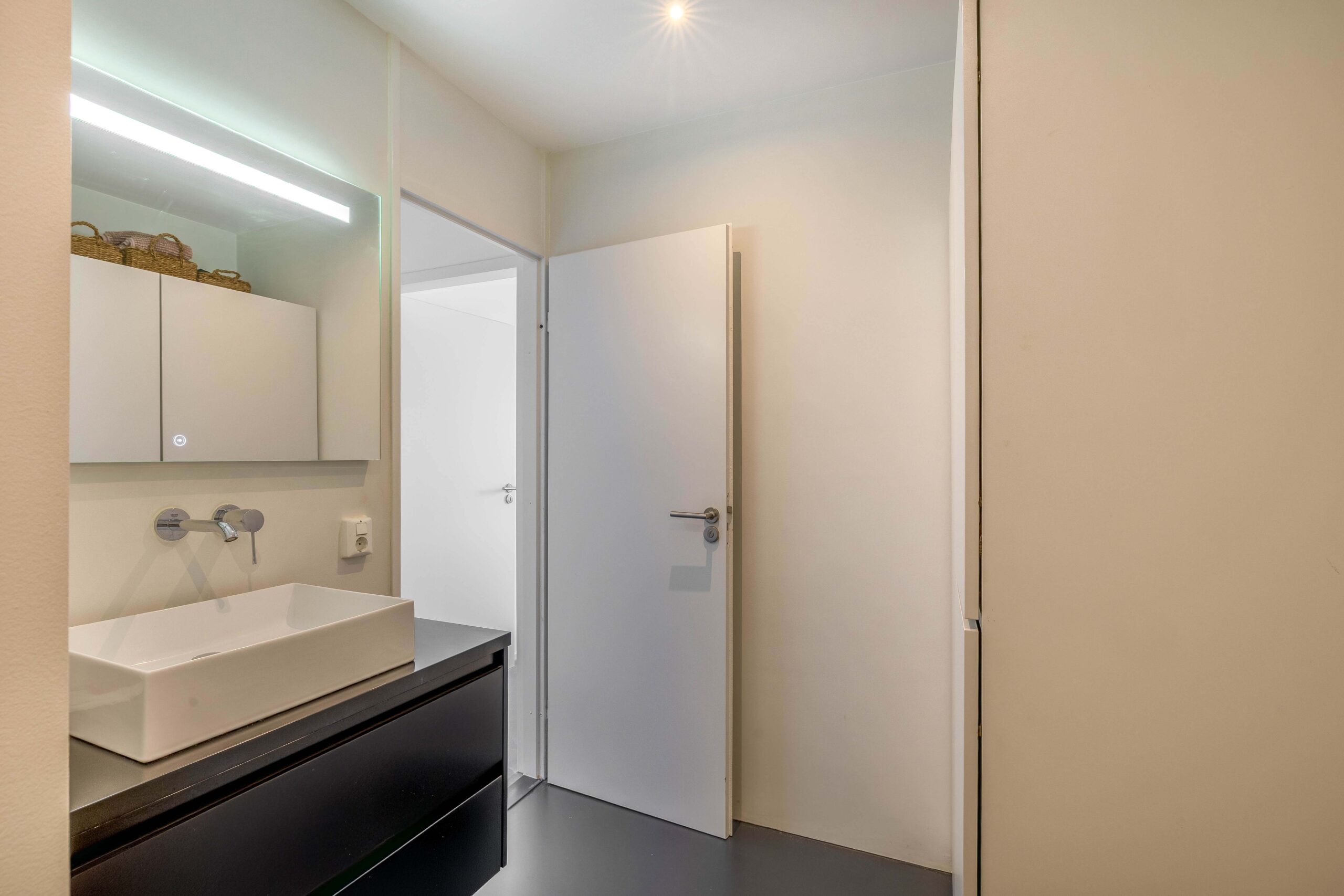Er zijn twee ruime slaapkamers (waarvan één met vaste kastenwand), een moderne badkamer met wastafelmeubel, inloopdouche en witgoedaansluiting (de wasmachine en droger staan netjes weggewerkt in een fraaie kast) en een aparte toiletruimte met fontein.
