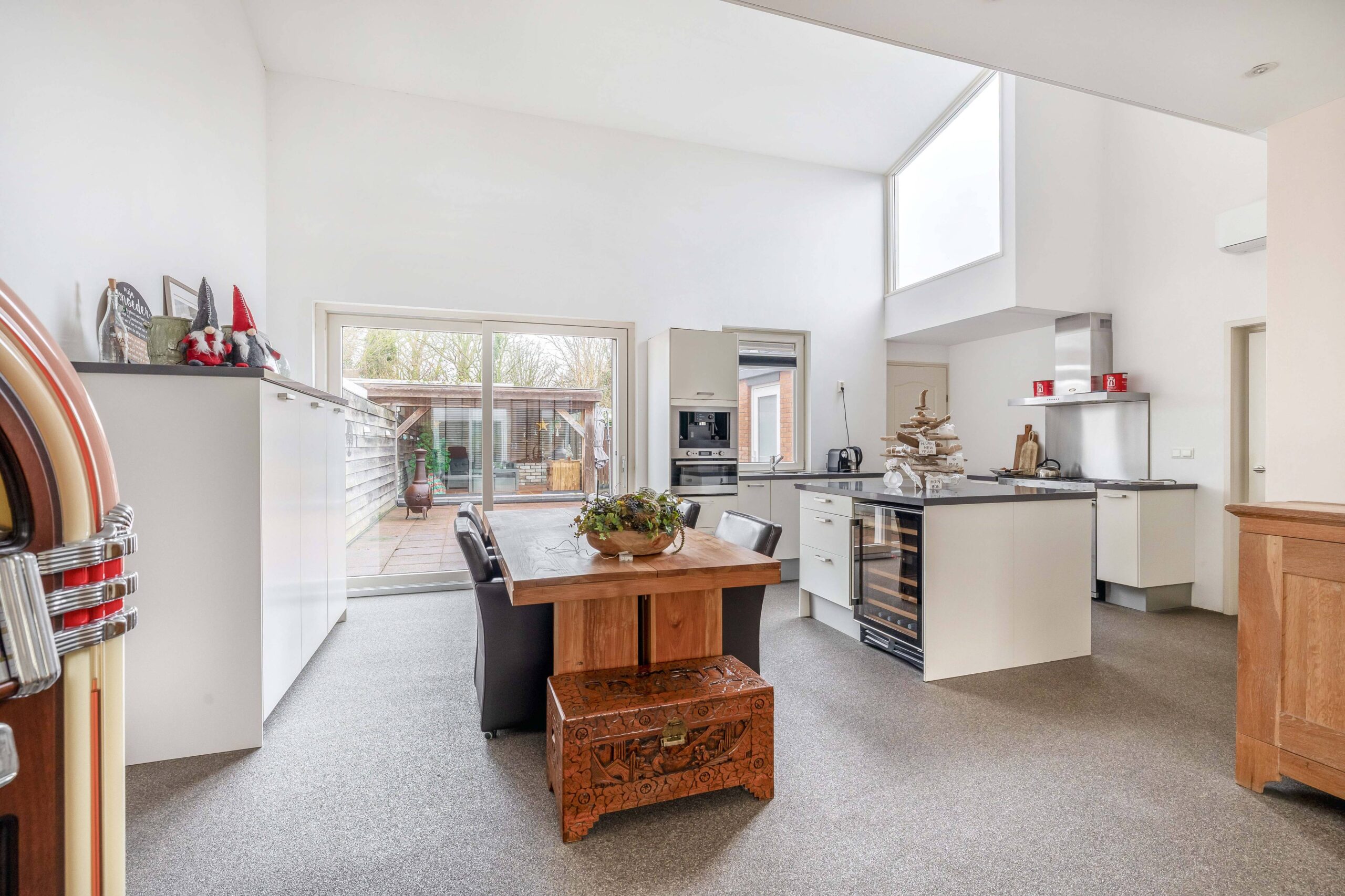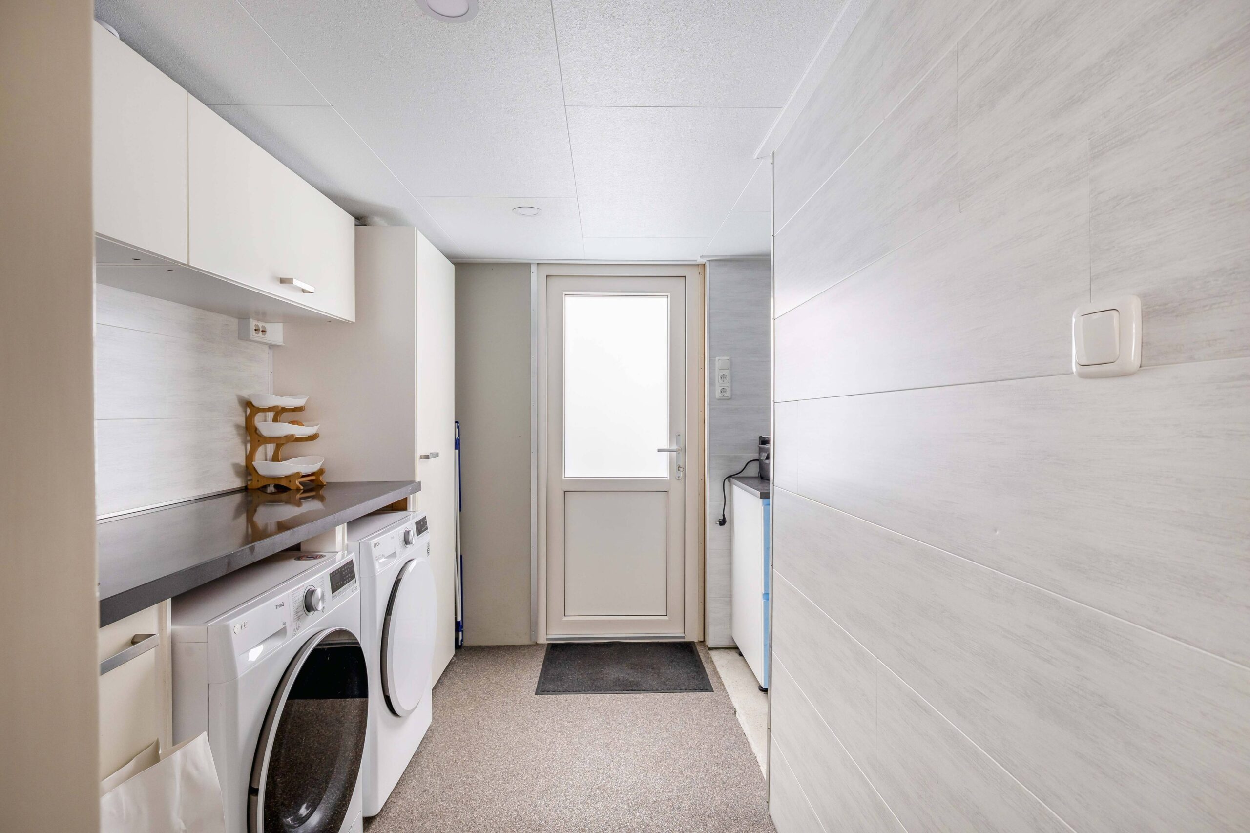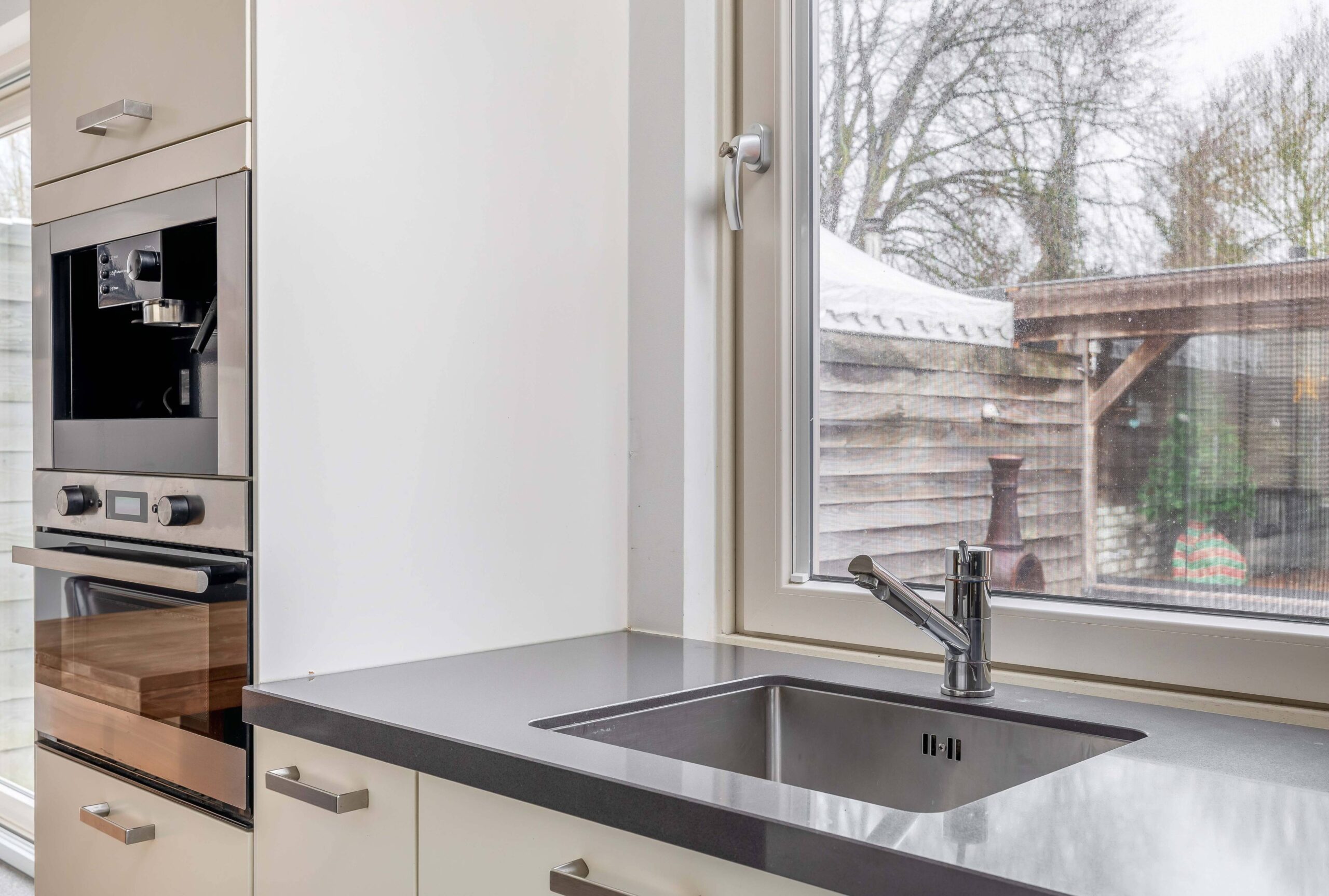 Bijkeuken met keukenblok en opstelling van het witgoed. Alles netjes weggewerkt. Kast met opstelling van de CV ketel (’23). Deur naar de tuin en de praktijkruimte/voormalige garage. Deze is voorzien van voorzetwanden, kunststof pui en deur en dakisolatie.